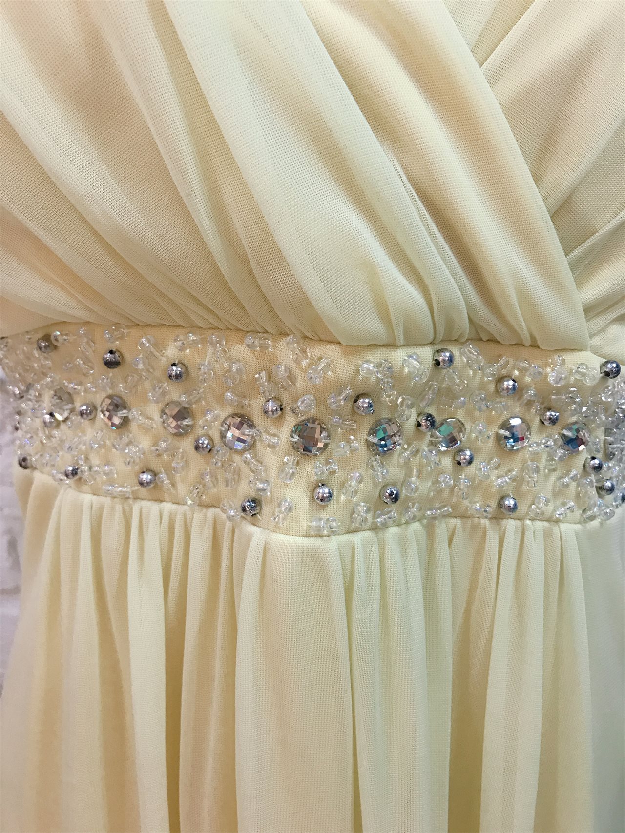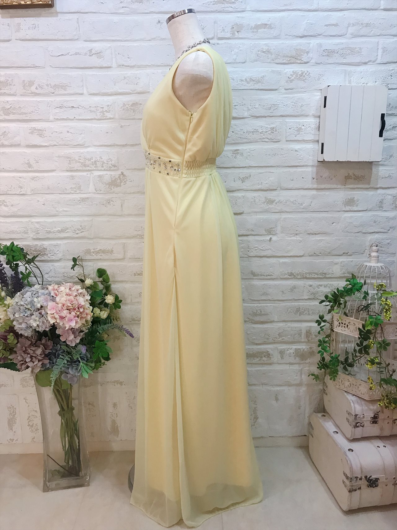 パステルイエロー肩ありロングドレス。ウェストのビジュが可愛いドレス。