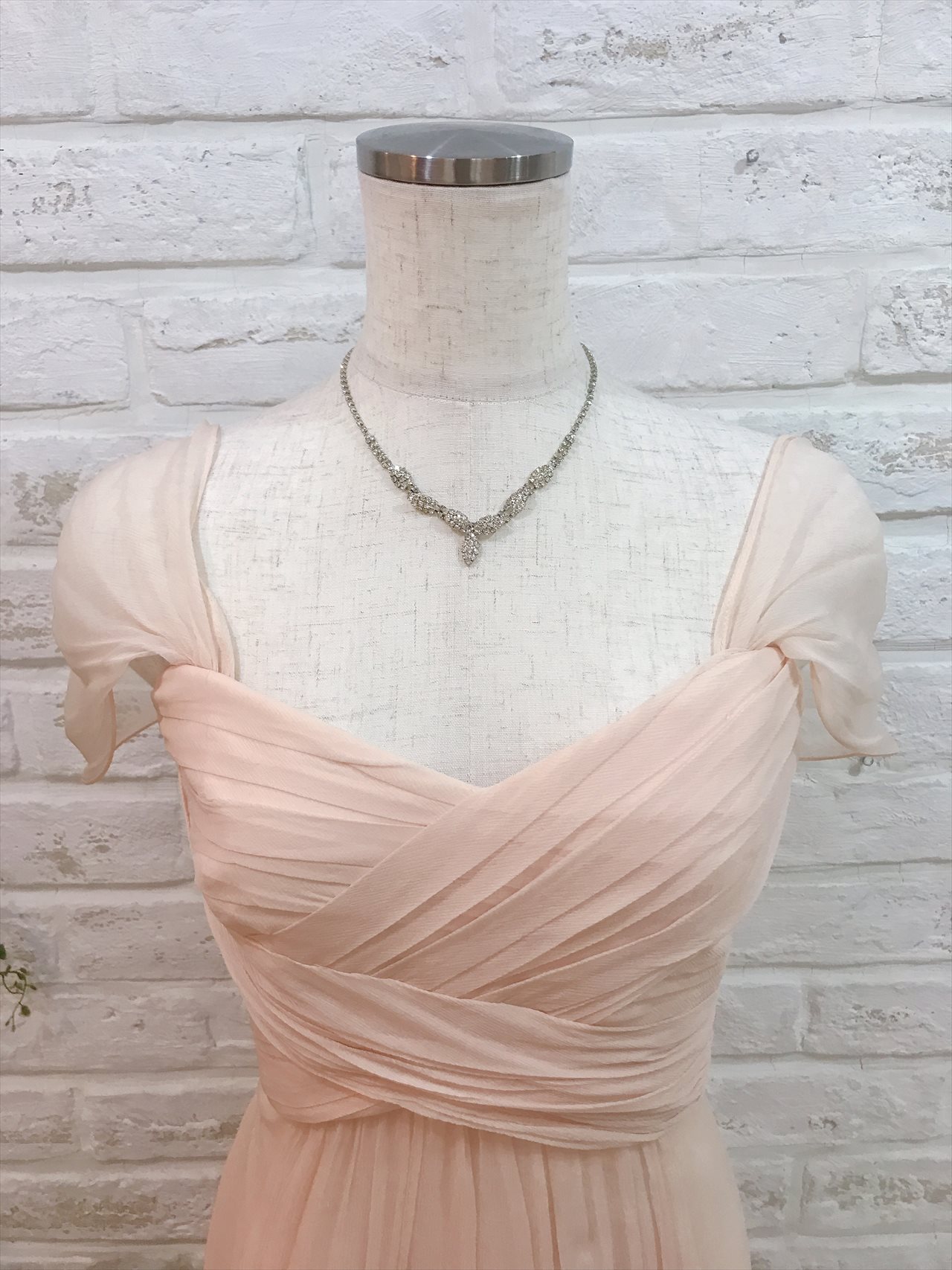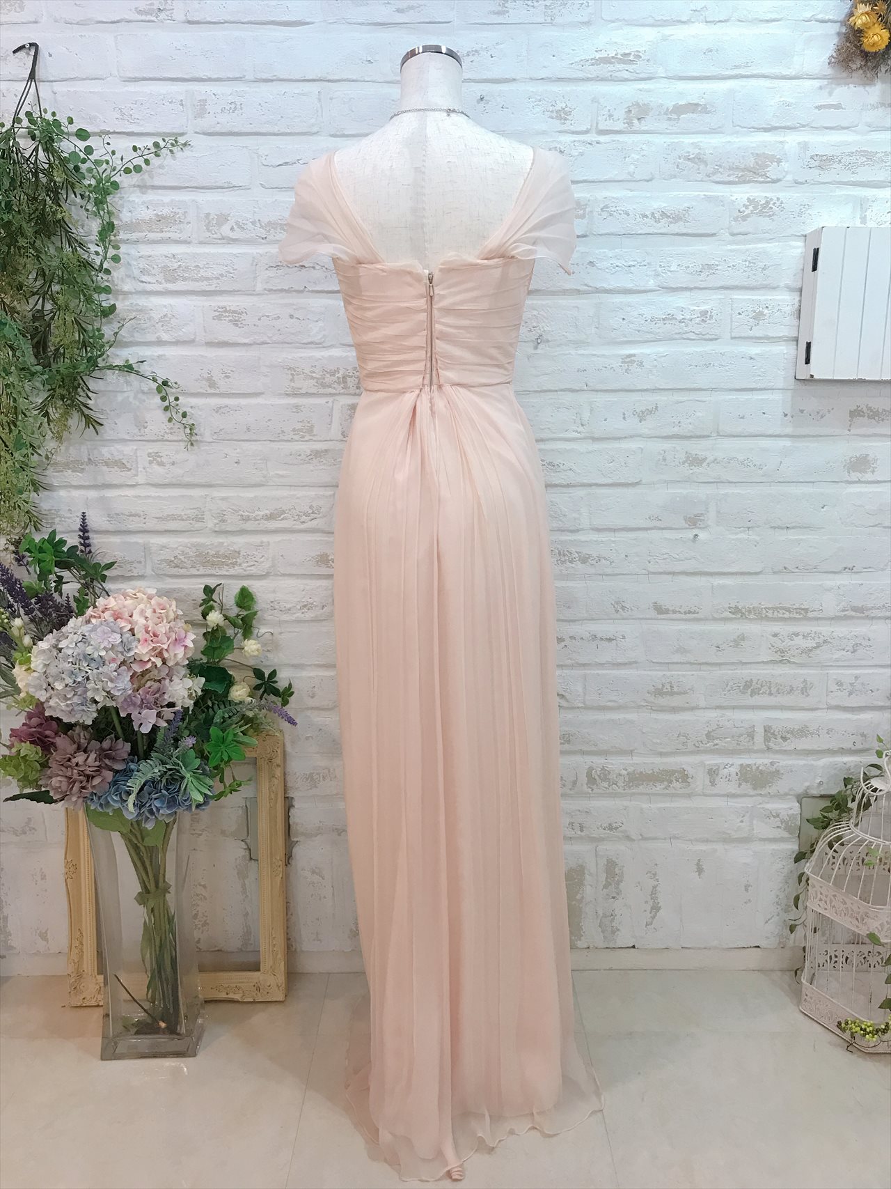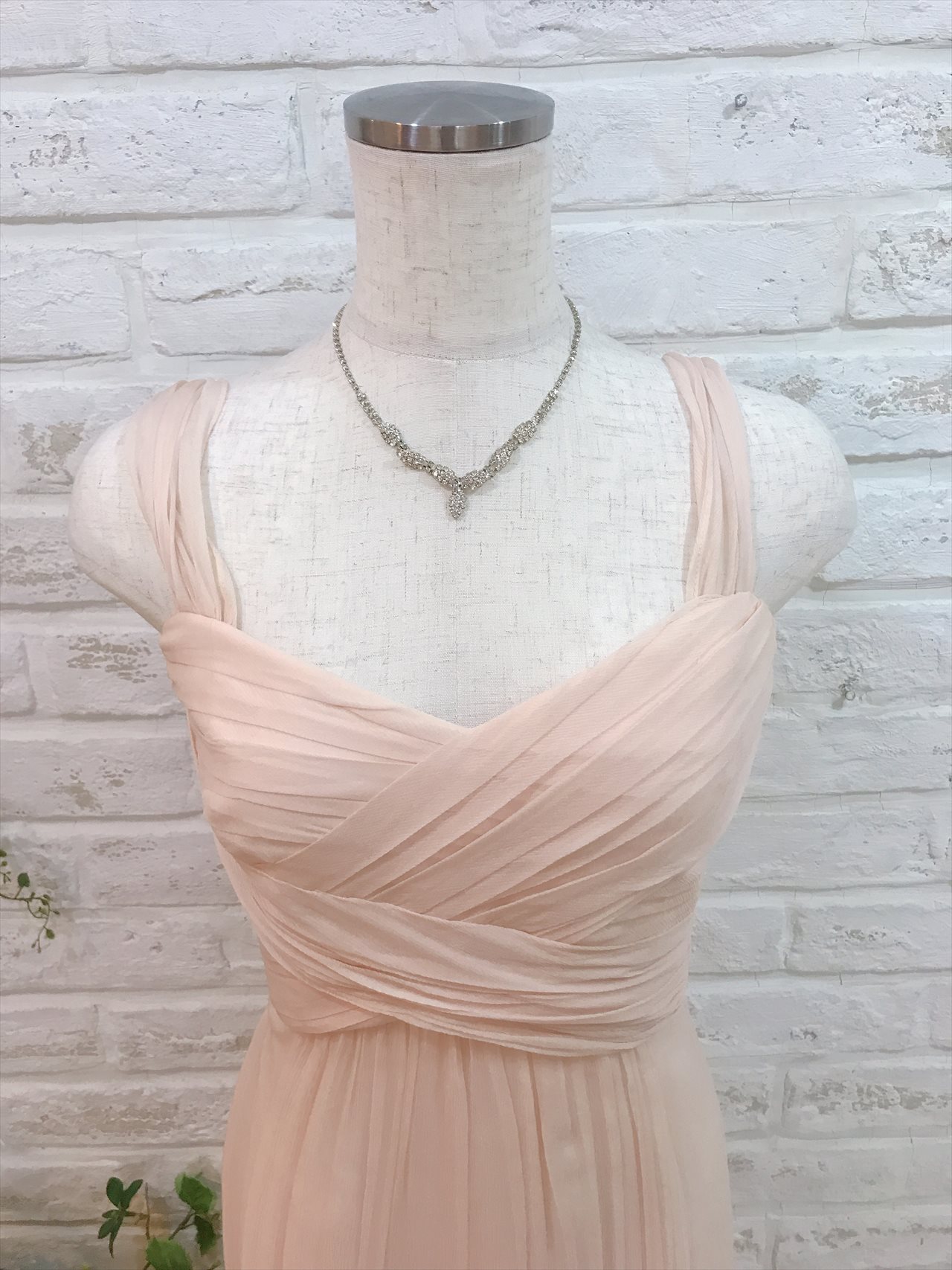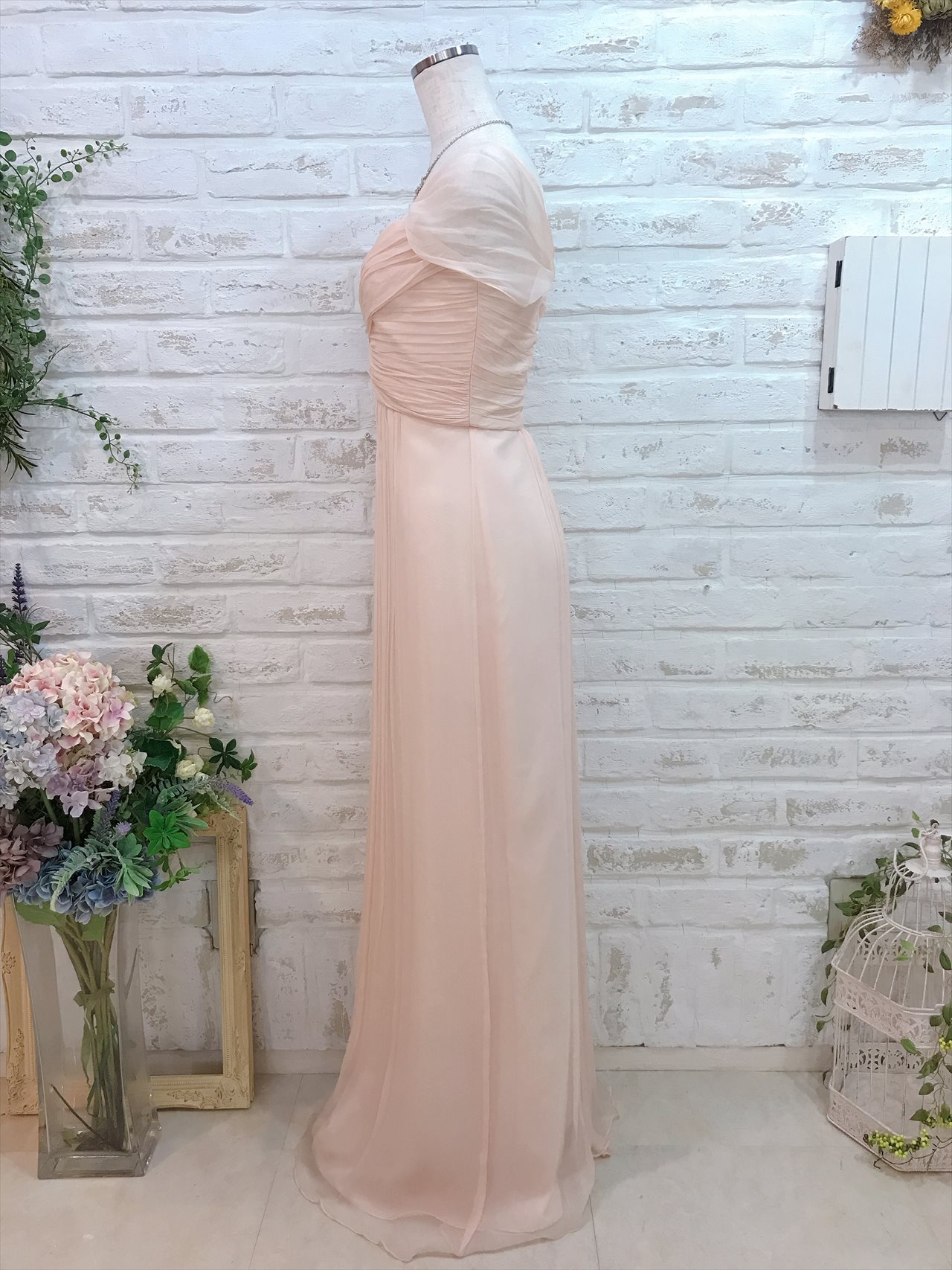 ベビーピンクのロングベアドレス。胸元のデザインがスッキリした印象になります。パーティーなどにお勧めです。