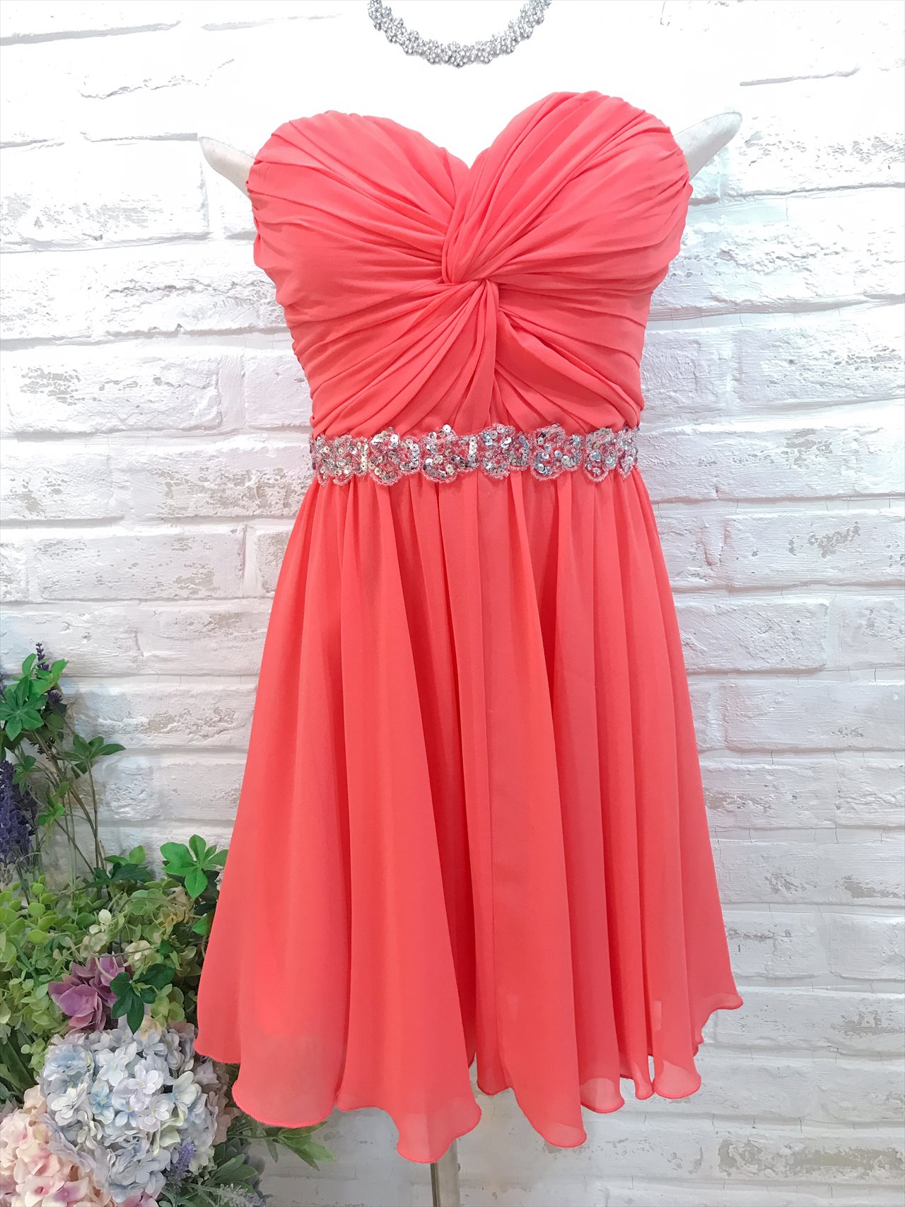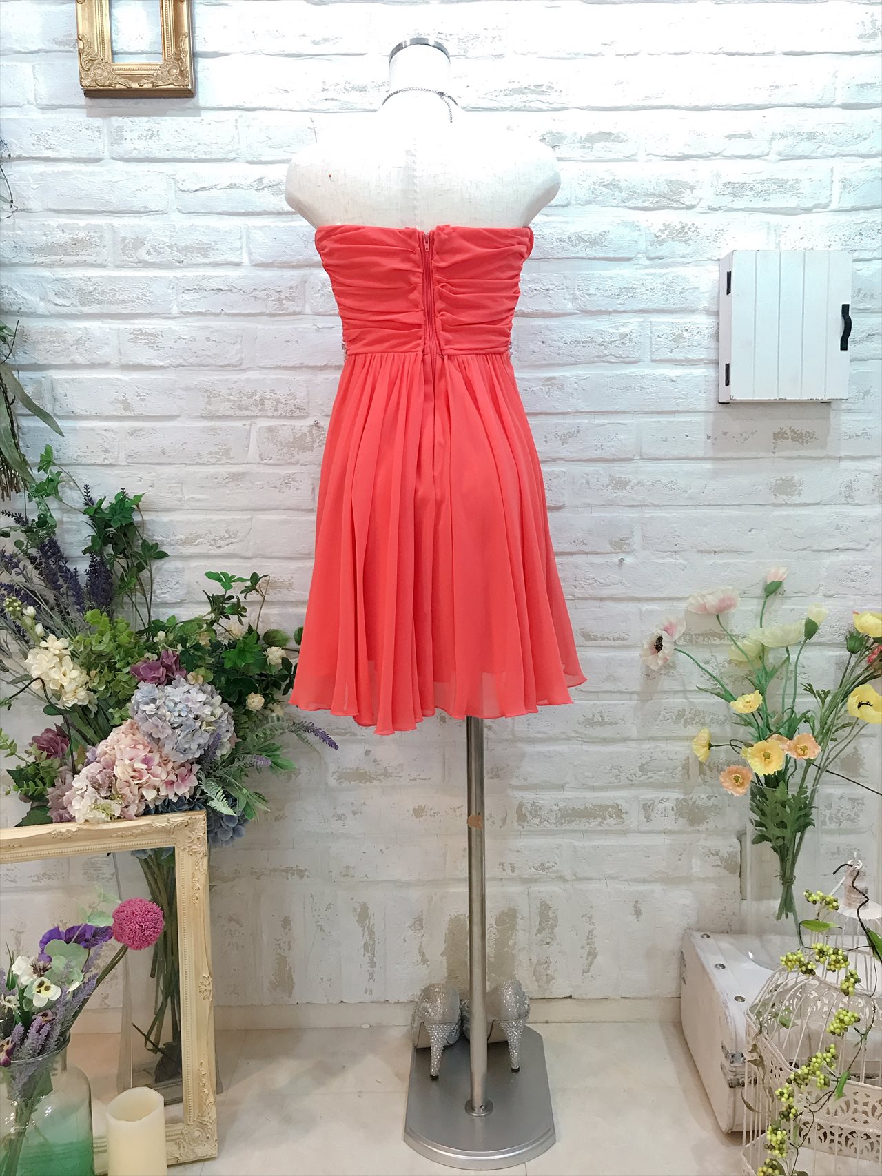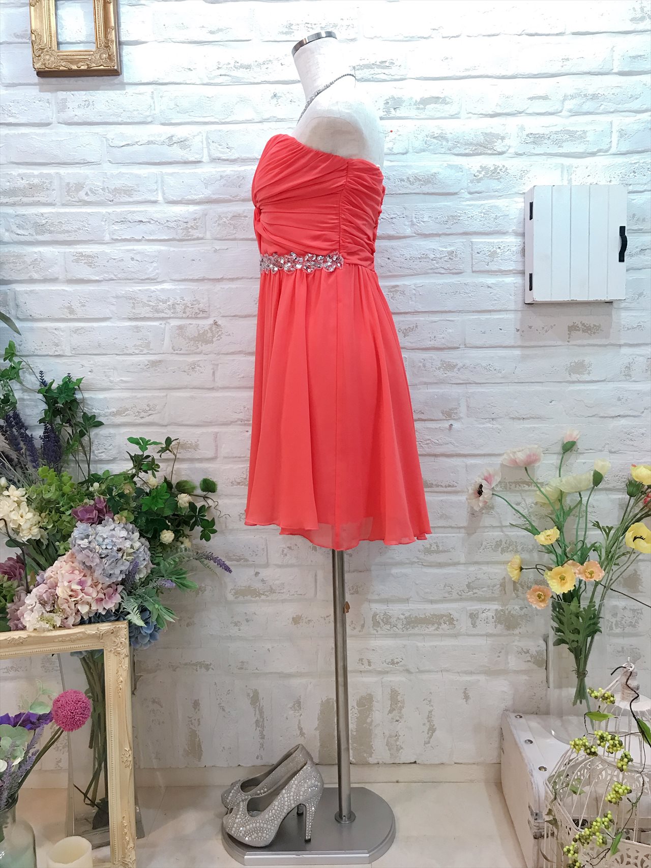 コーラルカラーがフェミニンなベアトップドレス。ひらひらとしたスカートが可憐で女性らしいデザインです。合わせるバッグ&パンプスは同系統の色彩でまとめ、明るい色合いのコーディネイトで合わせるとオシャレに着こなせます。コーラルカラーなので幅広い年代の方にお召いただけます。