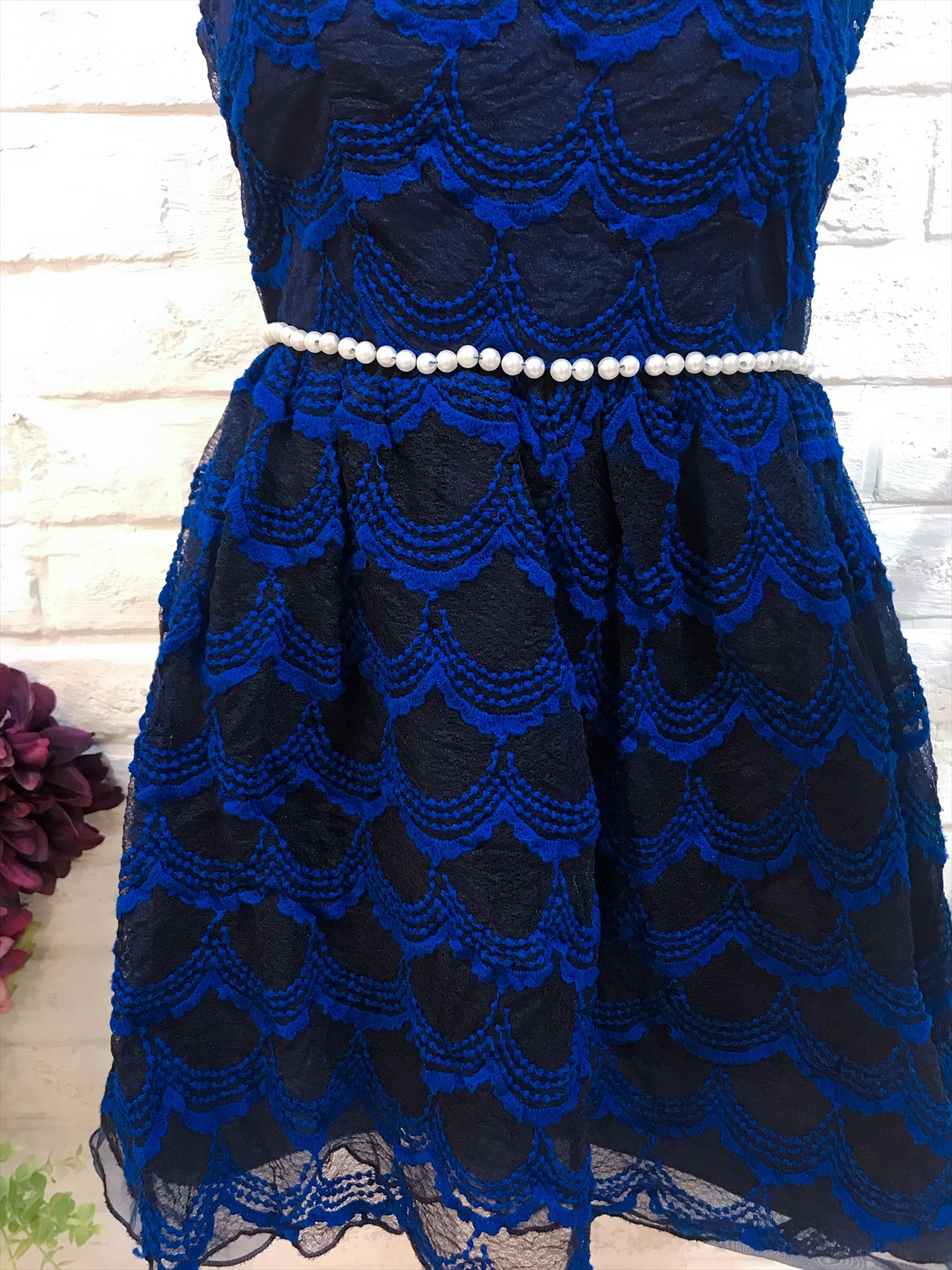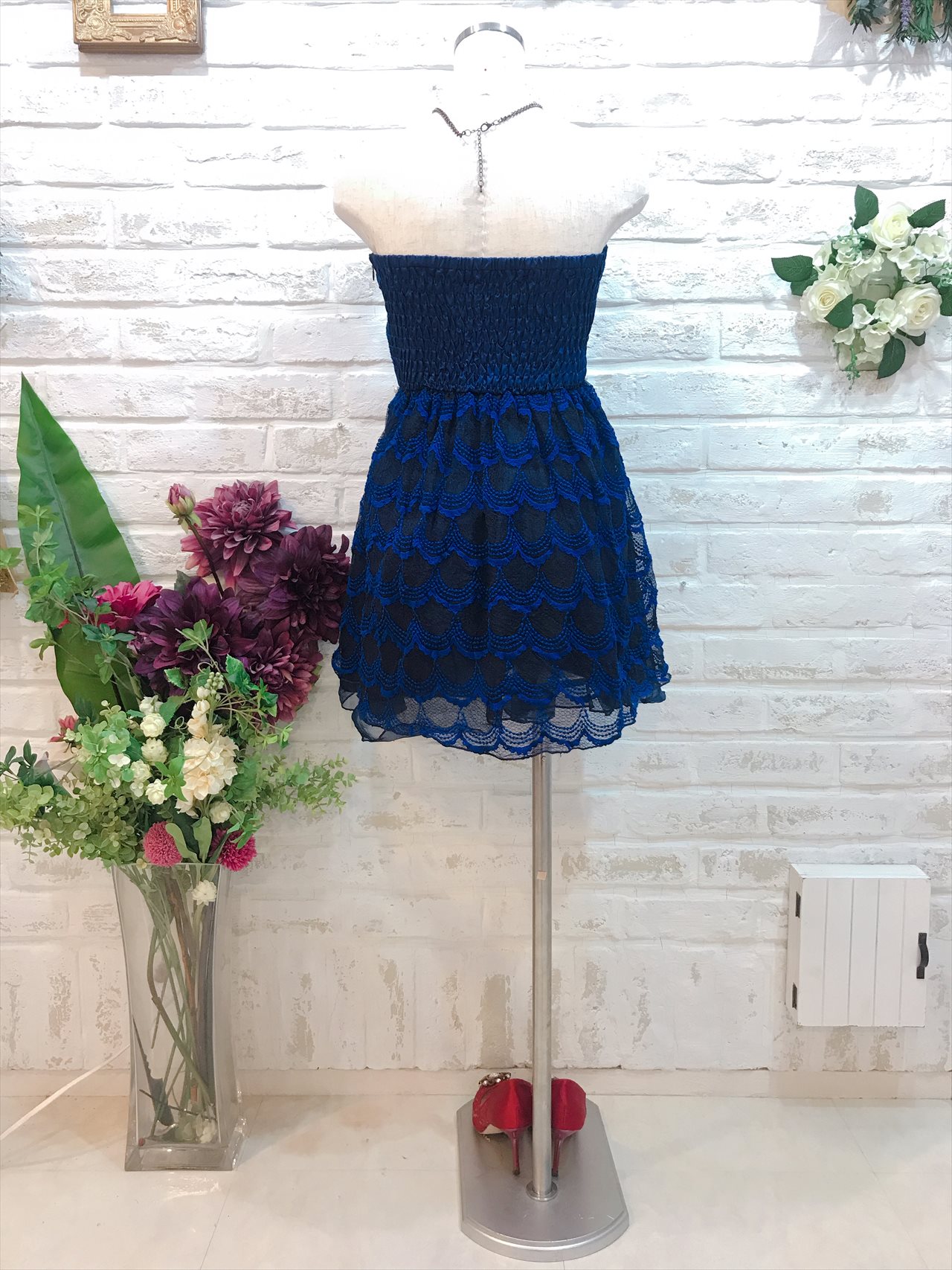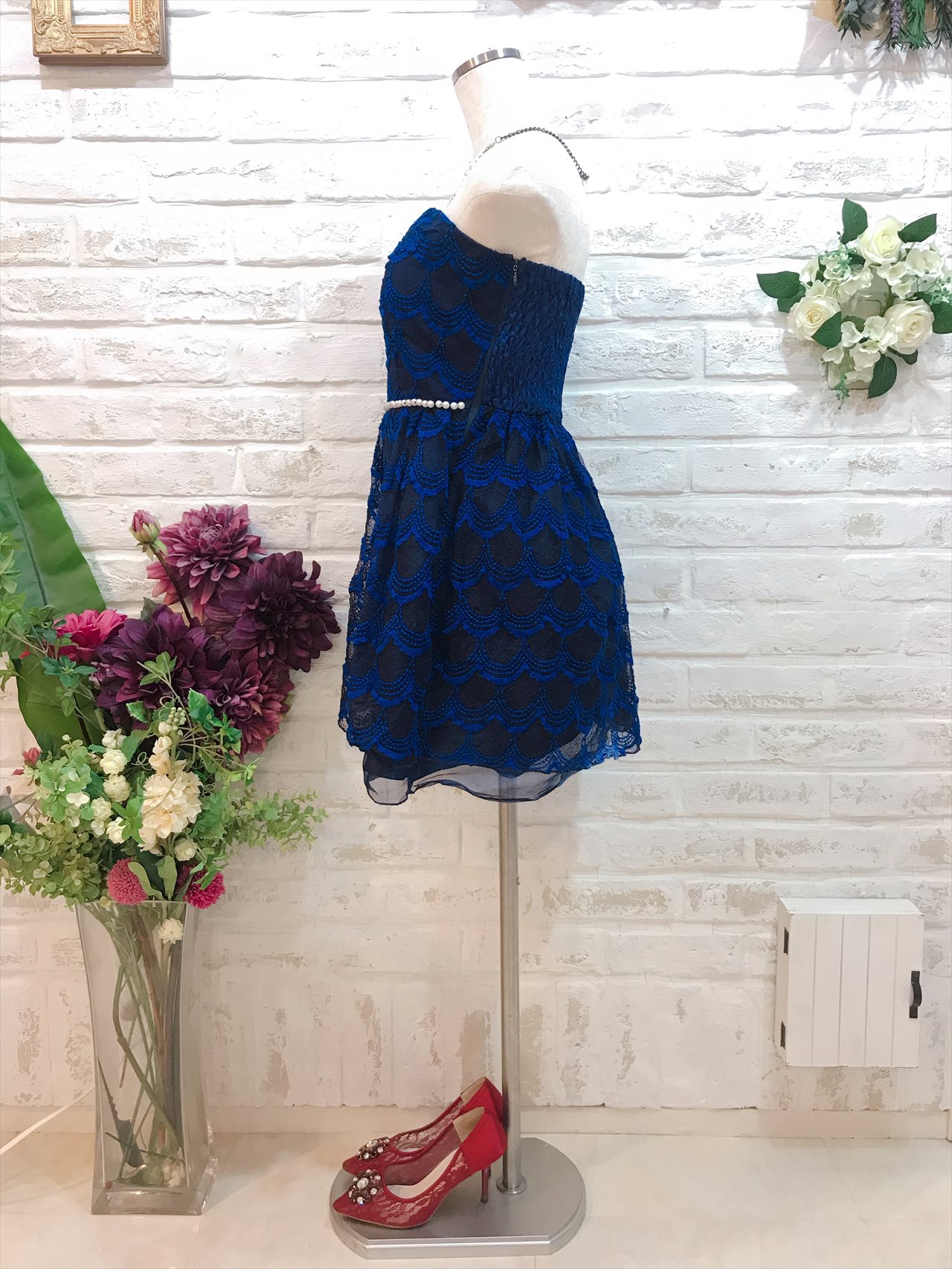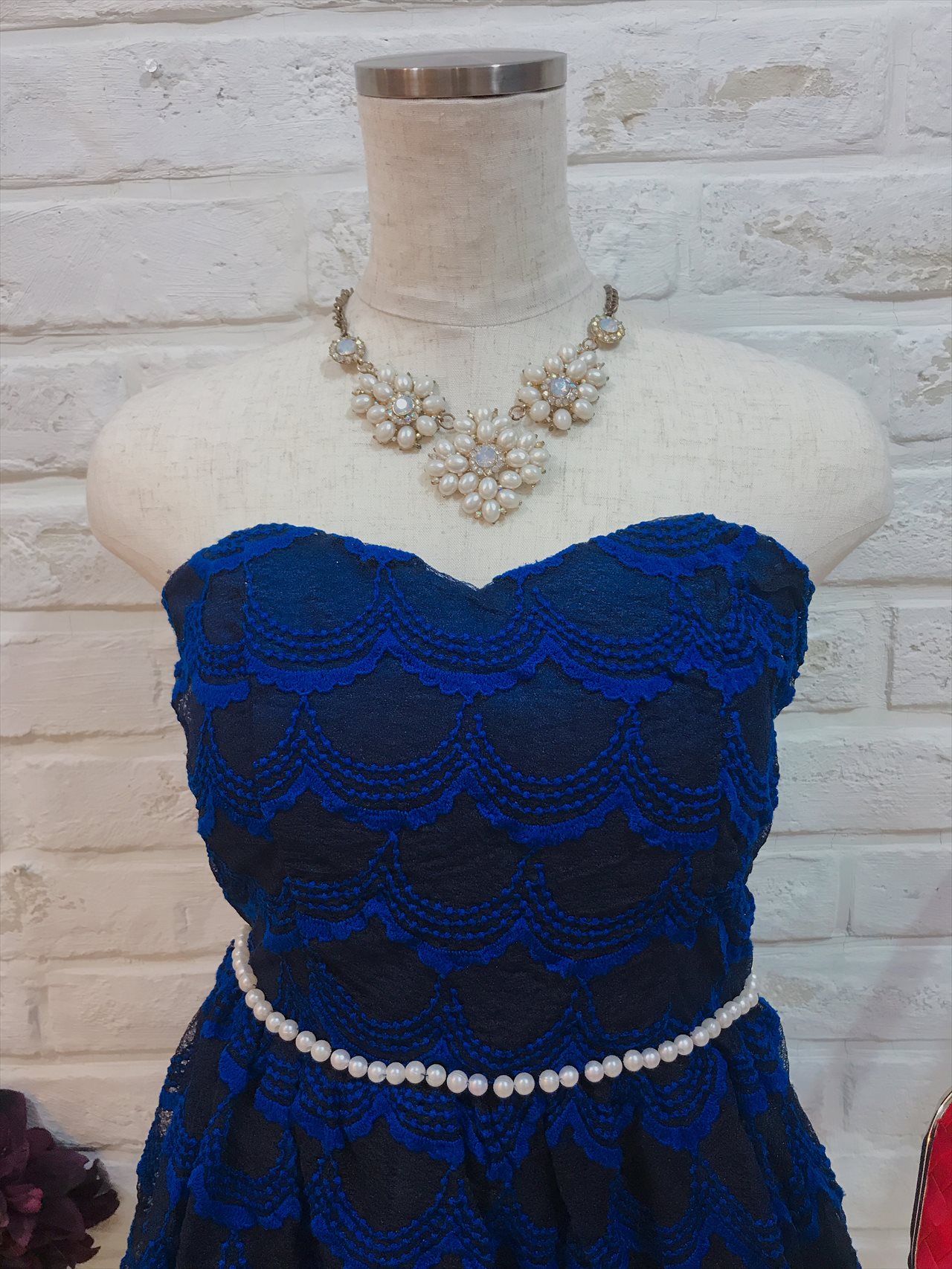 ネイビーのベアドレス。黒レース柄とウエストのパールがとても可愛いドレスです。ハイウエストでウエストが絞られているのでラインがとても綺麗です。羽織ものは黒系でもベージュ系のボレロでも合わせやすく結婚式やパーティーにお勧めです。お小物のバックには赤やピンクなどの濃い色を合わせて頂くことでドレスもお小物も映えます。