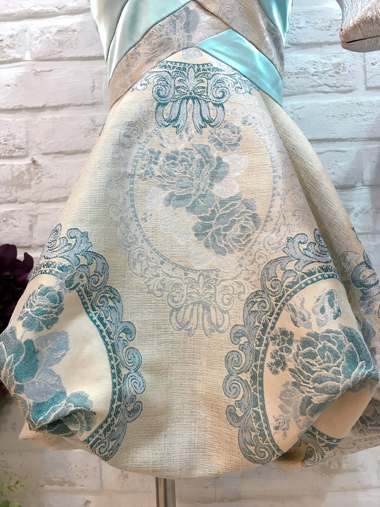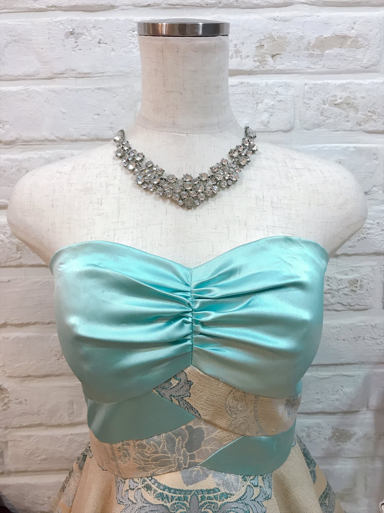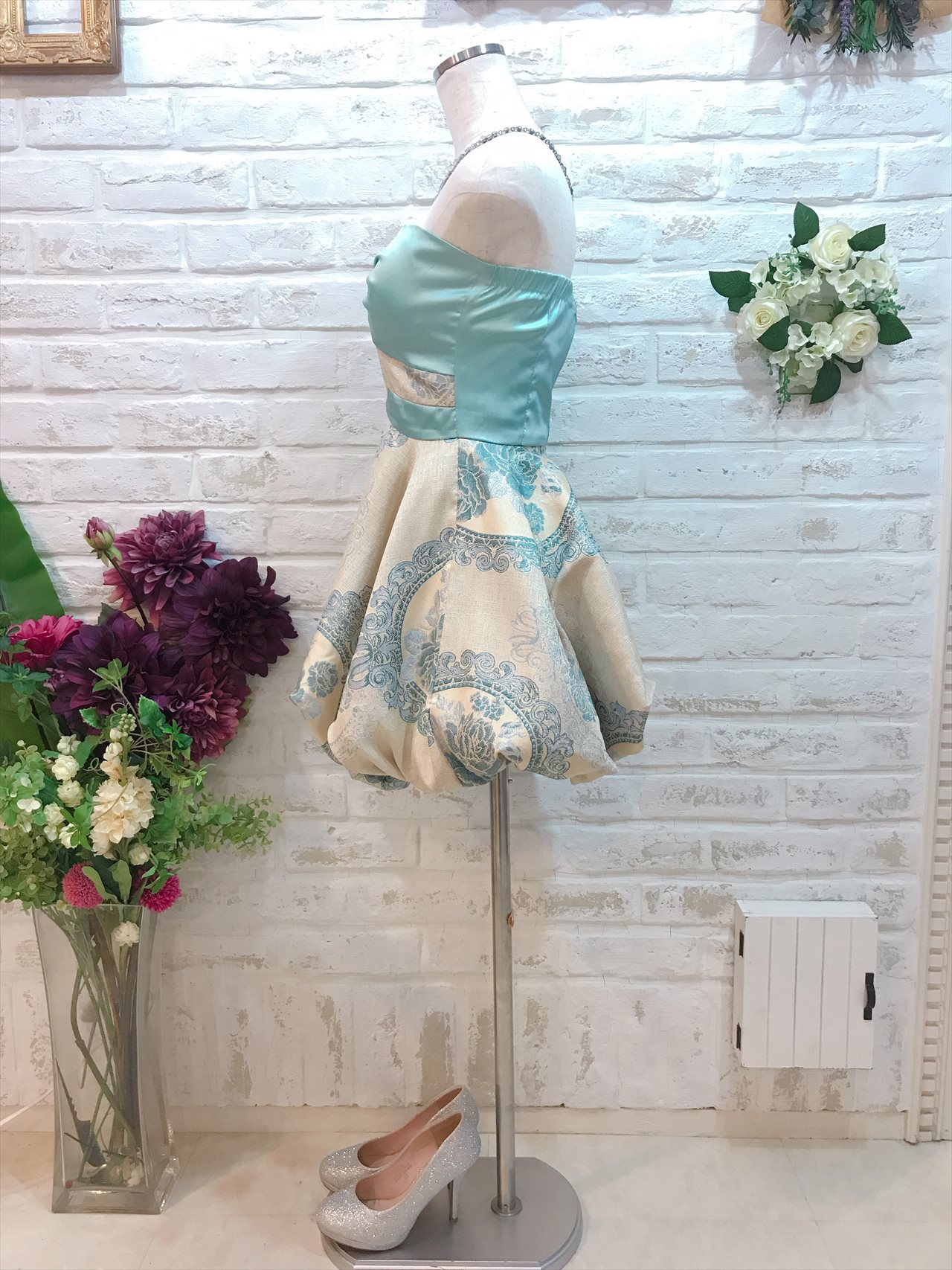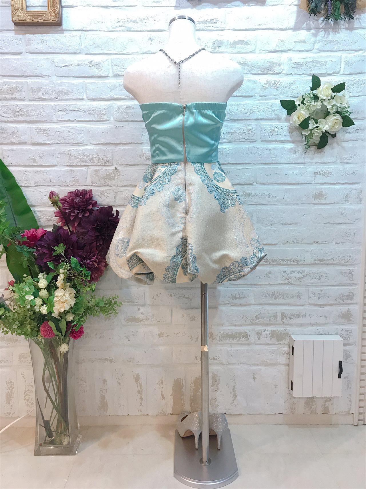 水色の和柄ベアドレス。個性的な柄が可愛い1着。とても短めのドレスなのでご身長の低めの方でもバランスよく着て頂けます。羽織ものはベージュ系のボレロやゴールド系のストールと合います。他の方とかぶらず着て頂けるドレス。自分で買うにはと迷ってしまうドレスもレンタルならではなので是非着て頂きたい1着。結婚式であればパール系のネックレスで合わせると上品なコーディネートに仕上がります。