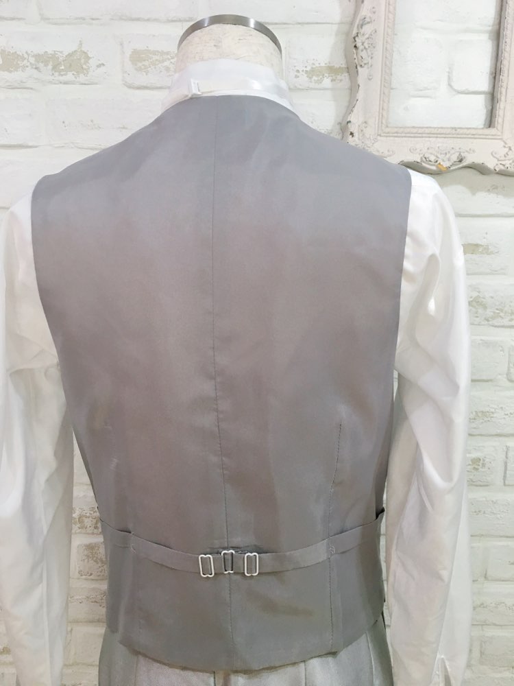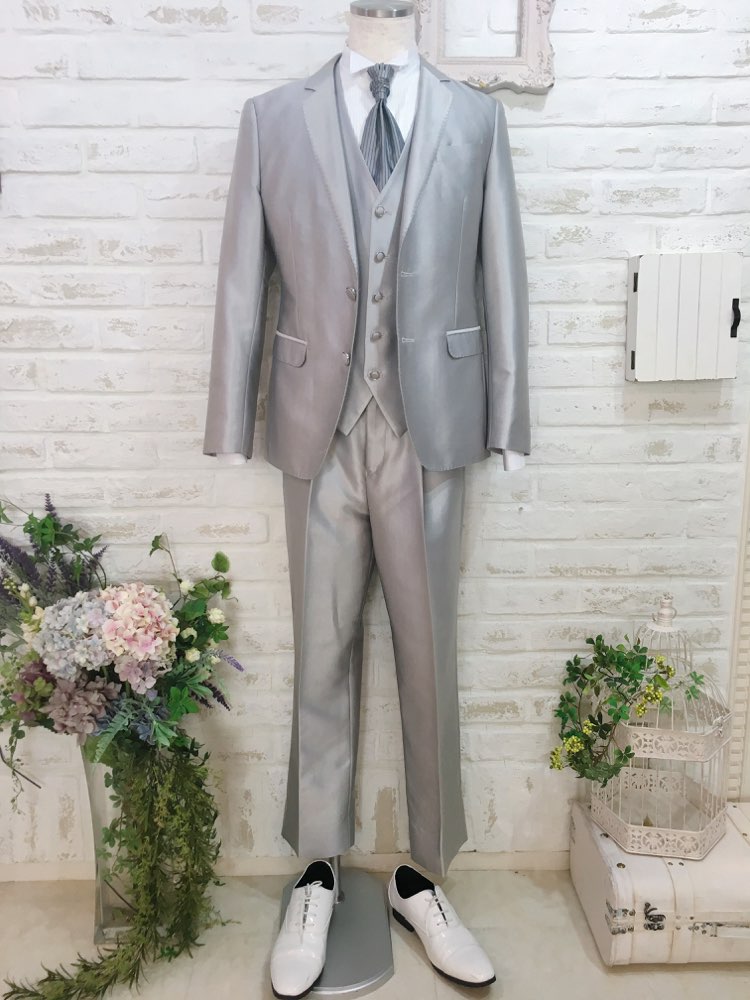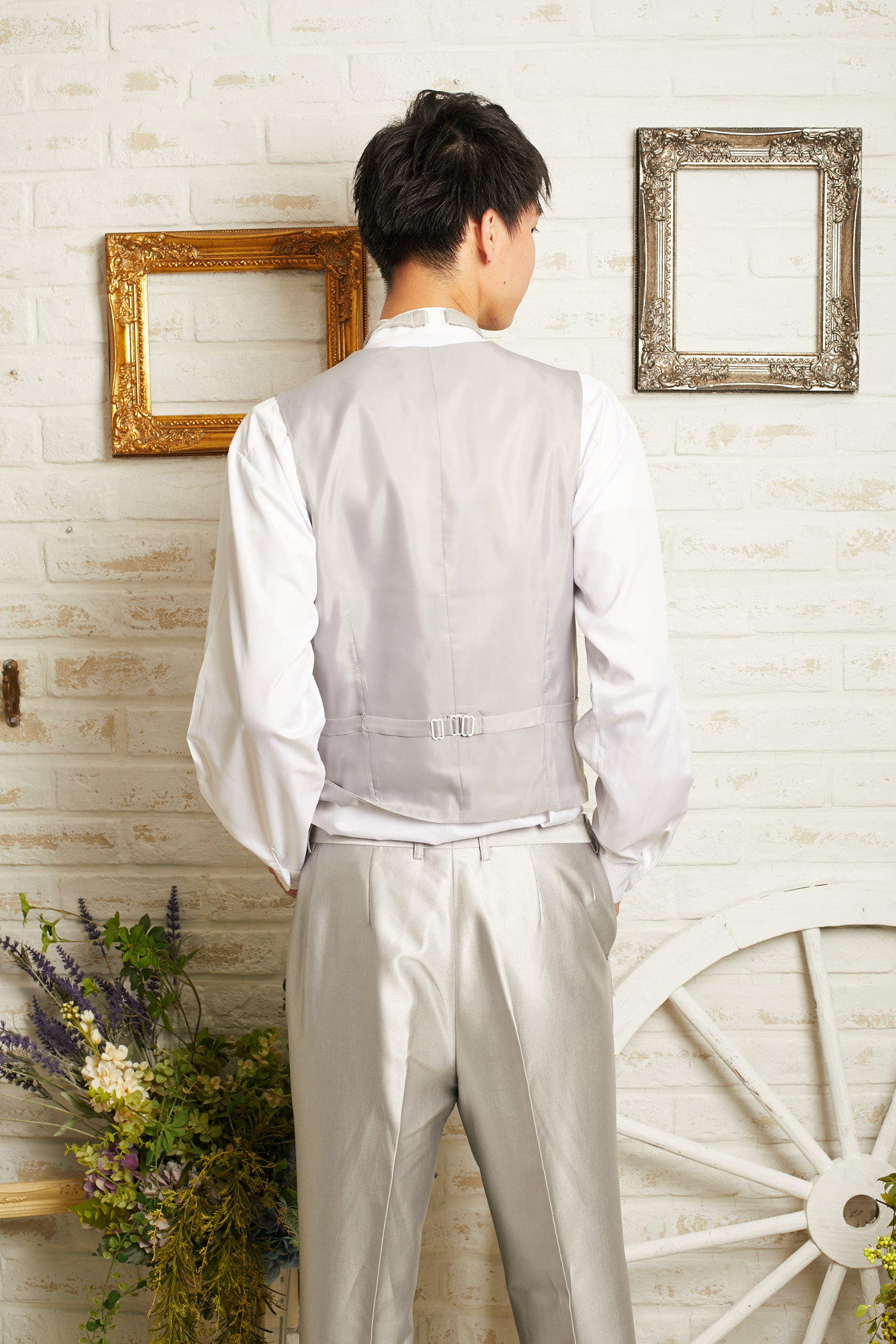 光沢感のある上品な素材のシルバーベストです。セットのジャケット、パンツと合わせれば挙式などにもお使い頂けるシンプル且つフォーマルなデザインです。前撮り写真撮影や2次会などにもおすすめです。