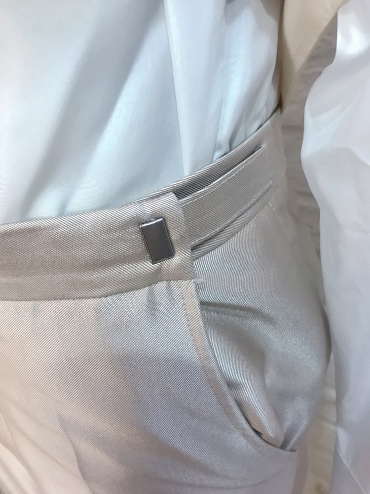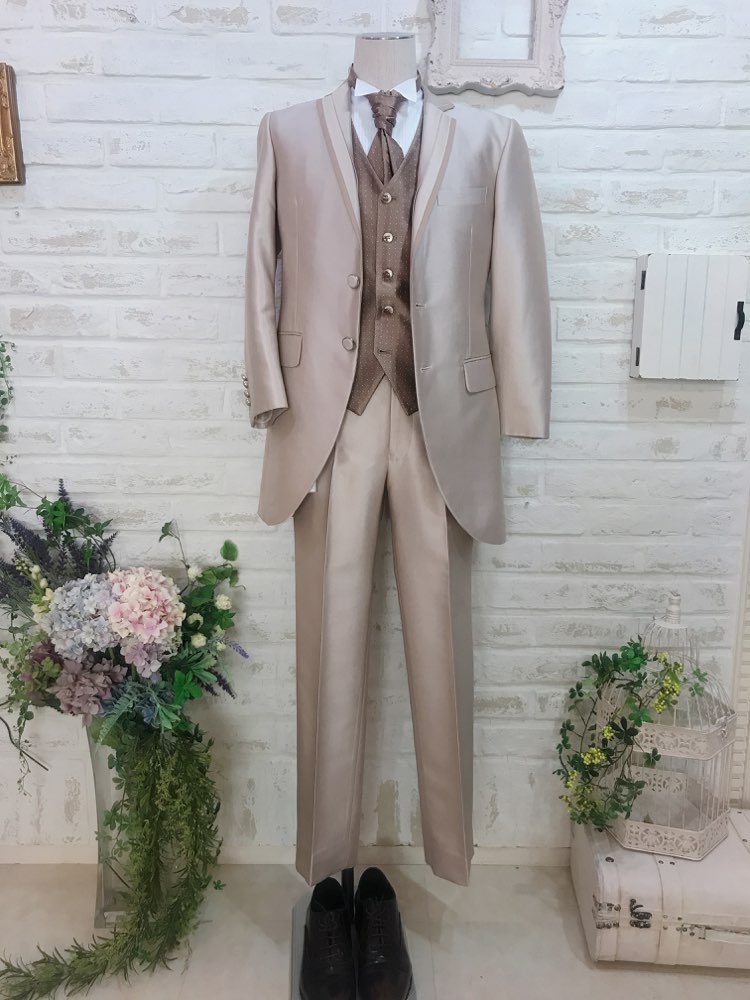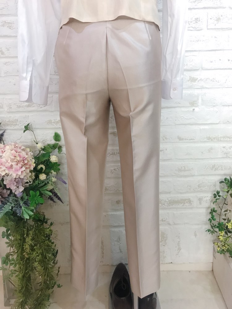 パンツは柔らかく、華やかな印象のシャンパンゴールドで光沢感のある素材です。セットのジャケット、ベスト、タイ、チーフと合わせてお使いいただく事をおすすめします。挙式、披露宴、二次会、前撮り写真撮影など幅広いシーンに。生地感はそれ程厚くないので、長時間着ていても負担は少ないと思います。パンツウェストにはアジャスター付きなので、お客様の丁度いいサイズに合わせる事が可能。