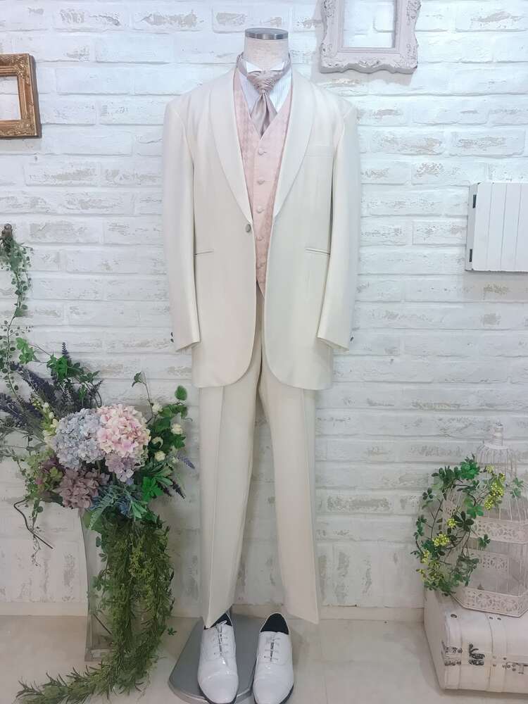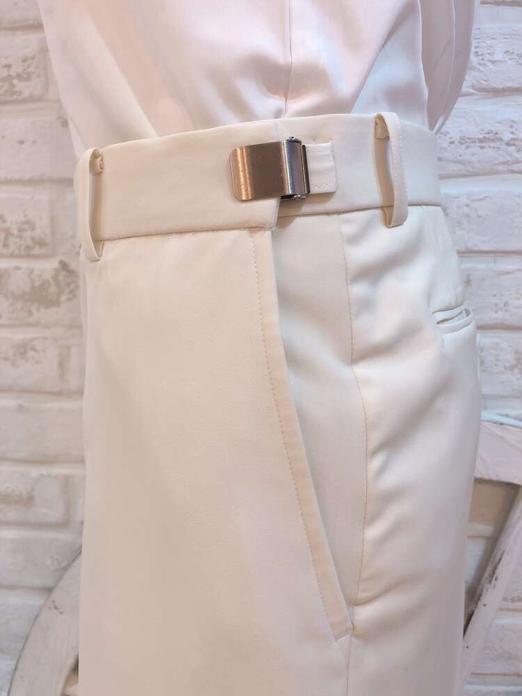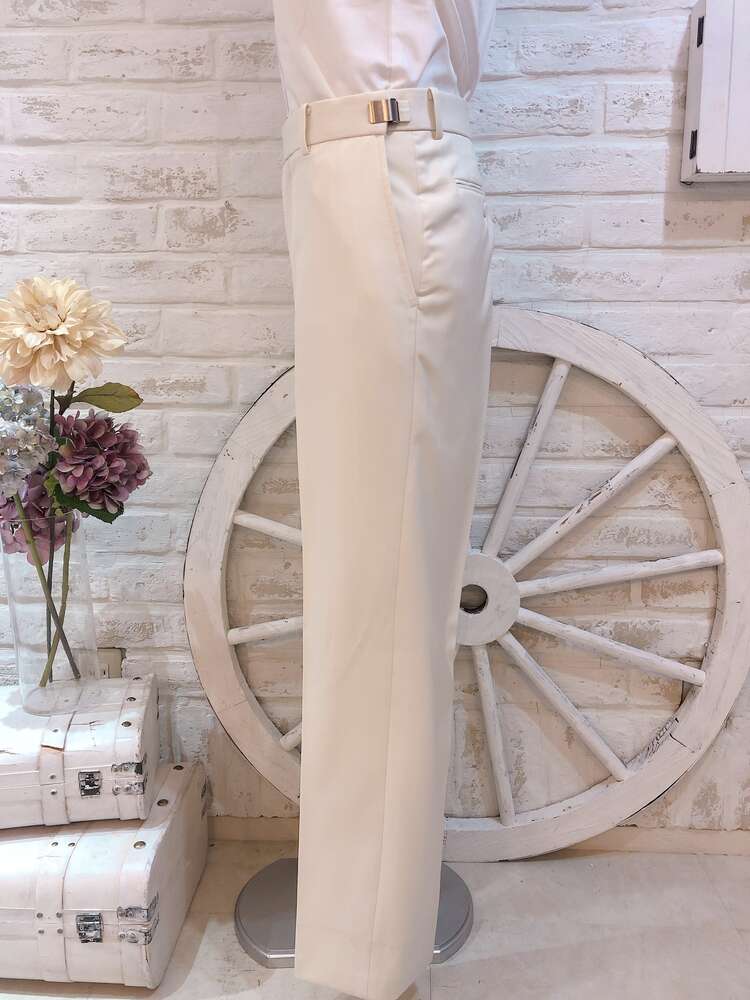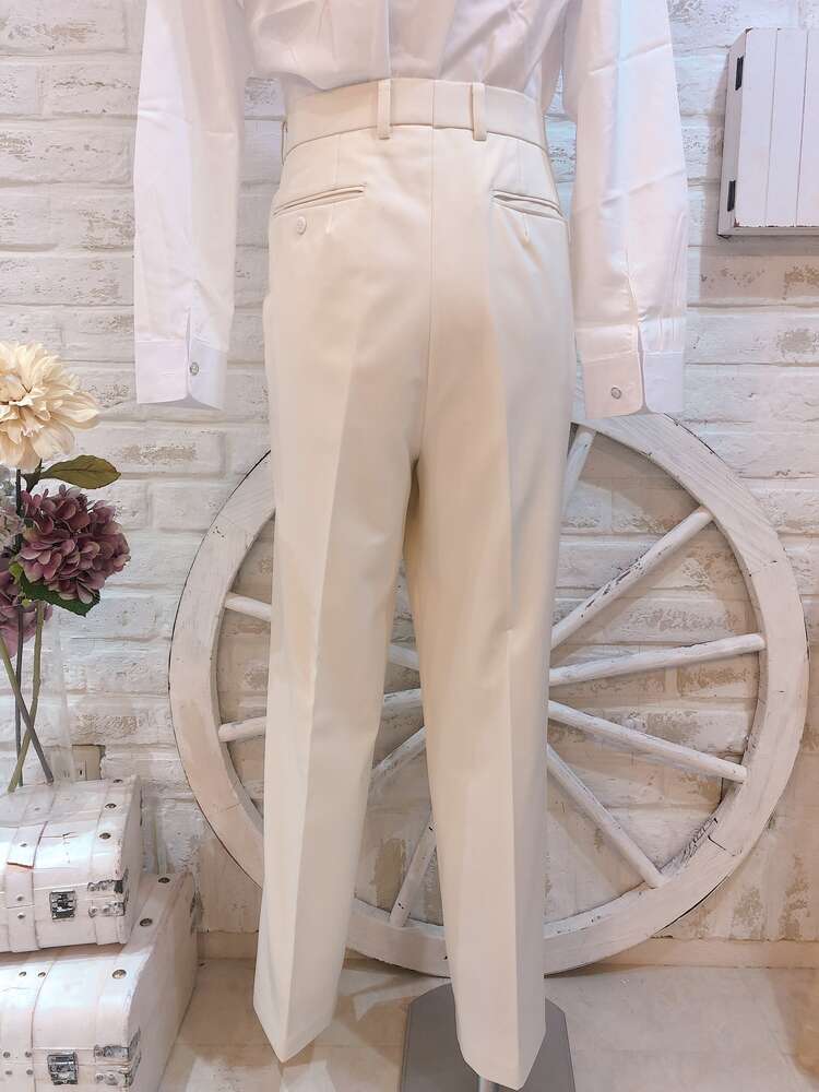パンツはオフホワイトでマット感のある素材です。セットのジャケットと合わせれば挙式などにもお使い頂けるデザインとなっておりますので、前撮り写真撮影にもおすすめです。生地感はそれ程厚くないので、長時間着ていても負担は少ないと思います。パンツウェストにはアジャスター付きなので、お客様の丁度いいサイズに合わせる事が可能。