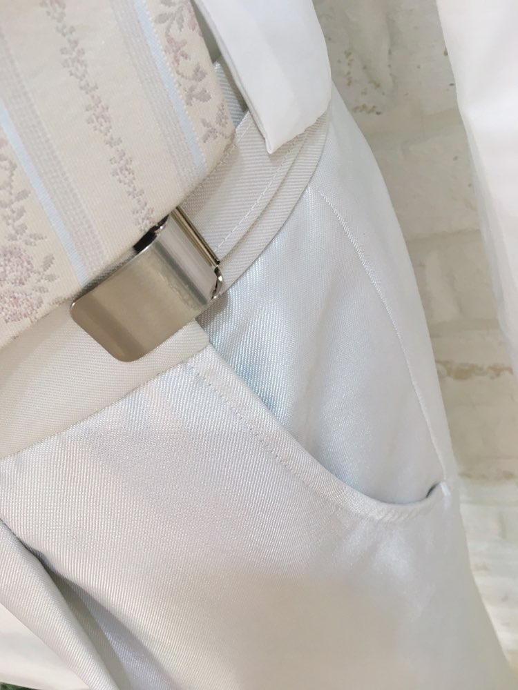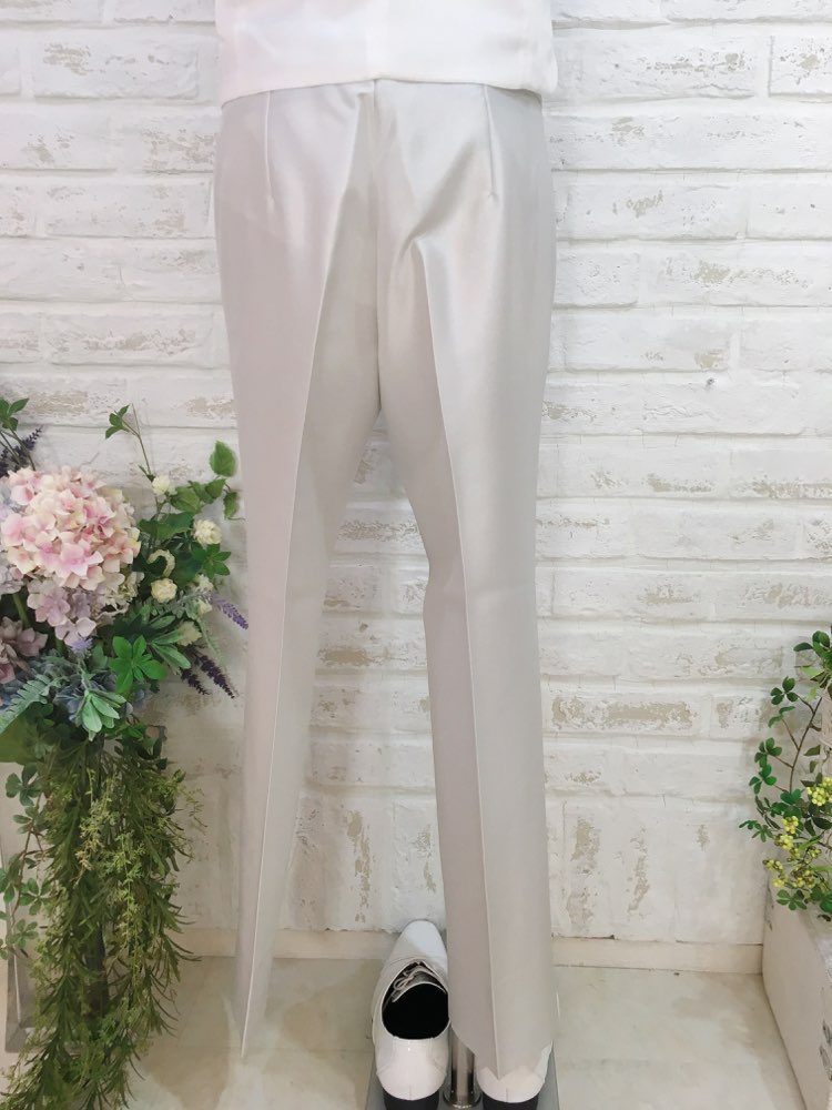 パンツはライトシルバーで光沢感のある上品な素材です。セットのジャケットと合わせれば挙式などにもお使い頂けるデザインとなっておりますので、前撮り写真撮影にもおすすめです。生地感はそれ程厚くないので、長時間着ていても負担は少ないと思います。パンツウェストにはアジャスター付きなので、お客様の丁度いいサイズに合わせる事が可能。