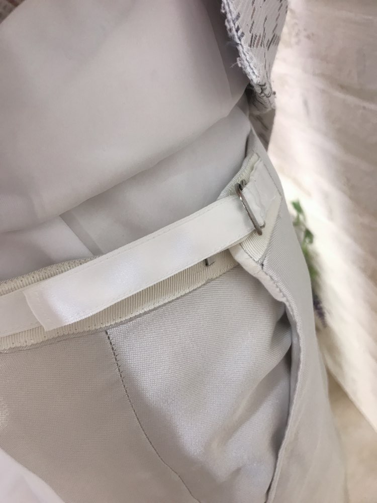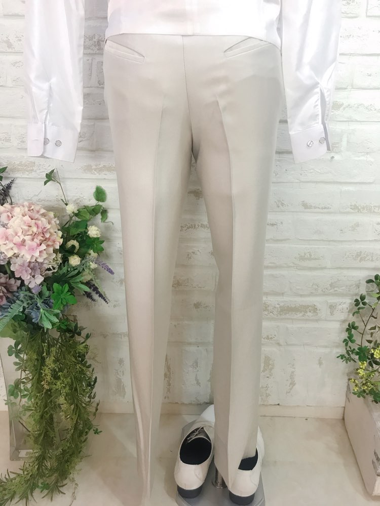 パンツはライトシルバーで光沢感のある上品な素材です。セットのジャケットと合わせれば挙式などにもお使い頂けるデザインとなっておりますので、前撮り写真撮影にもおすすめです。生地感はそれ程厚くないので、長時間着ていても負担は少ないと思います。パンツウェストにはアジャスター付きなので、お客様の丁度いいサイズに合わせる事が可能。