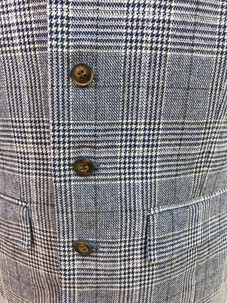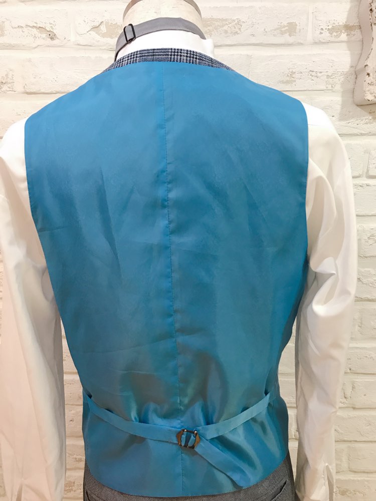 グレー地×チェック柄ベスト。背面は爽やかなライトブルーです。夏のリゾートウェデングやクルーズパーティー、1.5次会など各種パーティーにおすすめの1着。ジャケットを羽織らず背中を見せるスタイルがおすすめ。