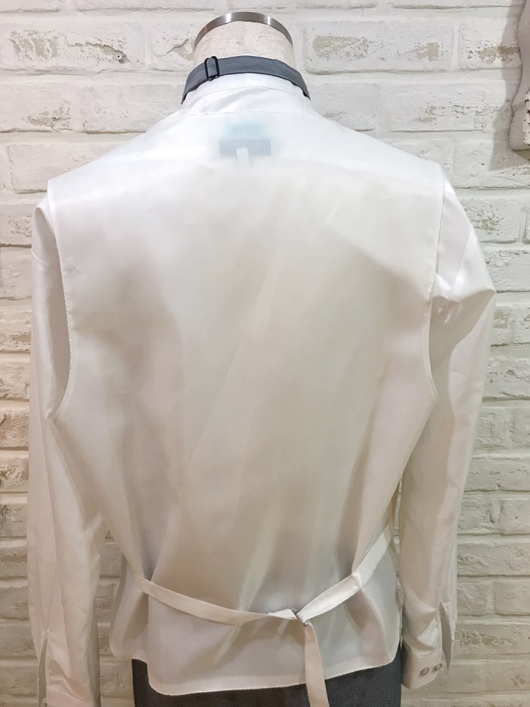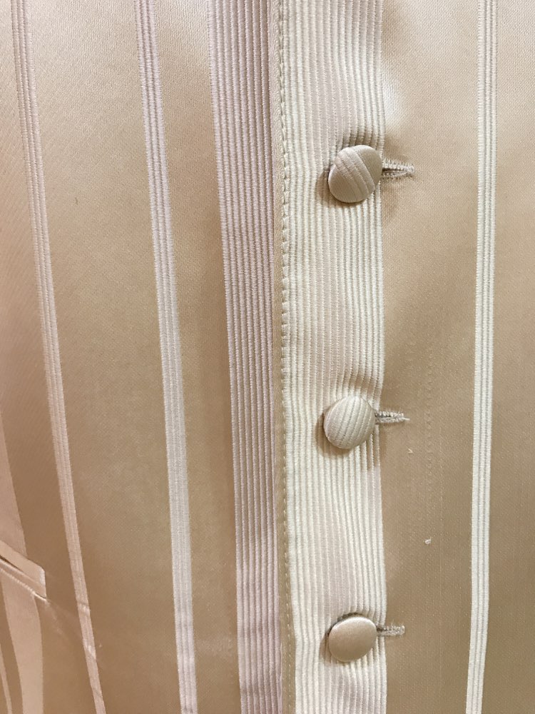 つるっとした肌触りのゴールドベージュ×ストライプのベスト。程良い光沢感が上品で大人っぽい印象の一枚。セットのタイと合わせてお使い頂くとよりお洒落にまとまります。レストランウェディングや前撮り撮影、授賞式など幅広いシーンに。タグの表記はMサイズですが大きめのつくりなので