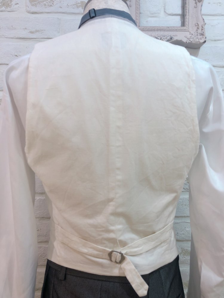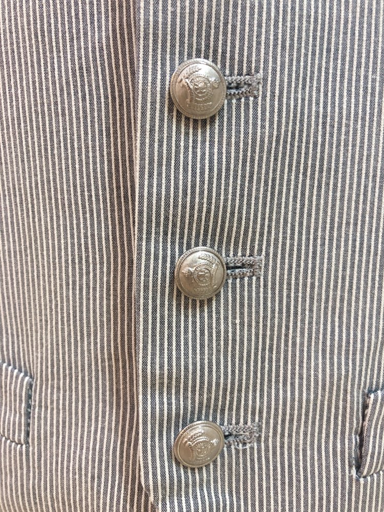 ライトグレーの細かなストライプ柄のオールシーズン向けのベスト。シルバーの紋章入りの金属ボタンがオシャレ。このベストは単品の展開です。ネイビー、グレー、ホワイト、ブラック、ピンク、ライトブルー、グリーン、ボルドーなど無地のジャケットやシャツ、パンツはホワイトデニムや、グレー、ブラック、ネイビーの無地パンツでも合わせやすい万能なストライプベストです。裏地はオフホワイトのコットン混素材。また白のウィングカラーシャツを合わせればきちんとした結婚式や披露宴向けのフォーマルなコーディネートになります。披露宴・結婚式・ゲスト/結婚式の参列にも。パーティースーツ・二次会・海外ウェディング・フォトウェディング、前撮りにまで幅広いシーンでご使用いただけます。オールシーズンに適しています。