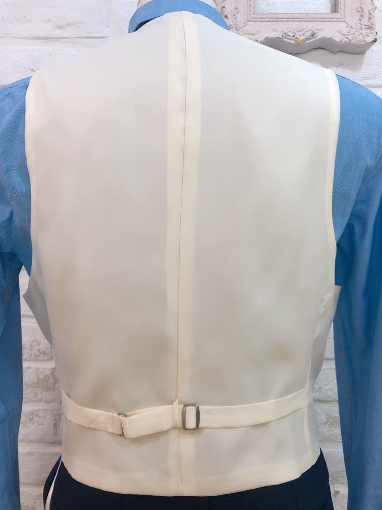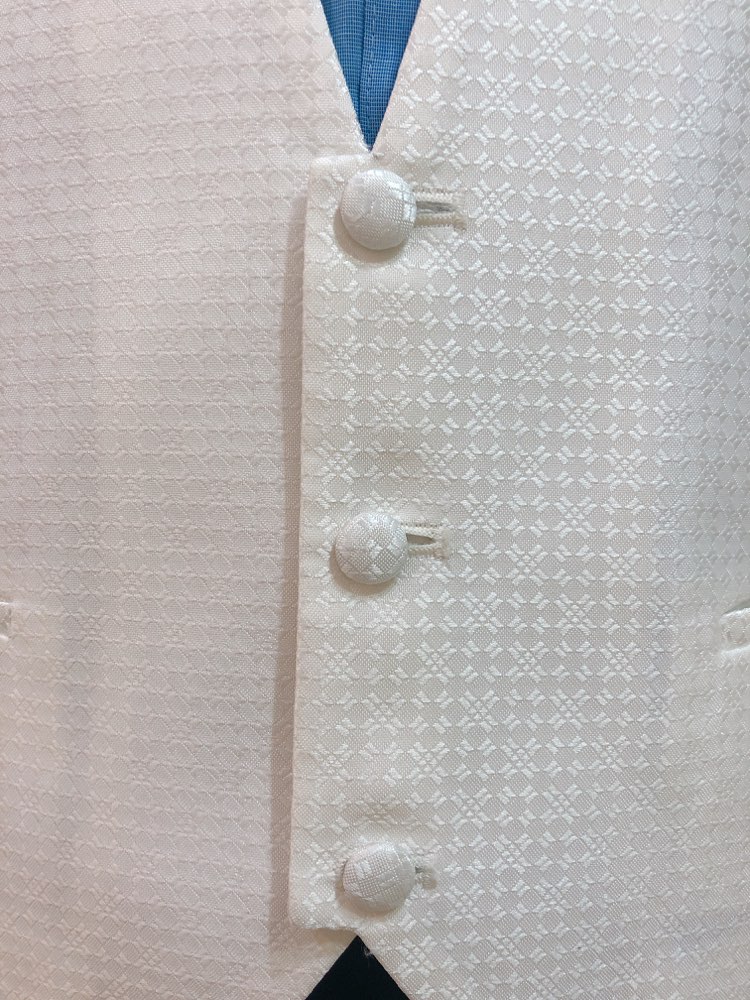 光沢のあるホワイトのベスト。薄いチェック柄が入っています。このベストは単品の展開です。広めのVカットで圧迫感のないスッキリした印象に。同じく光沢のあるシルバー、ゴールド、ネイビー、ホワイト、ブラックなど無地のジャケットと相性が良いです。パンツもジャケットとセットのものを合わせるとまとまりのあるコーディネートになります。白のウィングカラーシャツを合わせるときちんとした結婚式や披露宴向けのフォーマルなコーディネートになりおすすめです。その他パーティースーツ・二次会・海外ウェディング・フォトウェディング、前撮りにまで幅広いシーンでご使用いただけます。クルミボタンがクラシックな印象。オールシーズンに適しています。