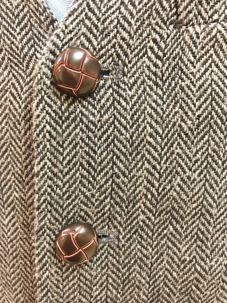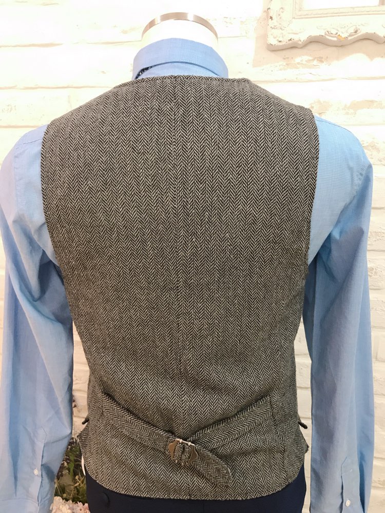 ダークグレーのツイード地のヘリンボーン柄べスト。このベストは単品の展開です。厚みのある生地感。木製のボタンがヴィンテージ風なデザイン。珍しいツイード生地がこなれた印象を作ってくれます。ネイビー、グレー、ボルドー、ブラック、ピンク、ライトブルーなど無地のジャケットやシャツと相性が良いです。パンツはホワイトデニムや、グレー、ブラック、ネイビー、ライトブルー、ピンクの無地や柄パンツでも合わせやすい万能なベストです。秋冬のお式等で季節感を出したい方におすすめの一枚です。白のウィングカラーシャツを合わせれば披露宴向けのフォーマルなコーディネートにも対応可能。パーティースーツ・二次会・海外ウェディング・フォトウェディング、前撮りにまで幅広いシーンでご使用いただけます。