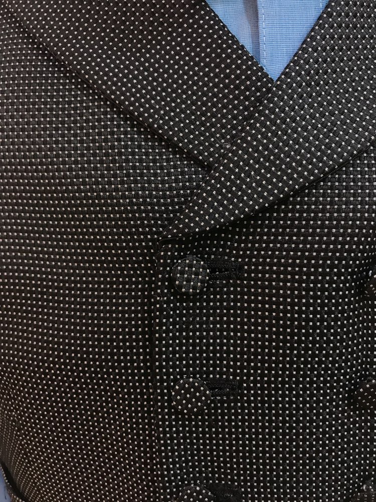 ブラック地にホワイトの細かなドットが入ったピークドラペルのダブルベスト。ピークドラペルタイプは重厚感のあるクラシックな装いにぴったりです。このベストはセットでの展開です。着丈が短めなのでセットのタキシードパンツを合わせるのがおすすめです。その他、フォーマルな光沢のあるシルバー、ゴールド、ネイビー、ホワイト、ブラックなど無地のジャケットと相性が良いです。白のウィングカラーシャツを合わせるときちんとした結婚式や披露宴向けのフォーマルなコーディネートになりおすすめです。その他パーティースーツ・二次会・海外ウェディング・フォトウェディング、前撮りにまで幅広いシーンでご使用いただけます。クルミボタンがクラシックな印象。オールシーズンに適しています。