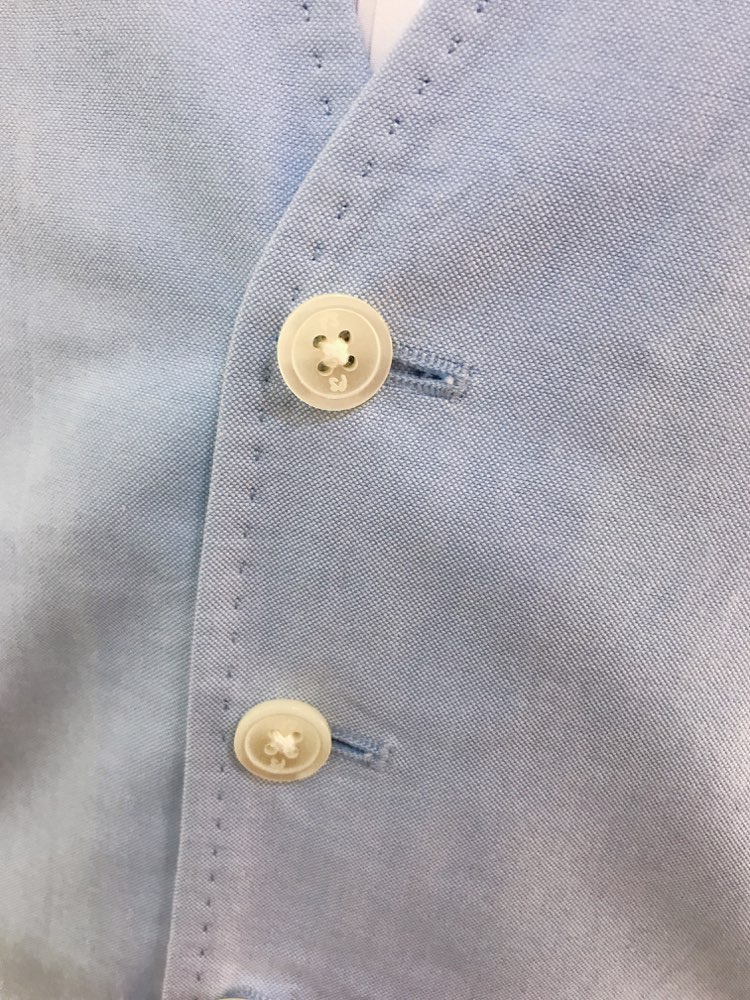 Paul Smithのライトブルーの無地ベスト。しっかりとしたコットン素材がカジュアルな印象。後身頃はベージュのコットン素材。サイドにネイビーの水玉模様がはいっておりおしゃれ。このベストは単品の展開です。ベージュ、オフホワイト、ブラック、ネイビー、ブルーなど無地のジャケットの他、チェックなどの柄物とも相性が良いです。パンツもジャケットとセットのものを履いていただくとまとまりのあるコーディネートになります。ホワイトデニムとの相性も良いです。ビーチ・リゾートウェディングやガーデンウェディング等での爽やかな着こなしがおすすめです。その他パーティースーツ・二次会・海外ウェディング・フォトウェディング、前撮りにまで幅広いシーンでご使用いただけます。オールシーズンに適しています。