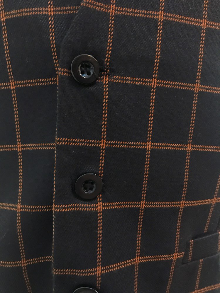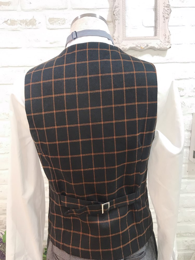 ブラック×オレンジブラウンの格子チェック柄ベスト。温かみのある生地感。このベストは単品の展開です。ブラウン、ベージュ、オフホワイト、ブラック、ブルー、グリーンなど無地のジャケットと相性が良いです。パンツもジャケットとセットのものを履いていただくとまとまりのあるコーディネートになります。ホワイトデニムとの相性も良いです。コーディネートが難しいマスタードやカーキカラーのシャツも、こちらのベストと合わせると素敵です。ノージャケットのベストスタイルでカジュアルな二次会タキシードとしても素敵。その他パーティースーツ・二次会・海外ウェディング・フォトウェディング、前撮りにまで幅広いシーンでご使用いただけます。オールシーズンに適しています。