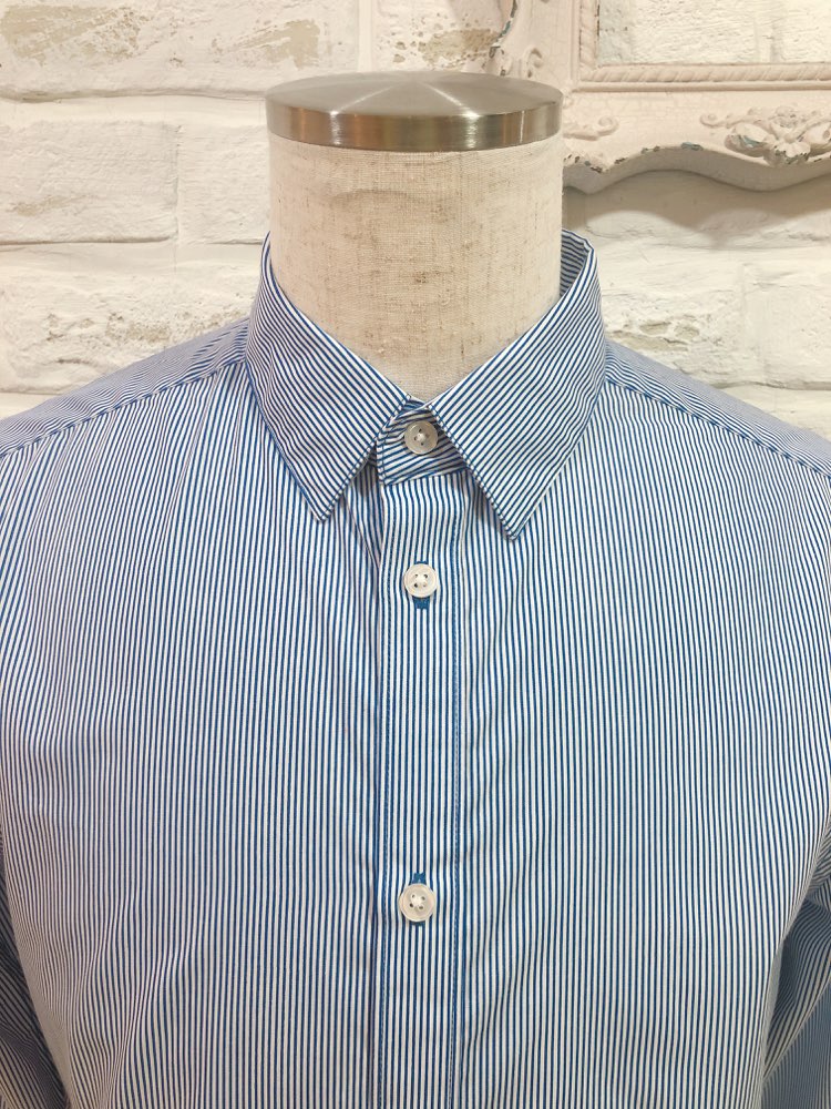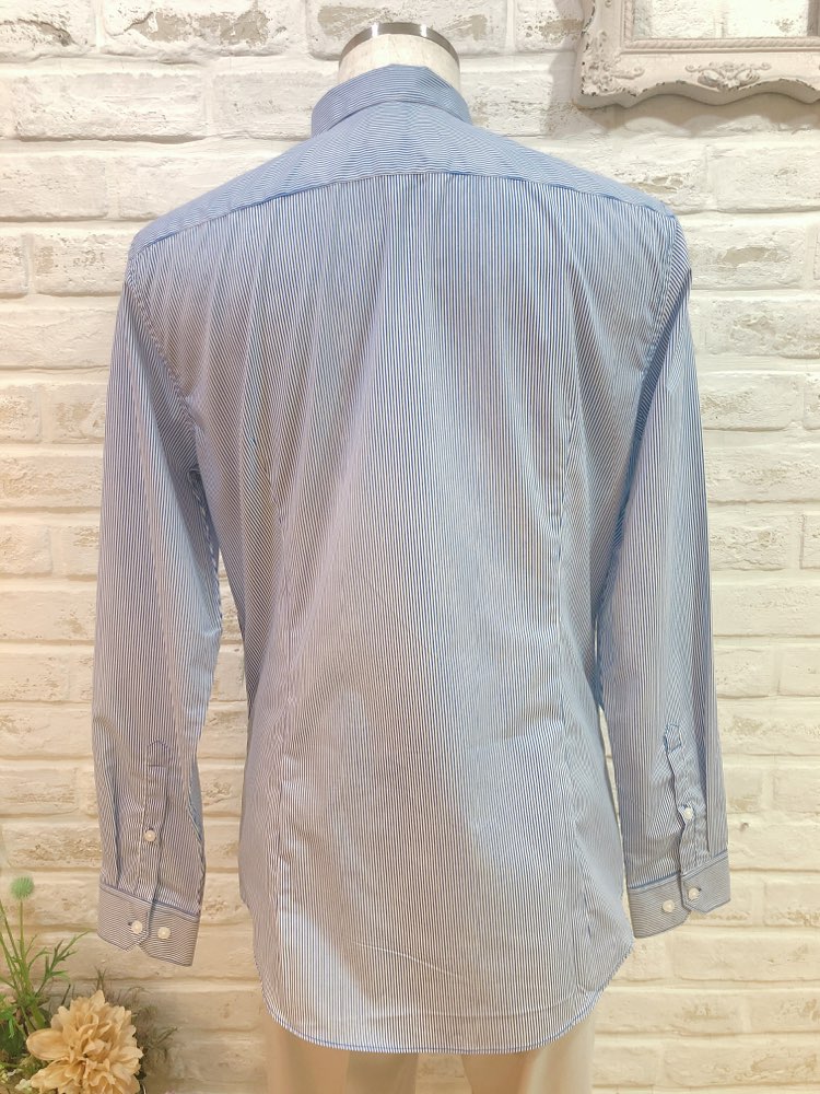 ブルーのストライプ柄のポリエステル混素材の長袖シャツ。パリッとした素材感。ネイビー、ブルー、ホワイト、グレー等の無地タキシードやジャケットの他、細いストライプなのでチェックなどの柄物と合わせても可愛いです。爽やかでカジュアルな着こなしをしたい方におすすめです。イージーアイロン加工でシワいらず。襟は定番のレギュラーカラー。袖口周りをボタンで調節できます。裾はラウンドカット。スリムフィット?肩幅が狭めで、ウエストを絞った細身のフィット。ボディラインに沿ったシルエットを創り出します。