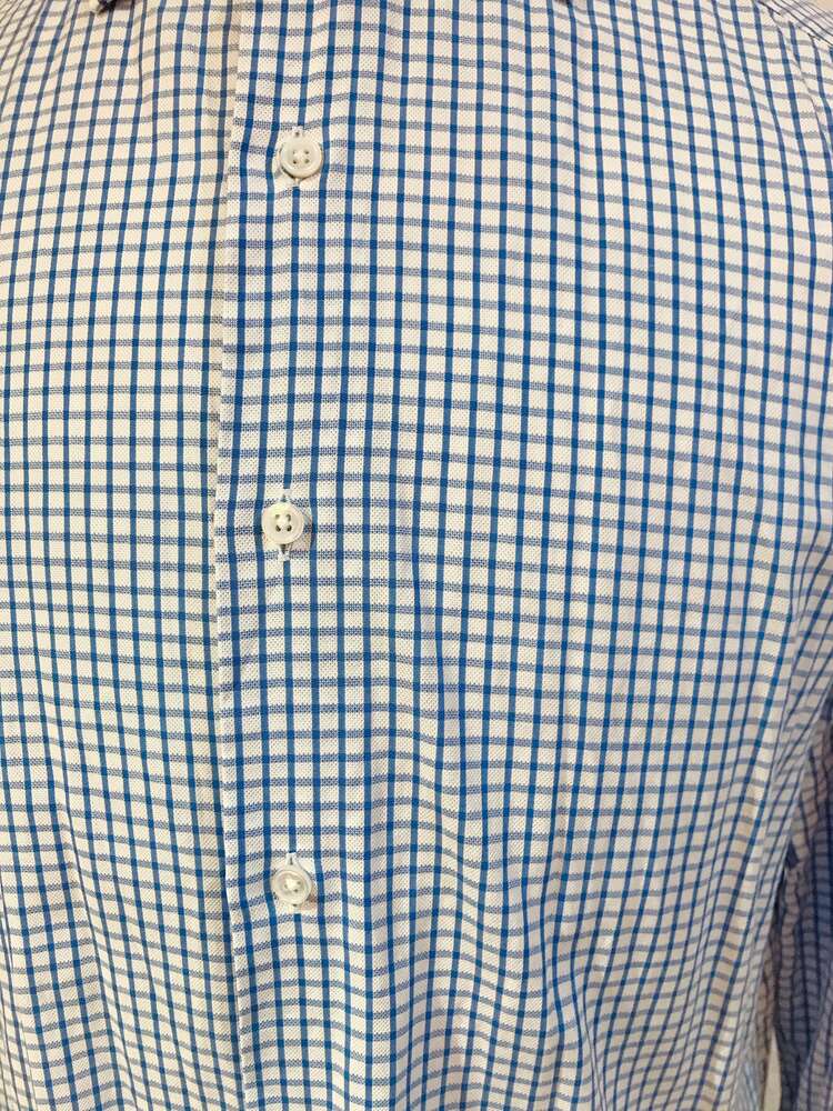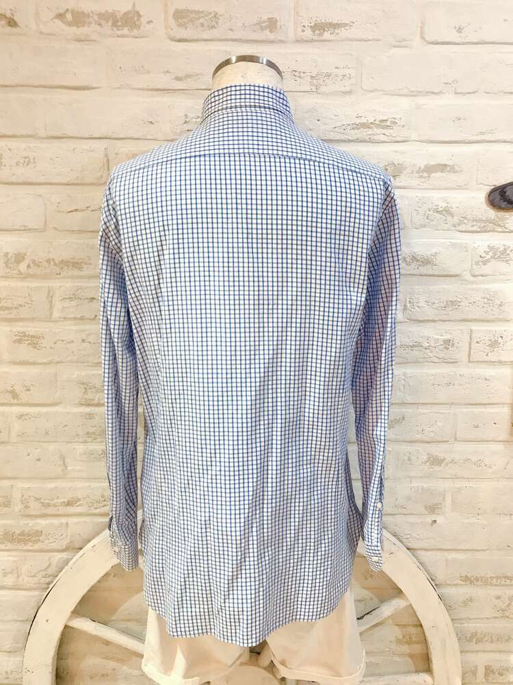 UNITED ARROWSのライトブルーの格子チェック柄のコットン素材の長袖シャツ。ネイビー、ブルー、ホワイト、グレー、ピンク等の無地タキシードやジャケットと相性が良いです。一年中着ていただけますが特に夏のビーチ・ガーデンウェディング等で爽やかでカジュアルな着こなしをしたい方におすすめです。イージーアイロン加工でシワいらず。襟は定番のレギュラーカラー。袖口周りをボタンで調節できます。裾はラウンドカット。スリムフィット?肩幅が狭めで、ウエストを絞った細身のフィット。ボディラインに沿ったシルエットを創り出します。