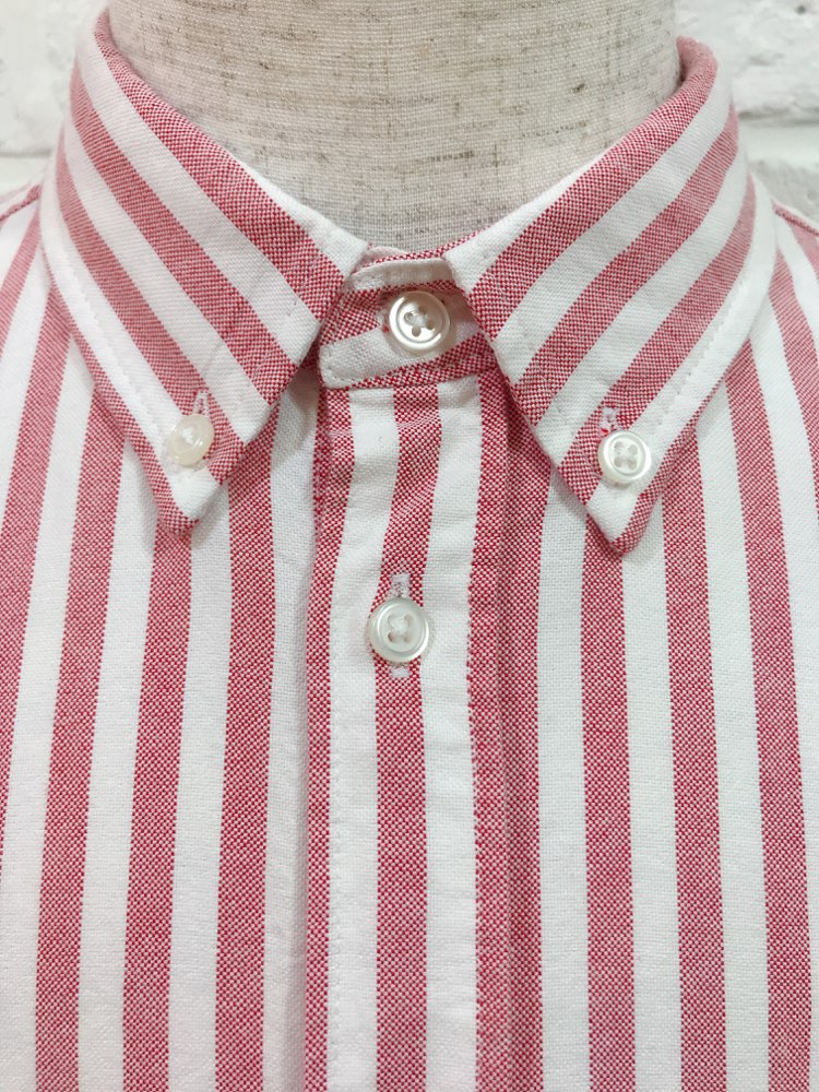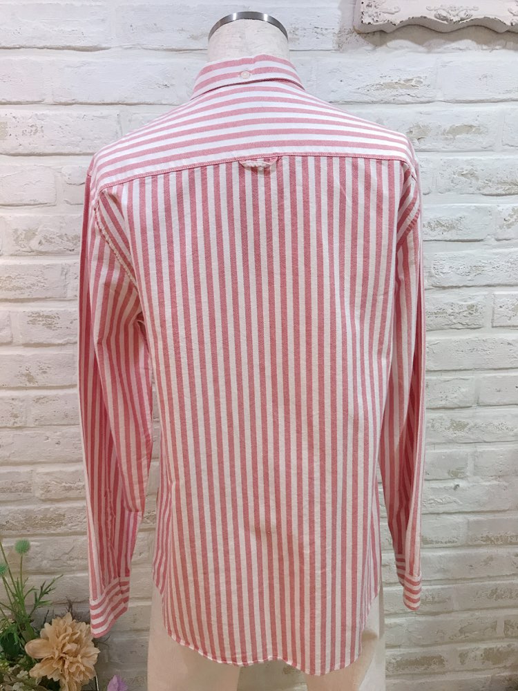 オフホワイト地にくすんだレッドのストライプ柄のコットン長袖シャツ。少し厚めのくしゅっとした素材感とボタンダウンカラーで、カジュアルなスタイル。オフホワイト、グリーン、ピンク、グレー、ベージュの無地のタキシードやジャケットと相性が良いです。また、ノージャケットのベストスタイル、サスペンダースタイルとも非常に相性が良く、特にナチュラル・ヴィンテージ風な着こなしをしたい方におすすめです。トレンドのドライフラワーともよく合います。裾はラウンドカット。左胸にポケットあり。レギュラーフィット?動きやすいゆとりがあり、ウエスト部分をゆるやかに絞ったクラシックなフィット。着心地のよいテーラードシルエットを創り出します。
