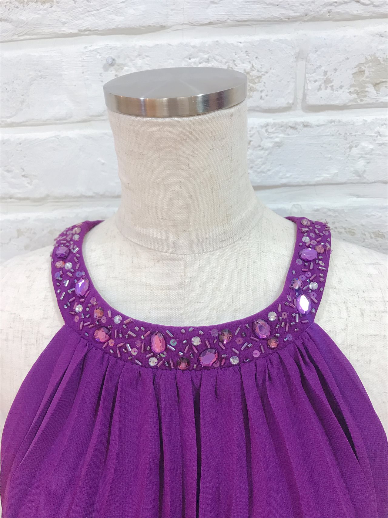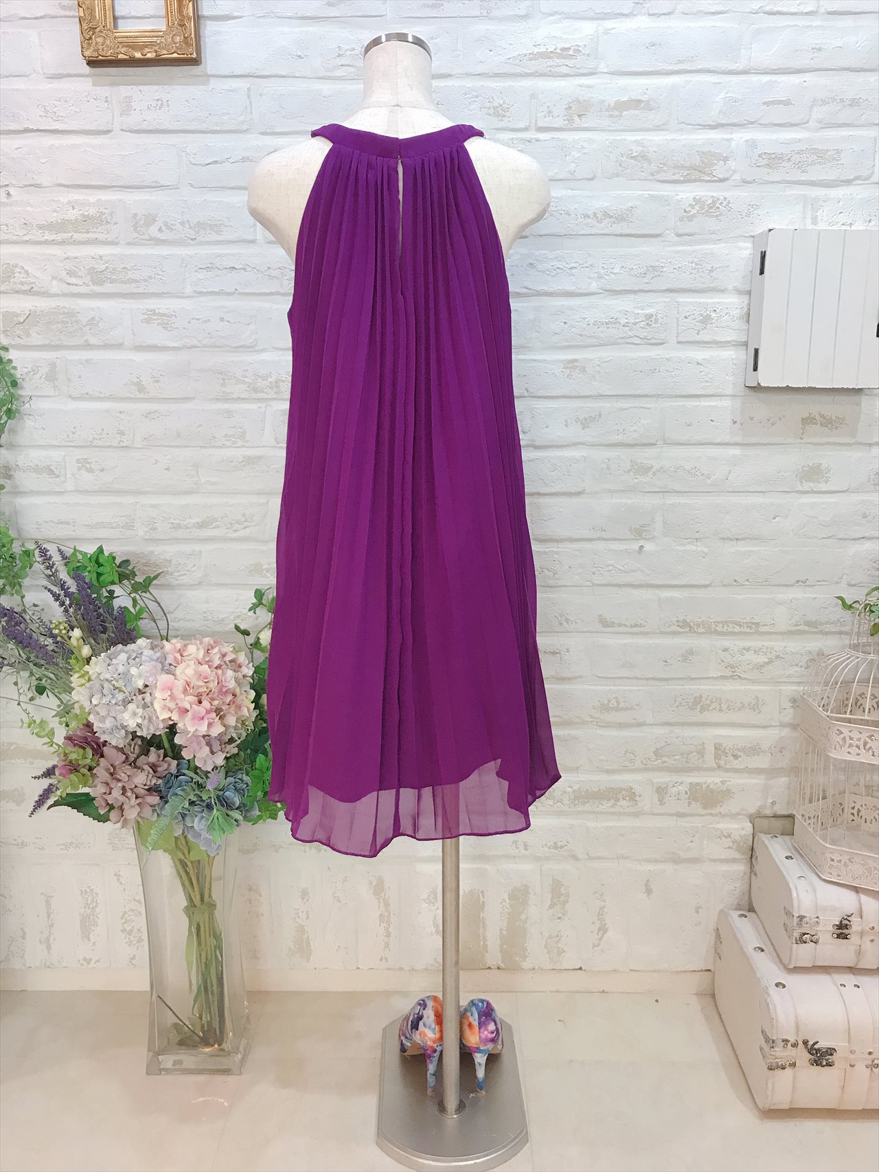 アメリカンスリーブのデザインが美しいパープルドレス。首回りには同じ紫色のビジュがあしらってあり、派手過ぎず地味過ぎず、絶妙なバランスで顔周りを華やかに見せてくれます。ネックレスが要らないデザインとなるので耳元に大きめのイヤリング等を合わせるととてもオシャレに着て頂けます。首元から裾にかけて柔らかなシフォン生地のAラインとなっており、お腹周りやヒップラインを気にせず着て頂けます。羽織ものには透け感のあるデザインのストール等がおすすめです。