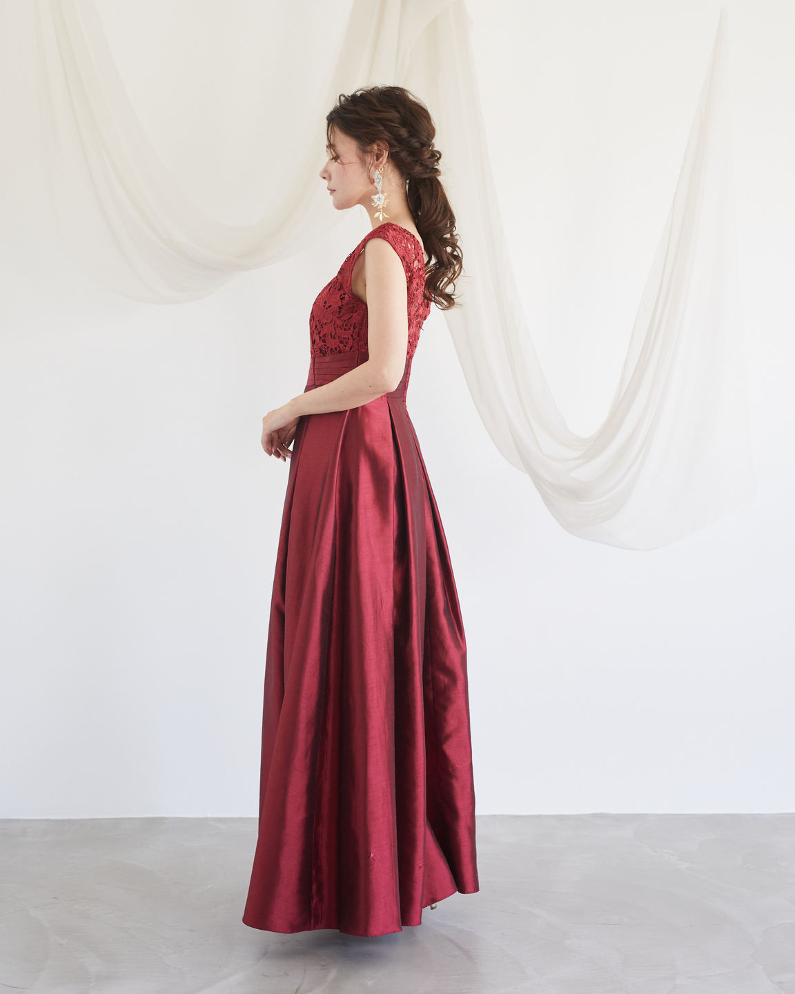 ボルドーのボリュームカラードレス。胸元のレースがとっても華やかなカラードレス。スカートは光沢感がありより一層華やかな印象。ウエスト切り替えなのでスッキリみえます。ウェデングの2次会や1.5次会やパーティー、演奏会などにおすすめめドレスです。