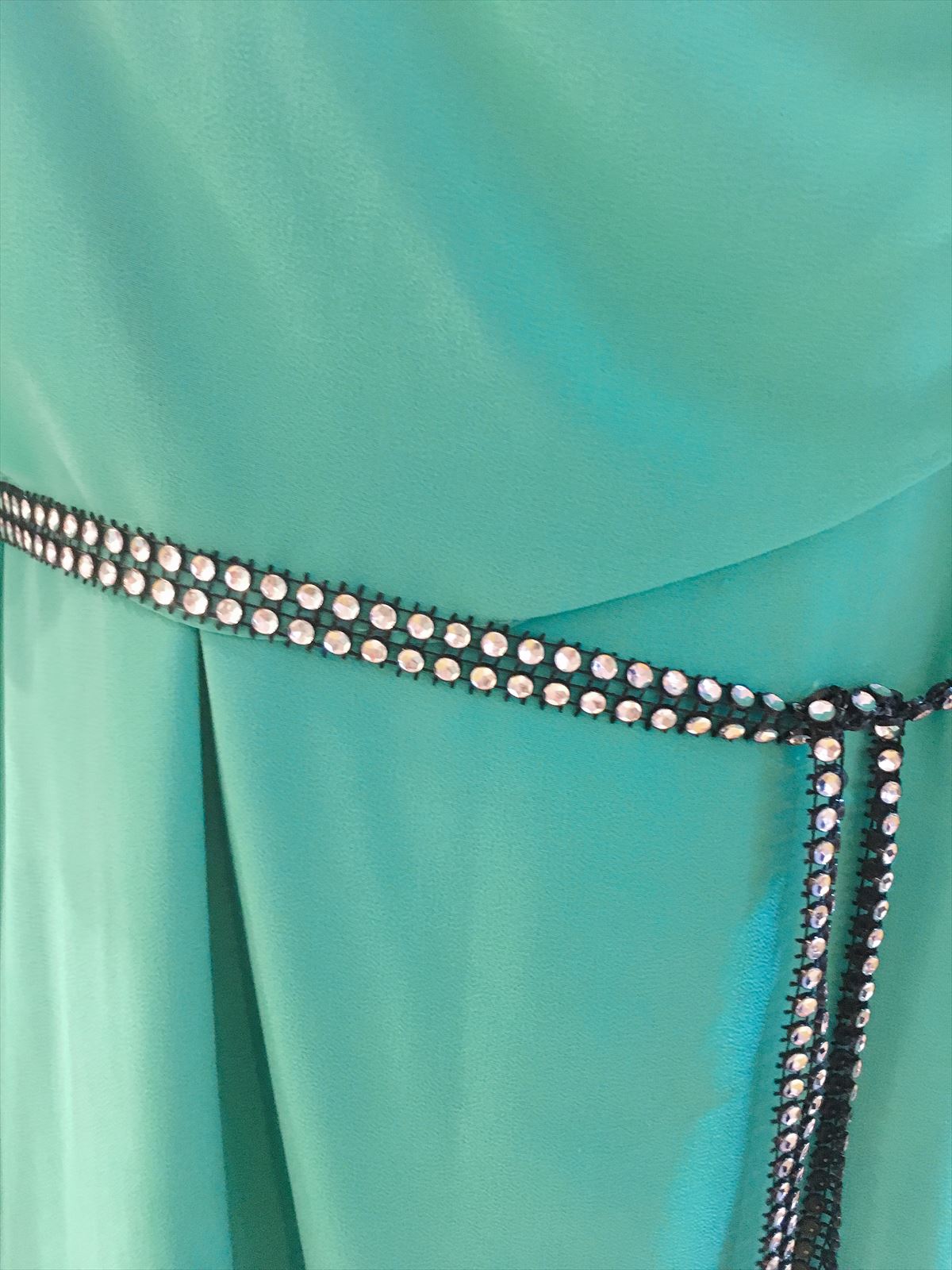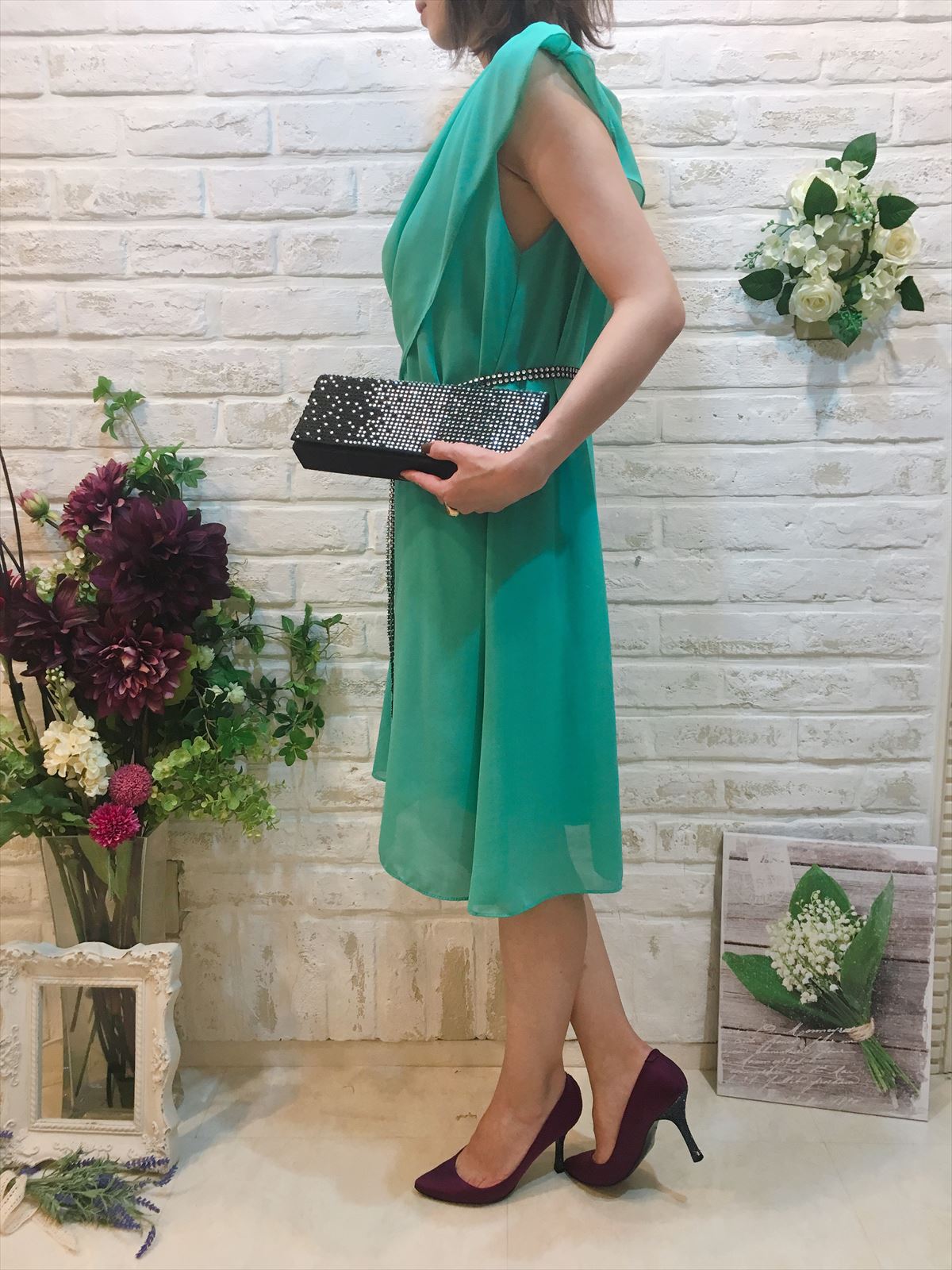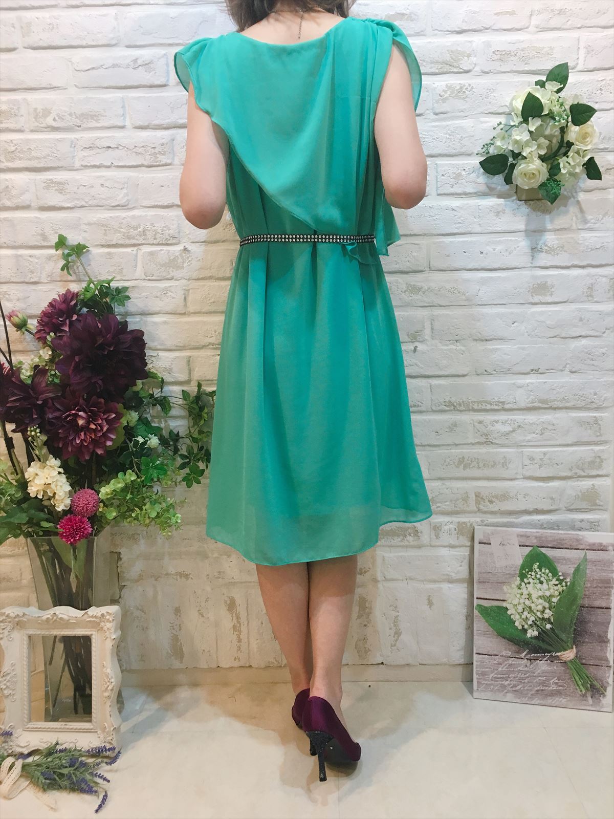 ターコイズグリーン袖ありドレス。袖の長さがアシンメトリーでオシャレなドレスです。付属のベルトを付けたら引き締まります。