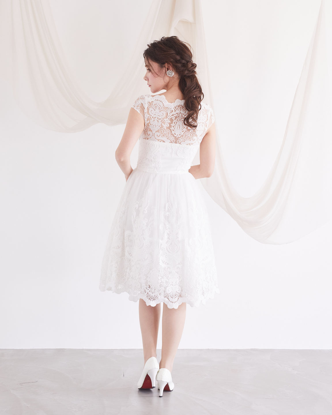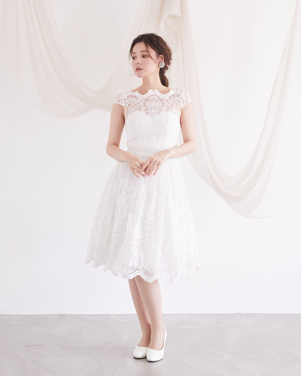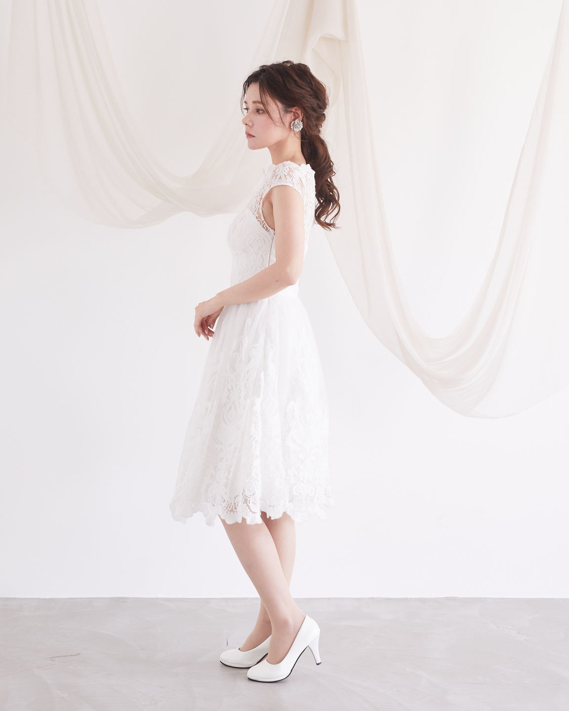 ホワイト肩ありドレス。ホワイトのレース刺繍が可愛いです。スカート部分のボリュームがほどよく丈長めです。
