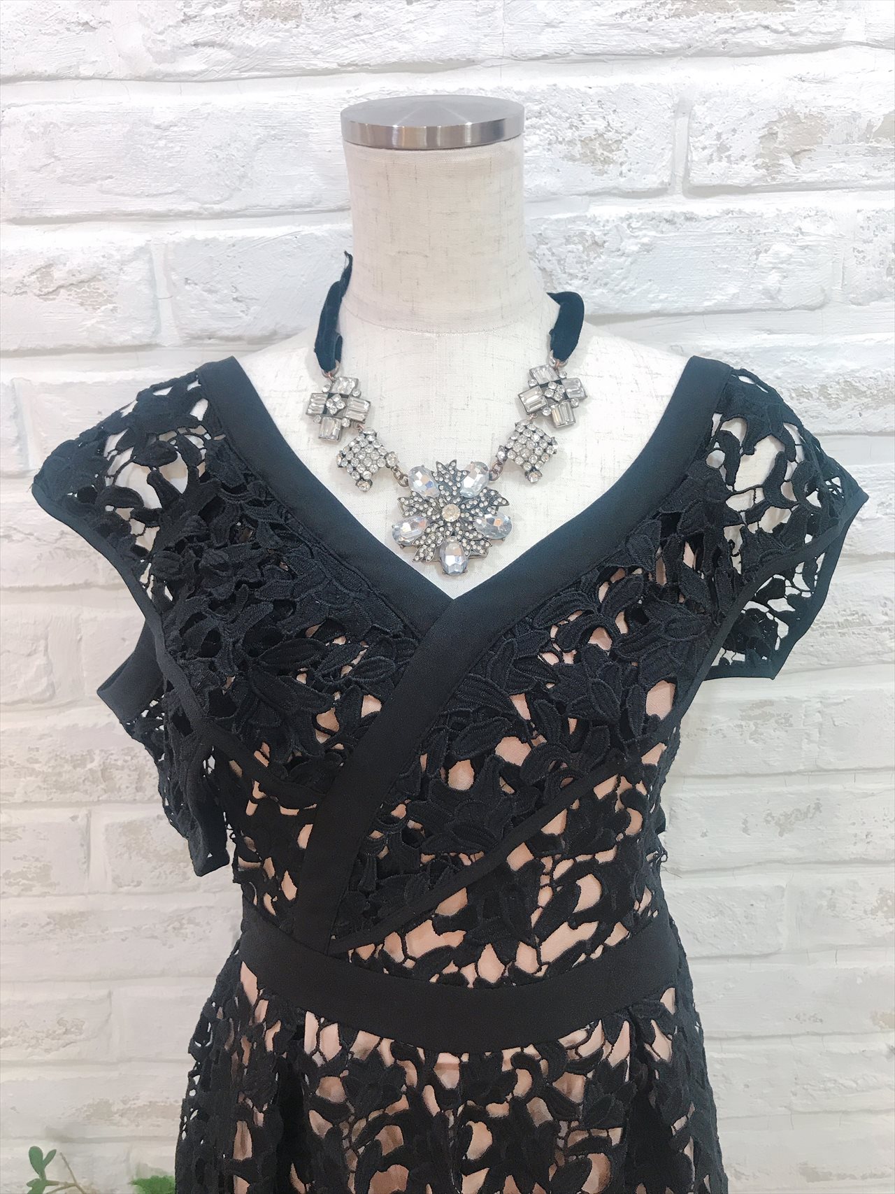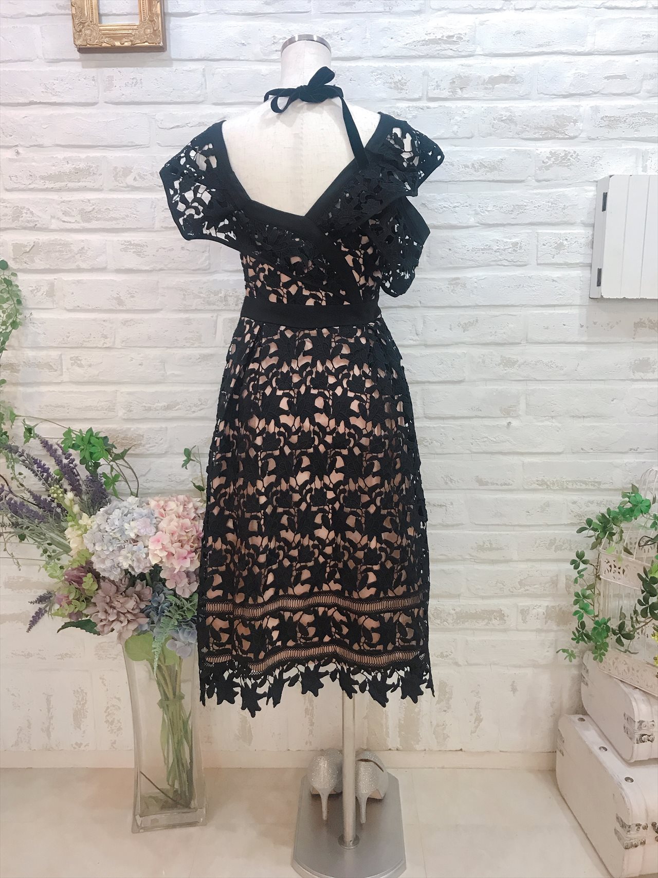 ブラック総レースV字肩ありミモレ丈ドレス
