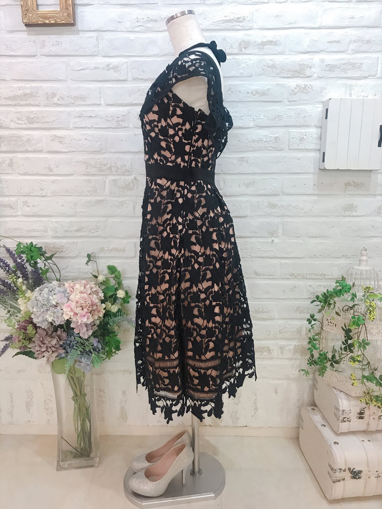 ブラック総レース肩ありドレス。丈も長めで、上品なドレスです。