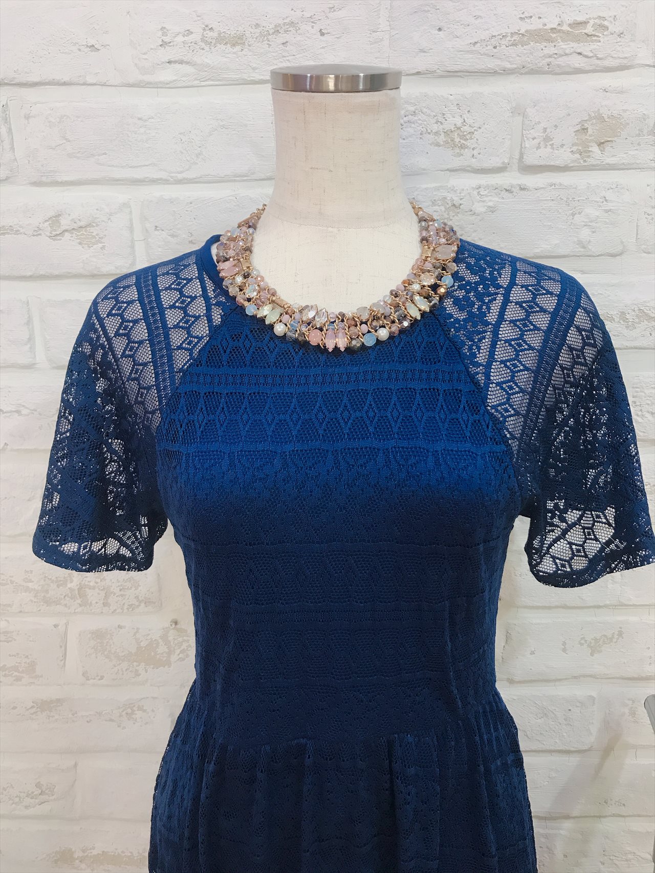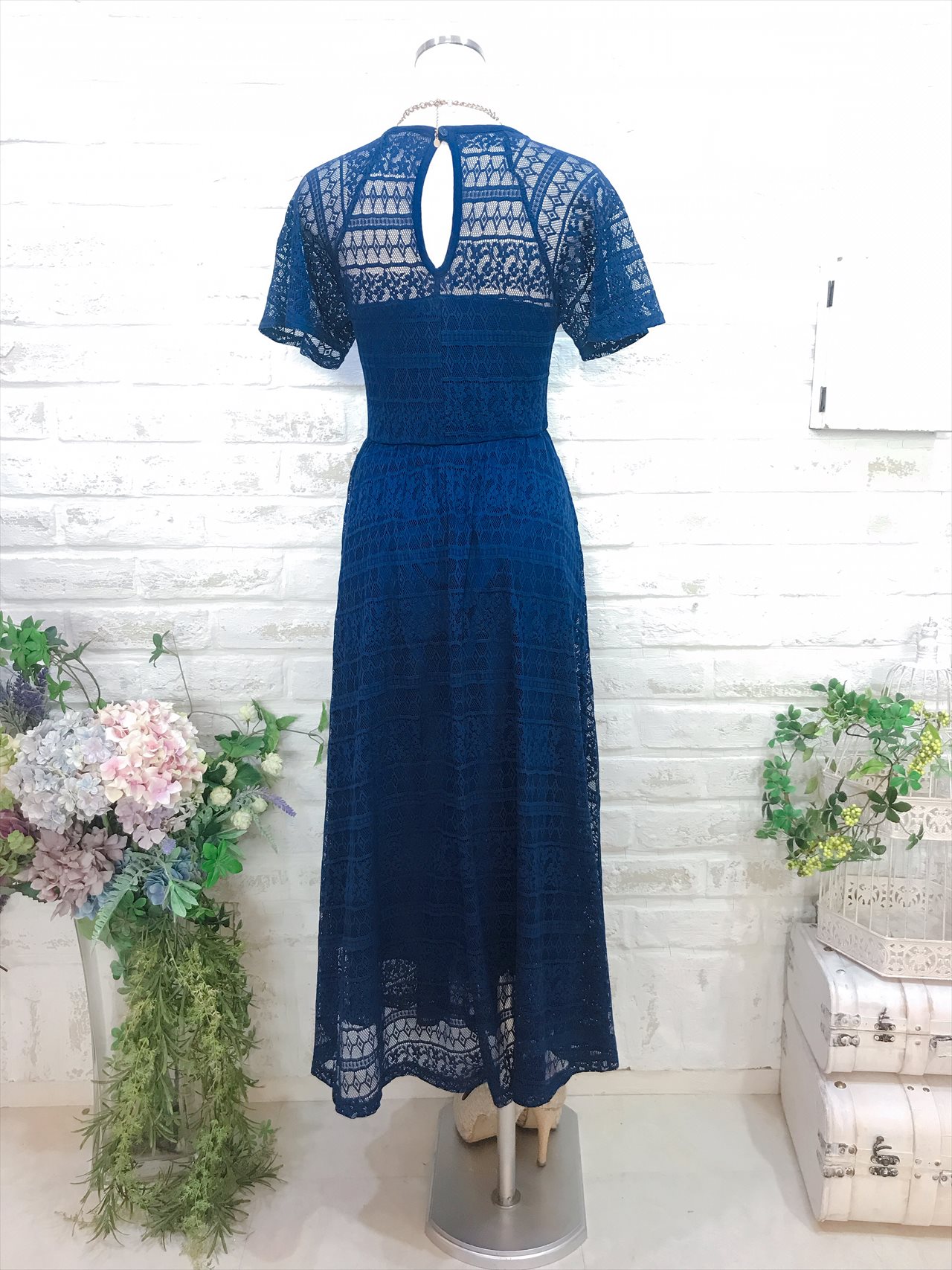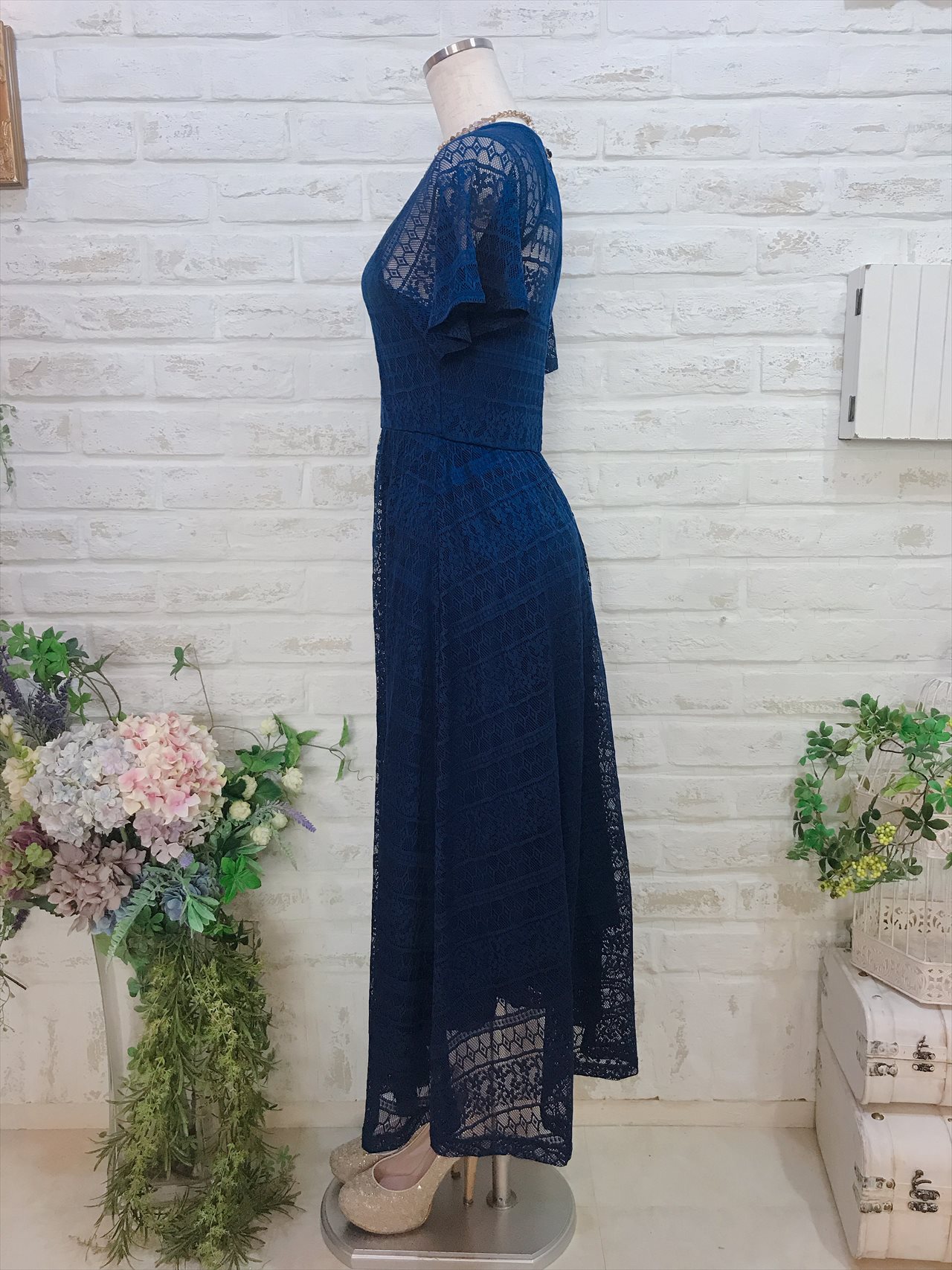 ネイビーの丈長めドレス。レース素材で落ち着いた印象のドレス。ショートスリーブなので結婚式のゲスト用として1枚で着て頂けます。小物にカラーを入れてもおしゃれなコーディネートになります。