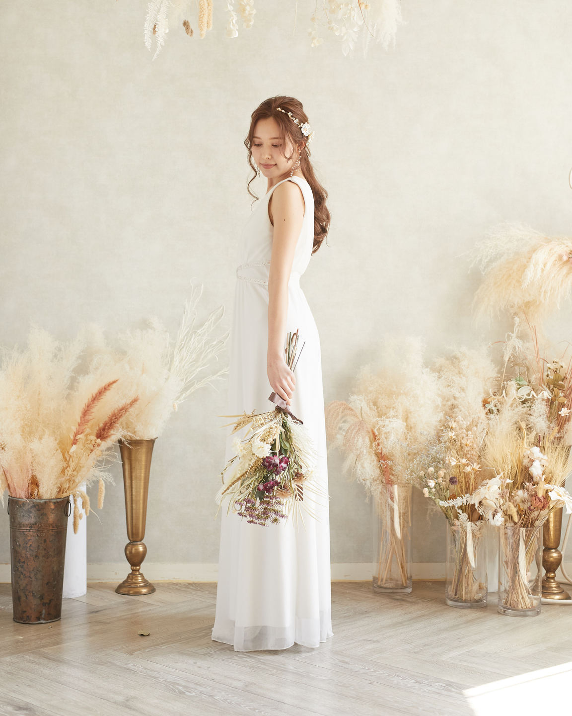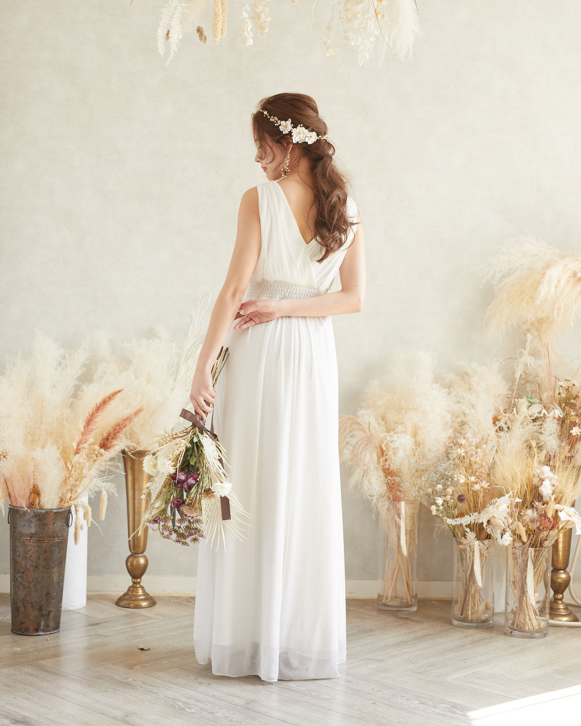 ウエストビジュ肩ありホワイトシンプルエンパイアロングドレス