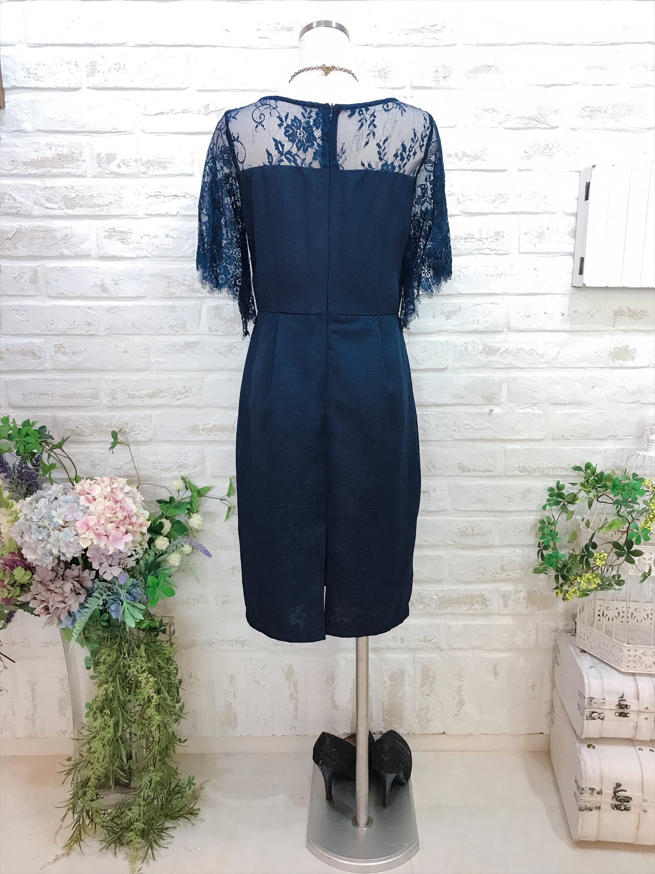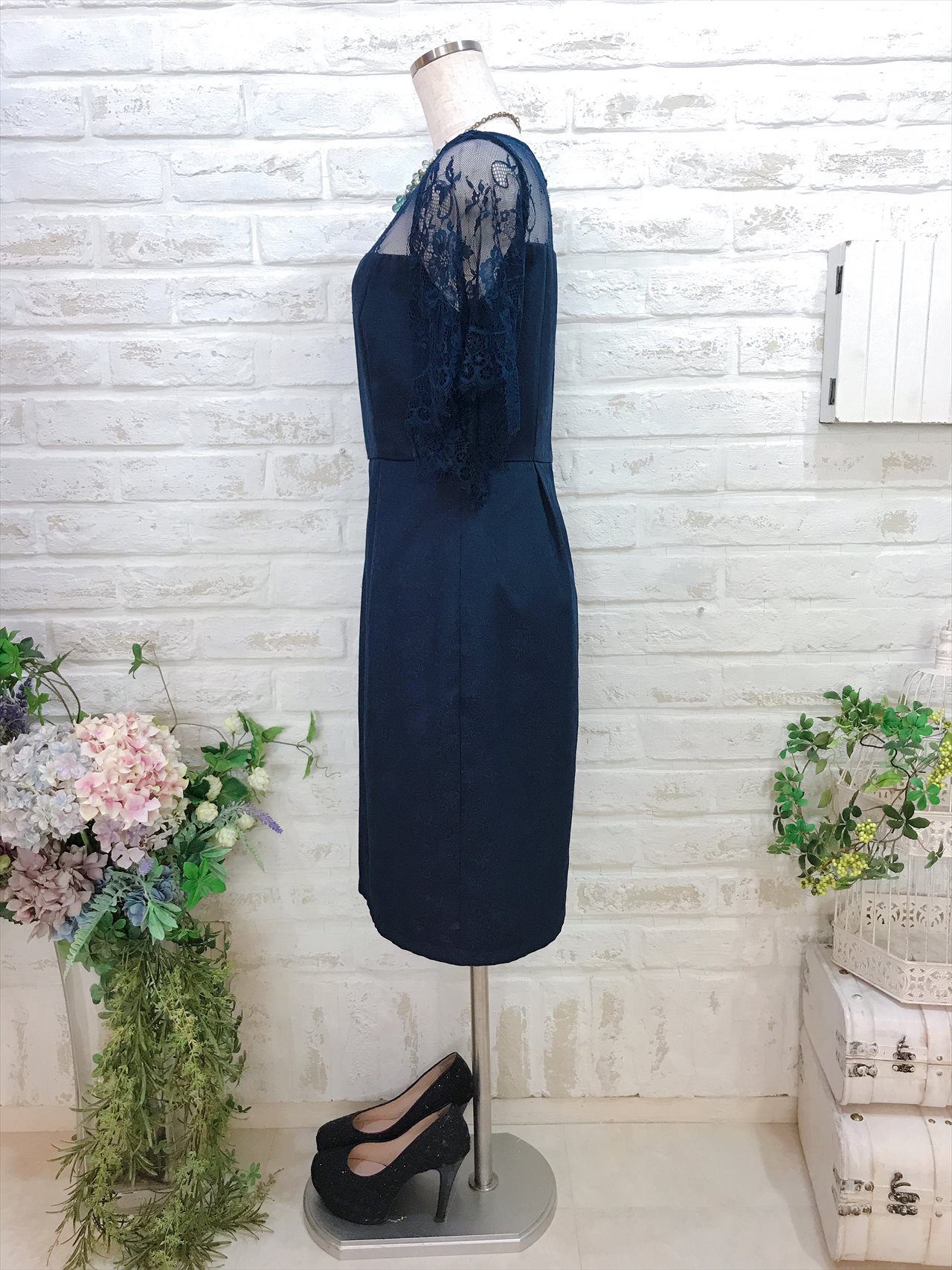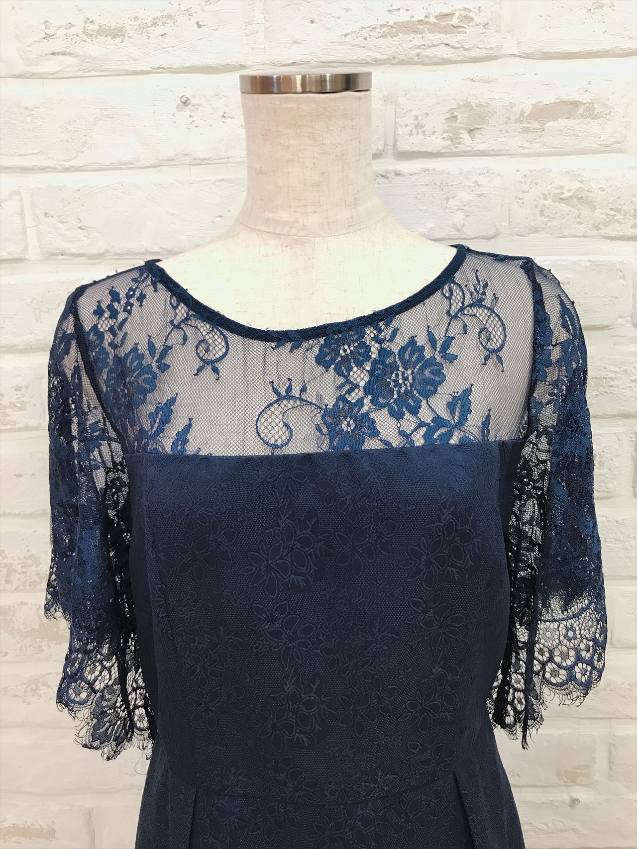 ネイビー袖ありドレス。総レースで大人っぽいデザイン。パールが映えます。
