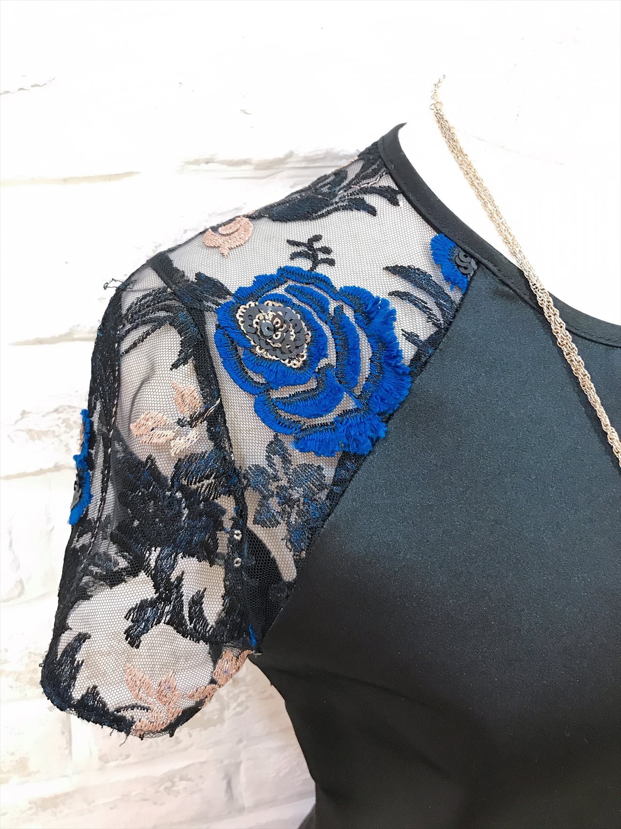 ブラック袖ありドレス。袖部分がレースになっていて、ブルー、ゴールドの刺繍があしらわれていて華やか。スカートも可愛いドレスです。