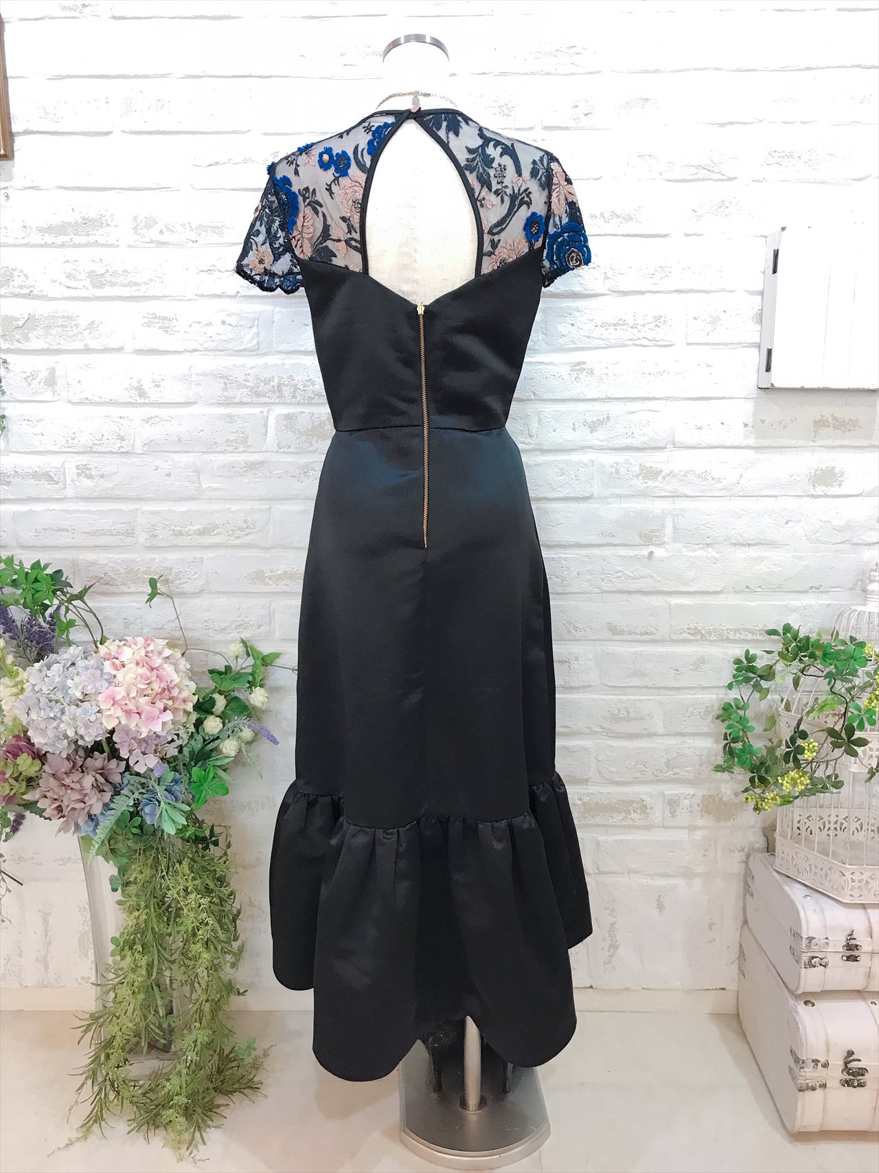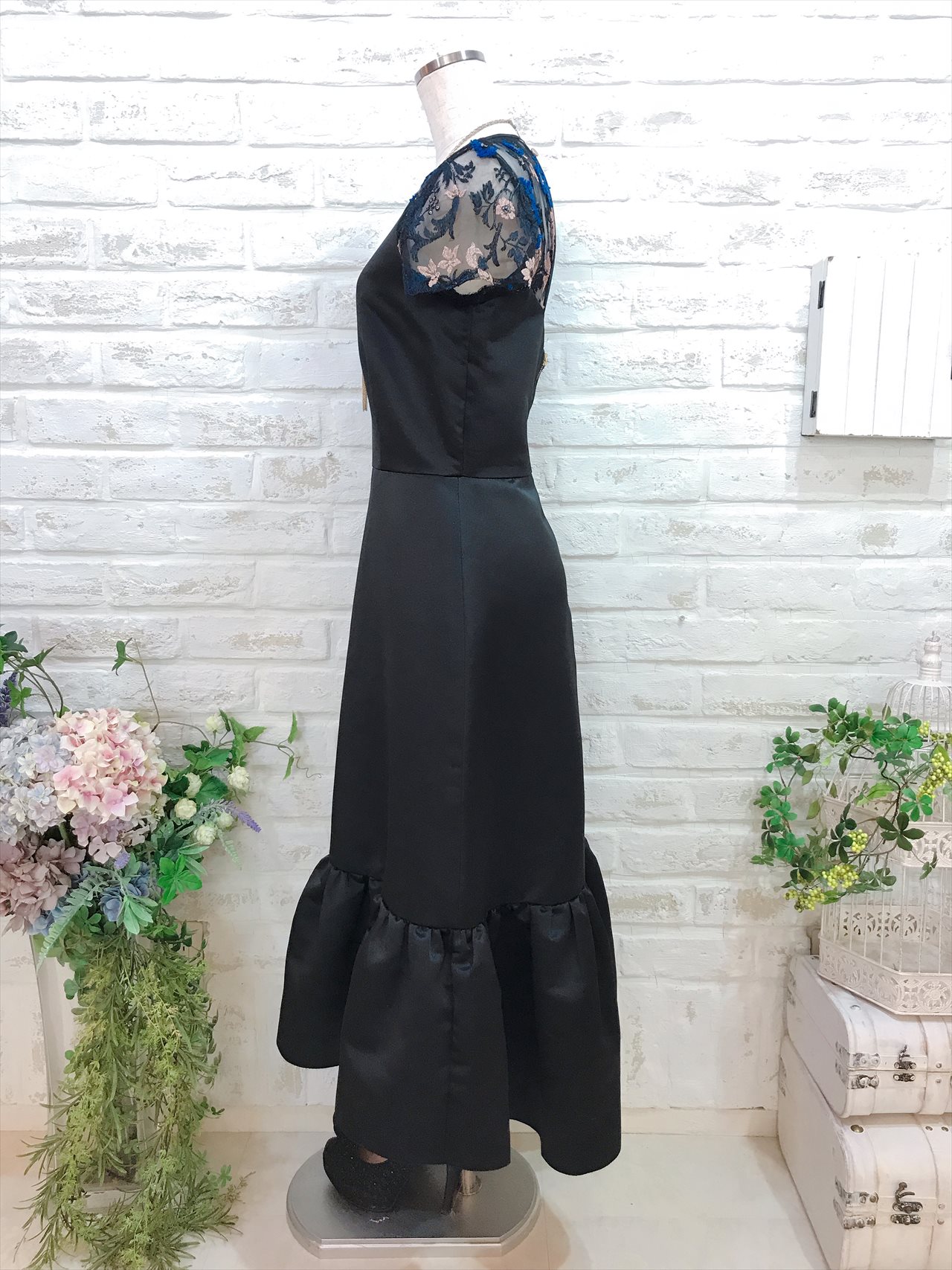ブラックショートスリーブ刺繍裾フリルミモレ丈ドレス