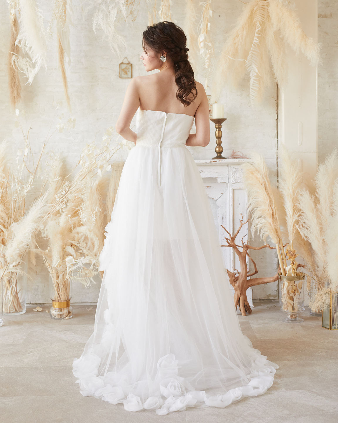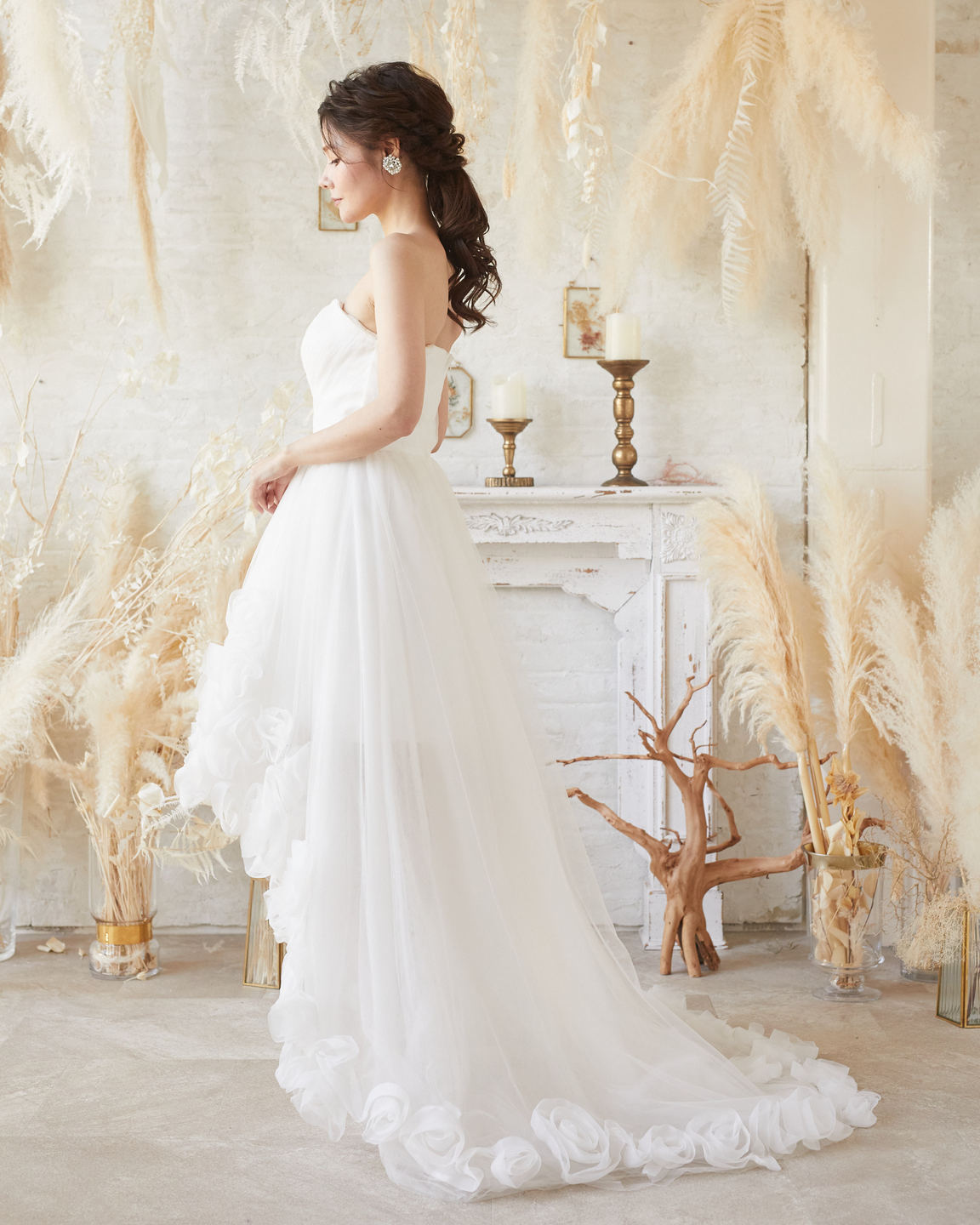 ホワイトボリューム裾バラデザインイレヘムベアドレス