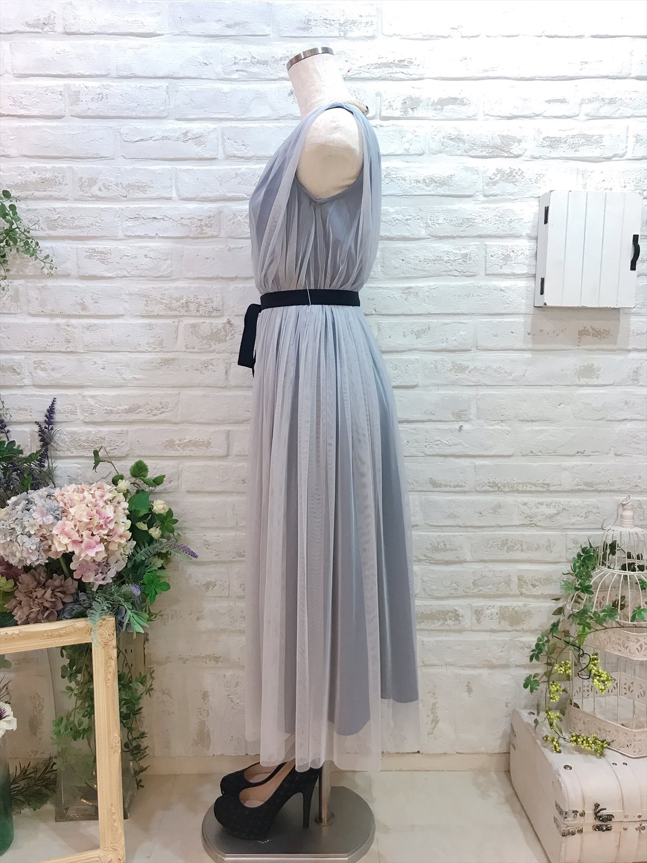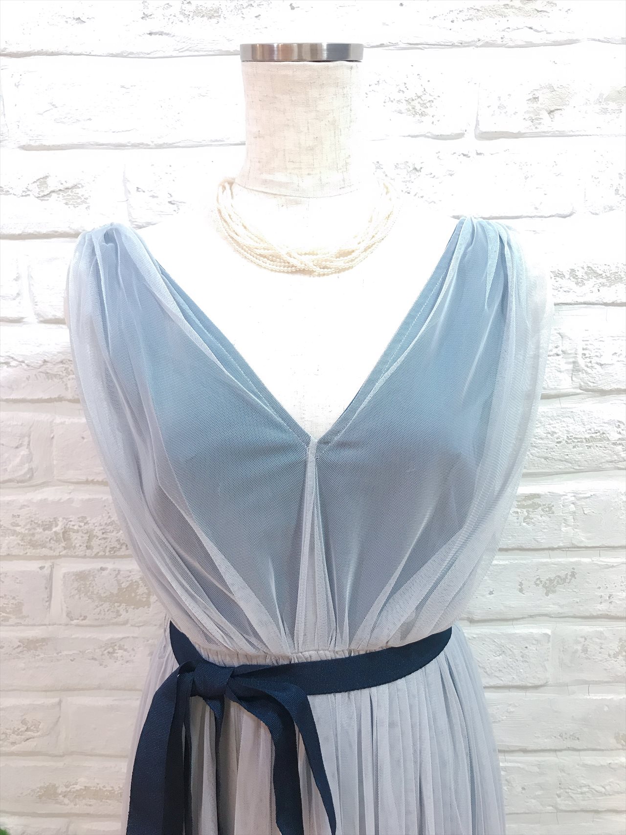 全部チュール素材のワンピースドレス。ミモレ丈で大人可愛いデザイン。ウェストのネイビーリボンがアクセントになって引き締まります。