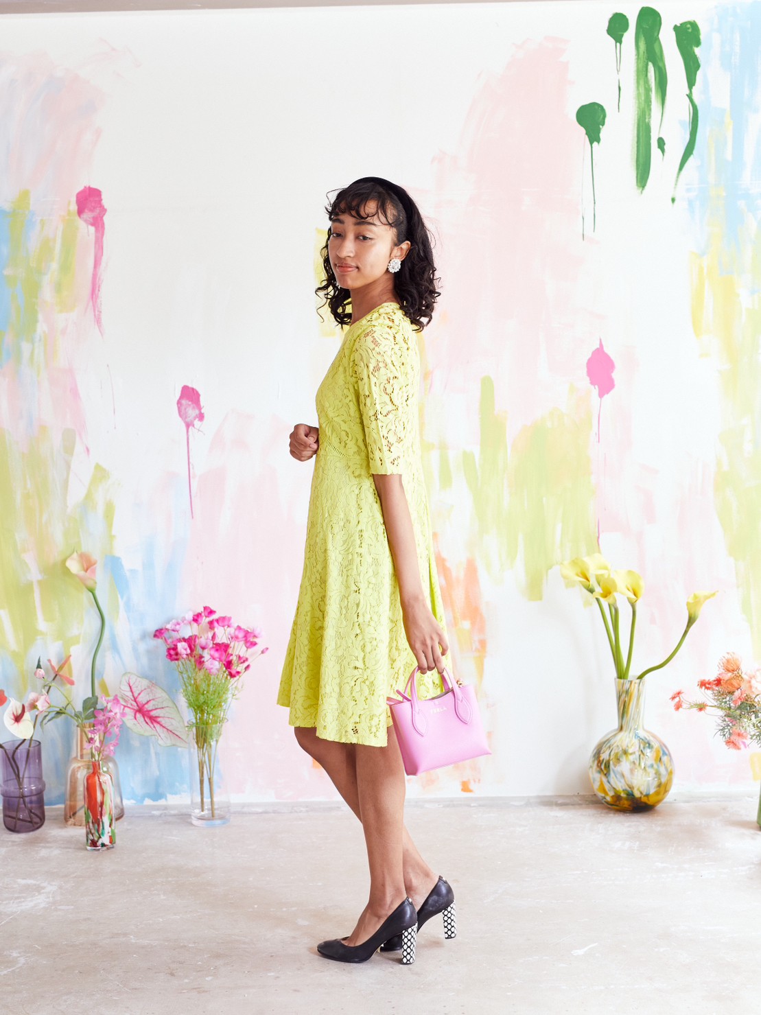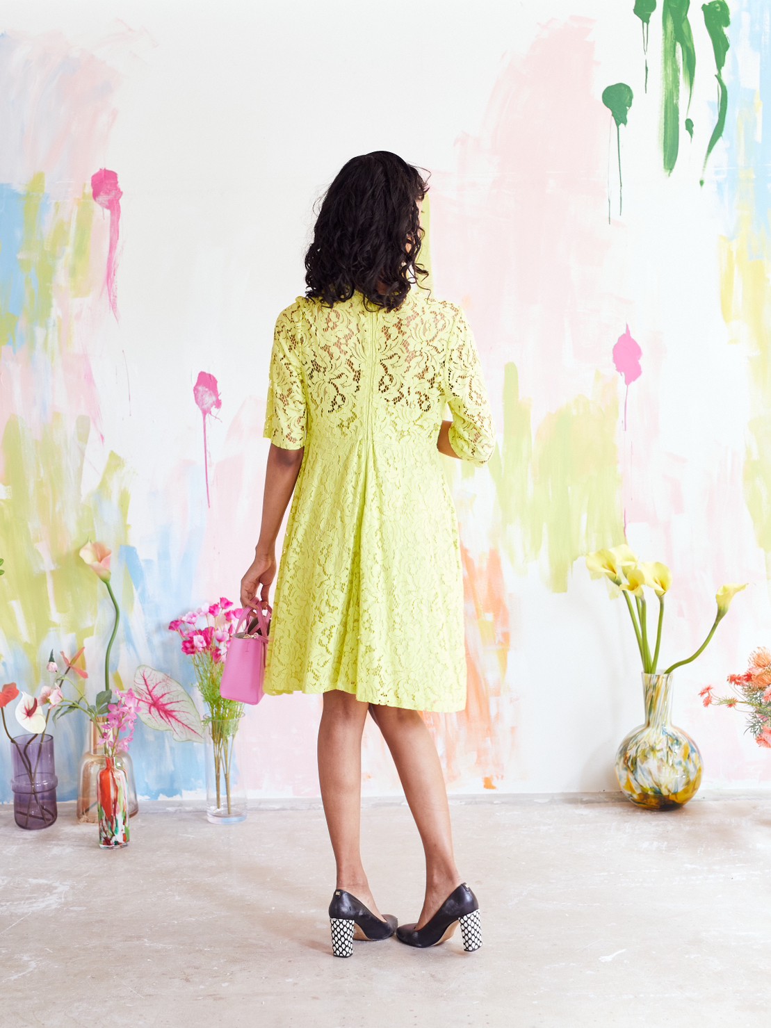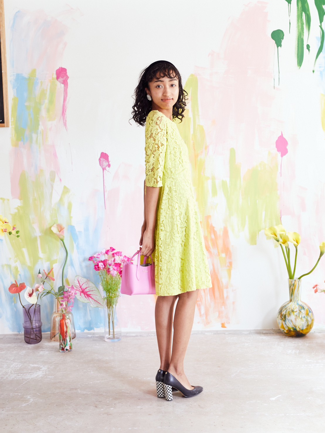 ネオンイエロー袖ありドレス。総レースがおしゃれなドレス。夏のパーティーや結婚式のゲストドレスにおすすめです。