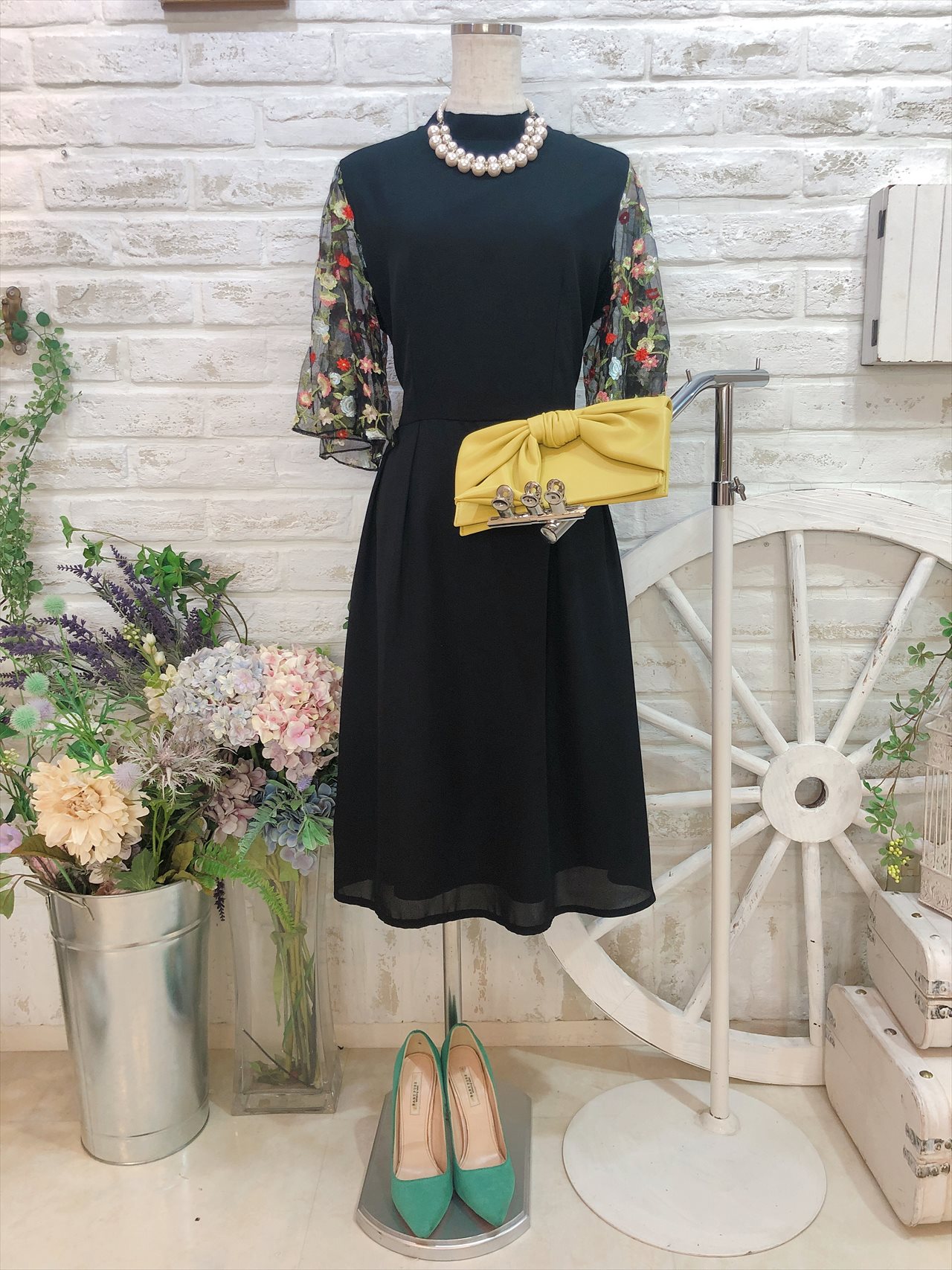 ブラック袖ありドレス。袖の部分に花柄刺繍がありとても可愛いドレス。