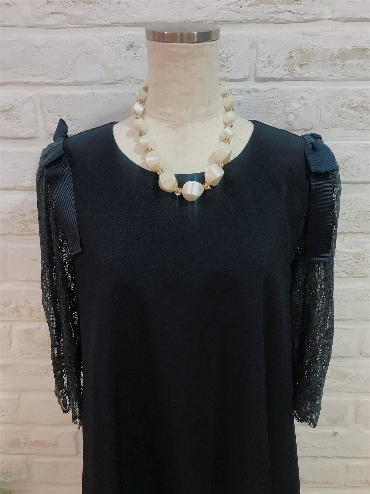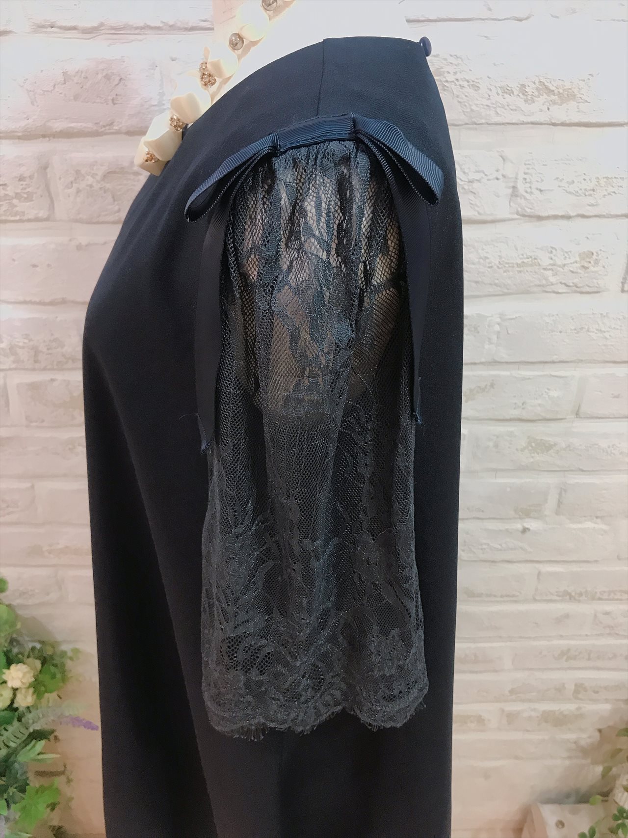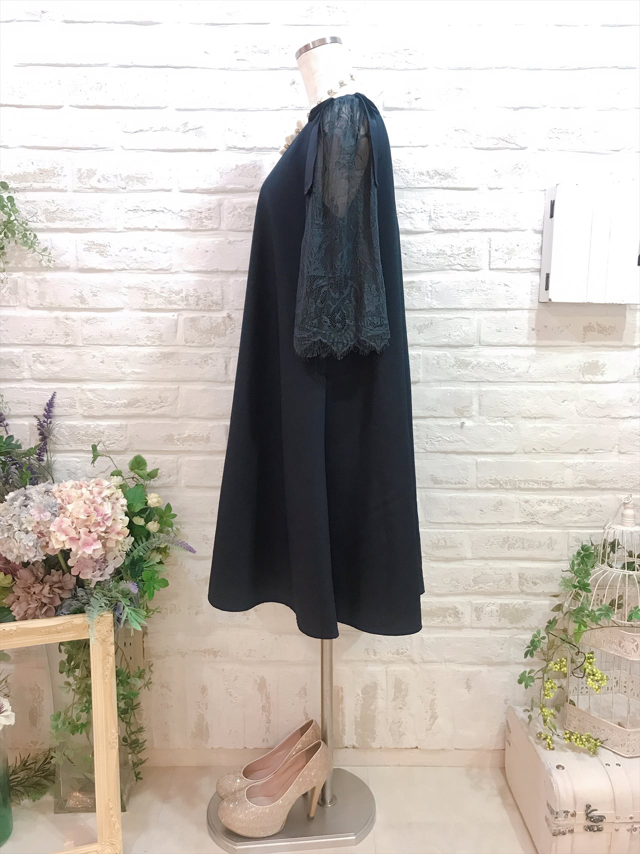ブラック袖ありドレス。袖の部分はレース素材。肩にリボンが有ります。