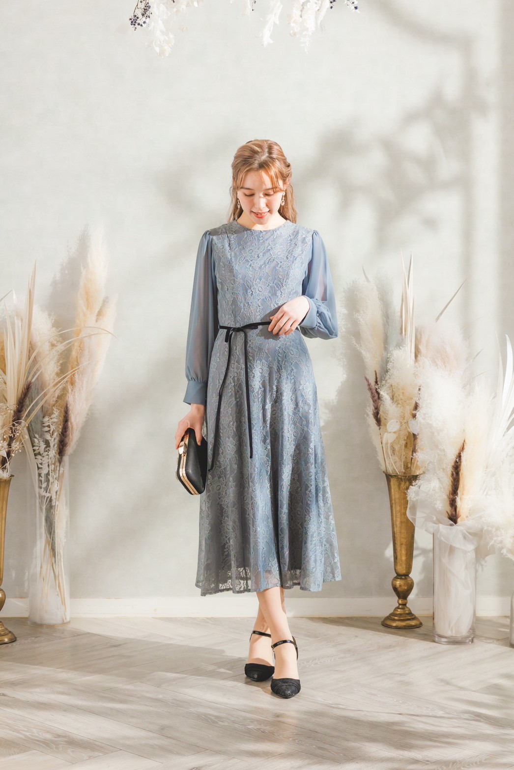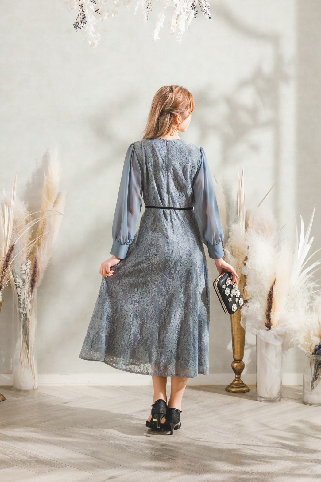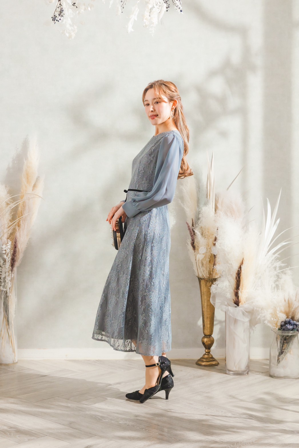 シフォン袖 ベロアリボンレースドレス ブルーグレー M