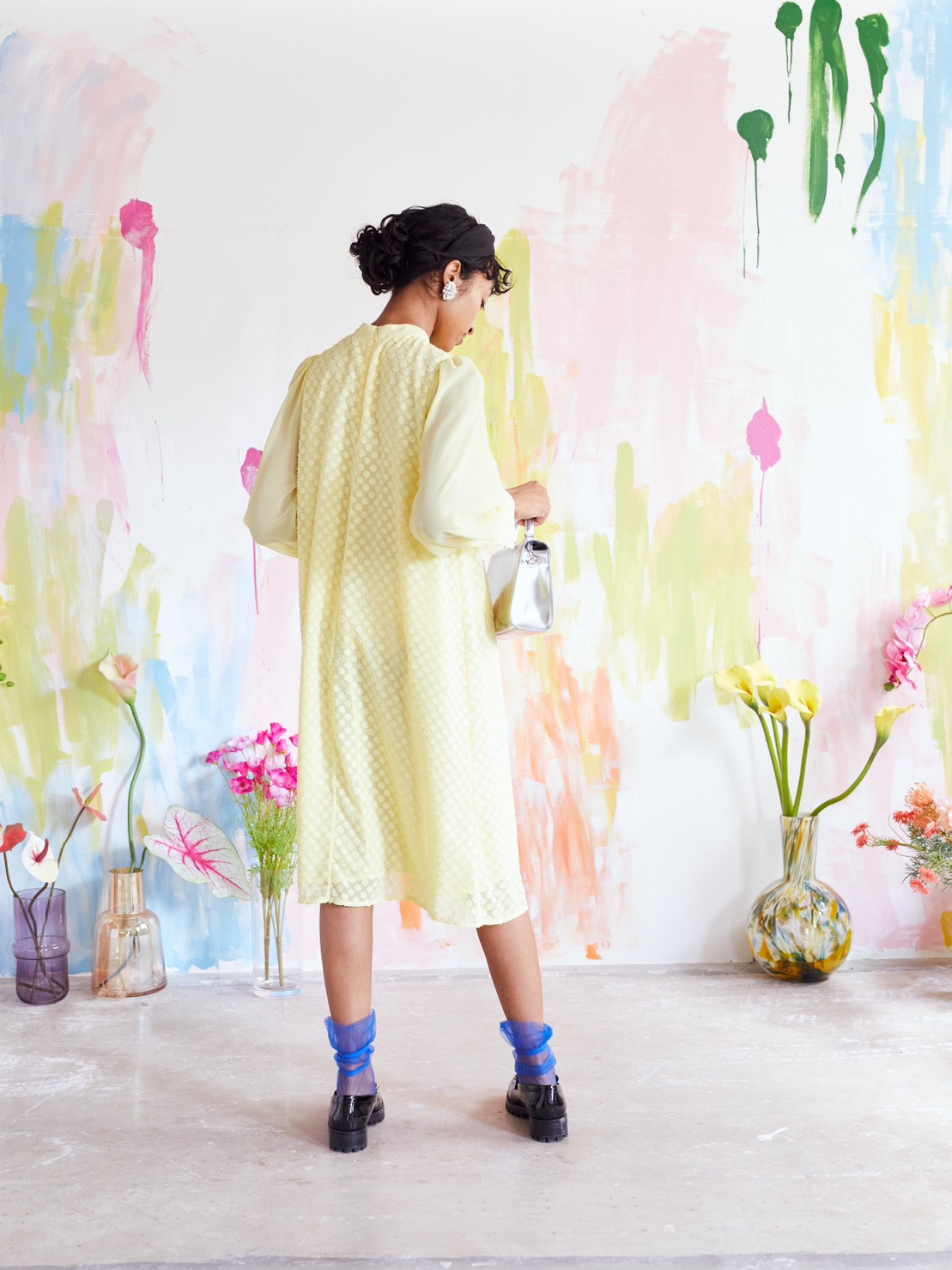 イエローシフォン素材ロングスリーブ膝丈ドレス