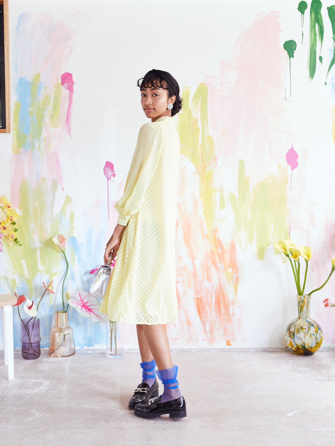 イエロー長袖ドレス。全体的にドット柄で可愛い印象です。