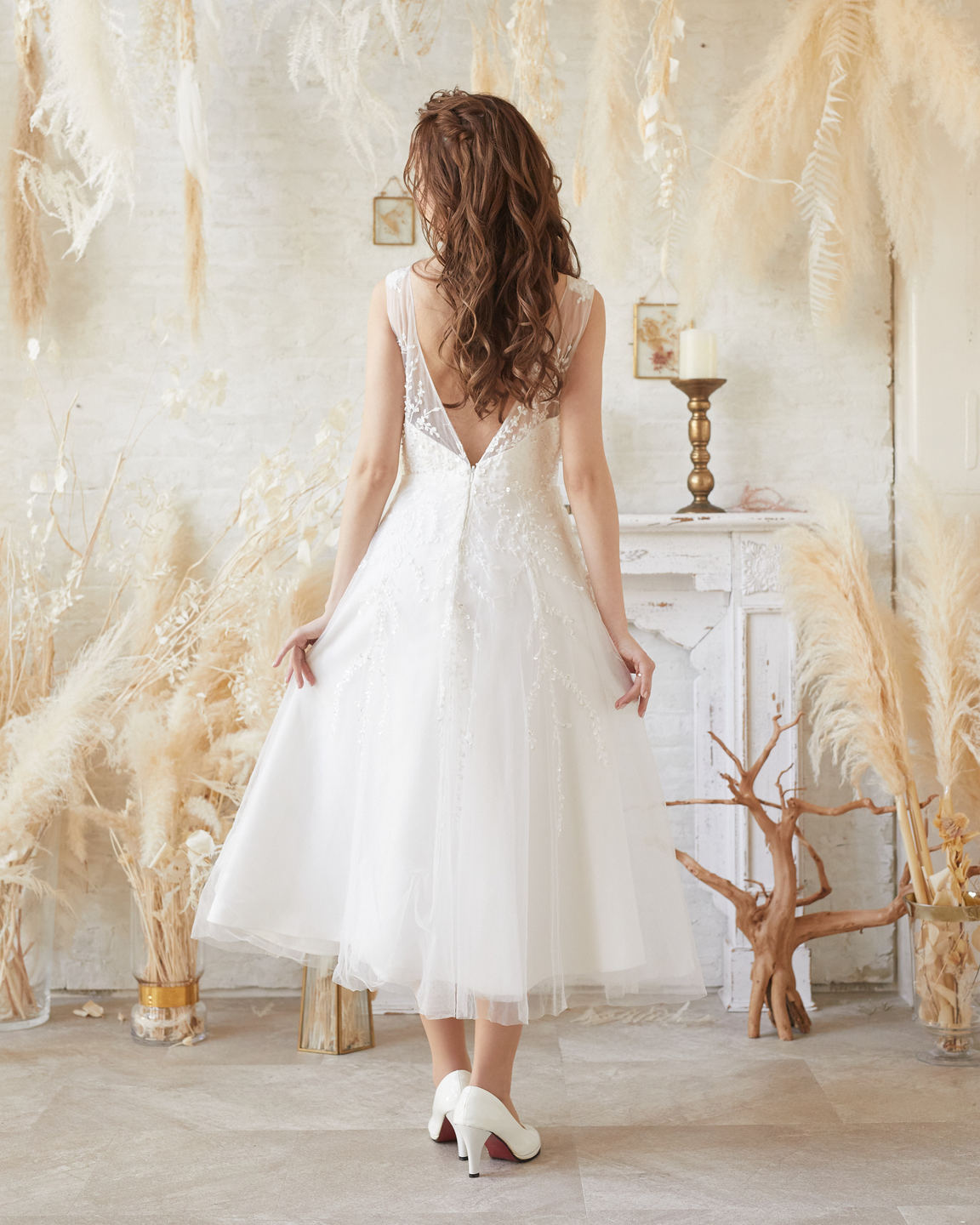 ホワイトビーズ刺繍ミモレ丈ノースリーブドレス