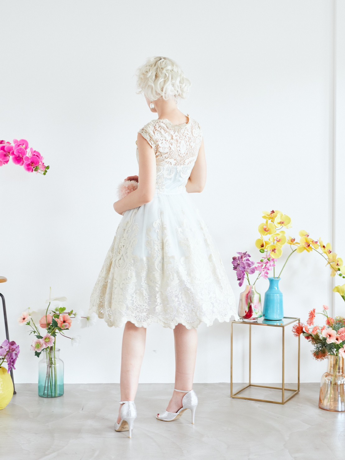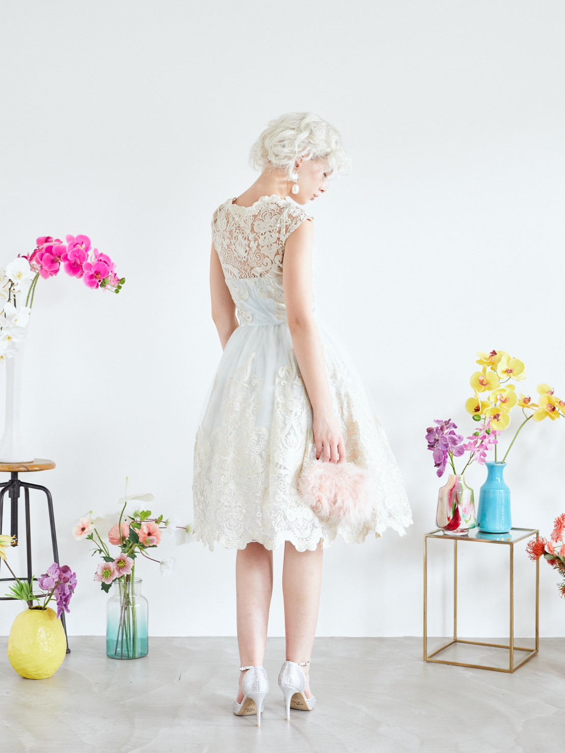 パステルブルーゴールド刺繍ショートスリーブ膝下ドレス