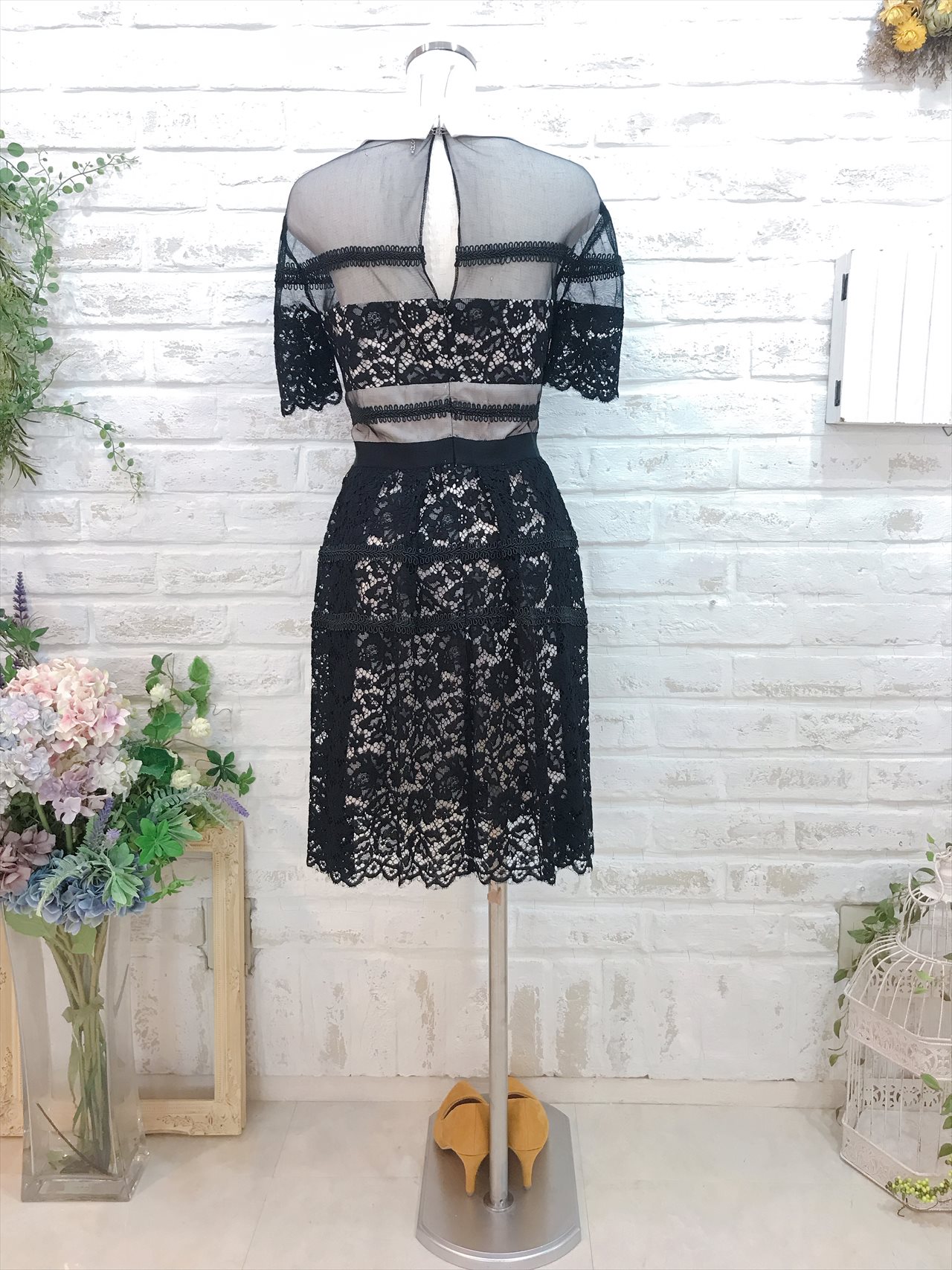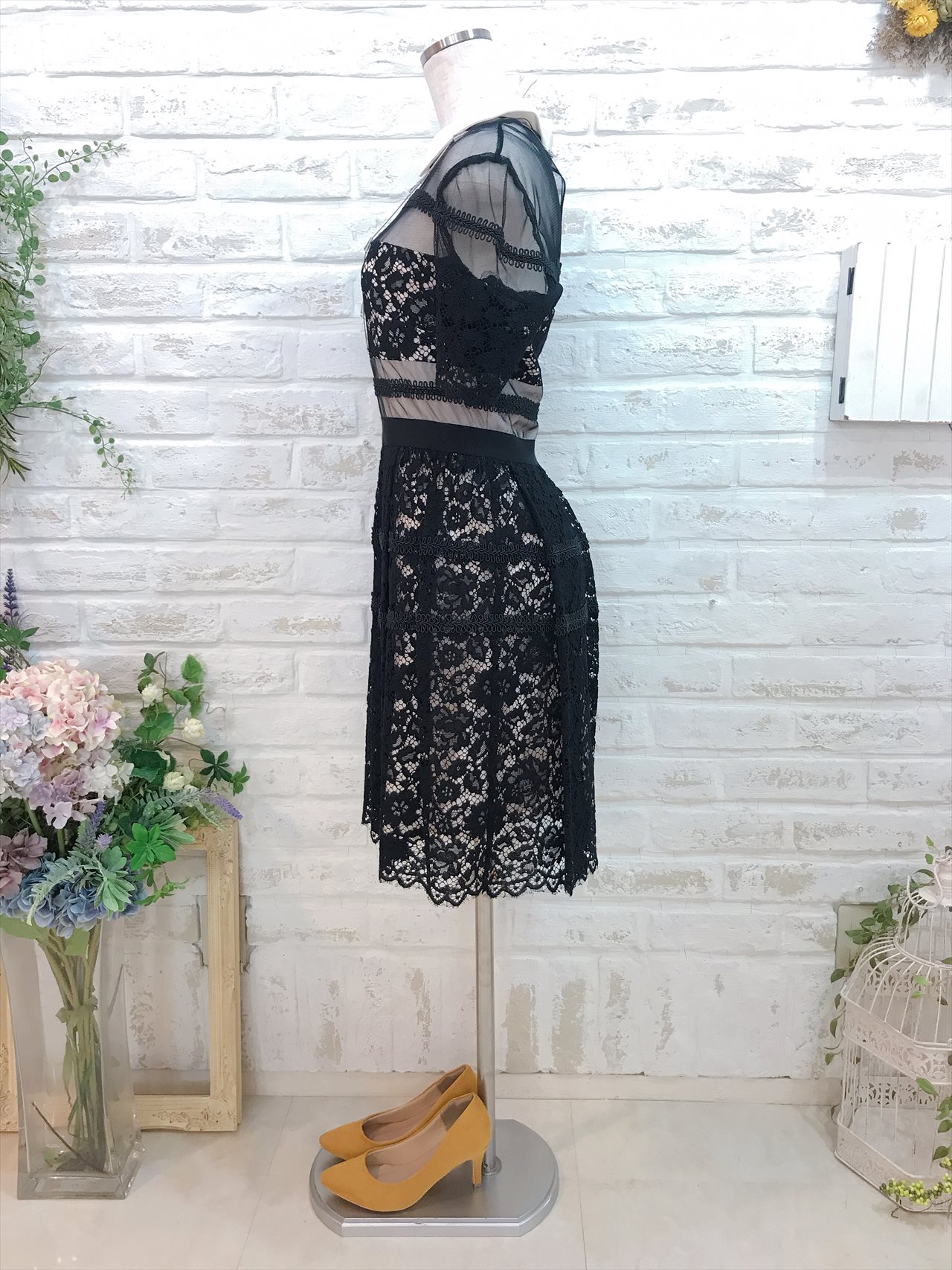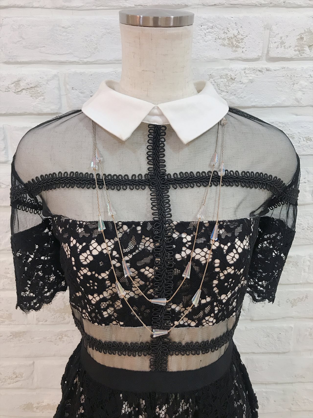ブラック袖ありドレス。デコルテ部分は透け感があり、オシャレな1着。小物に明るい色味で合わせてみました。