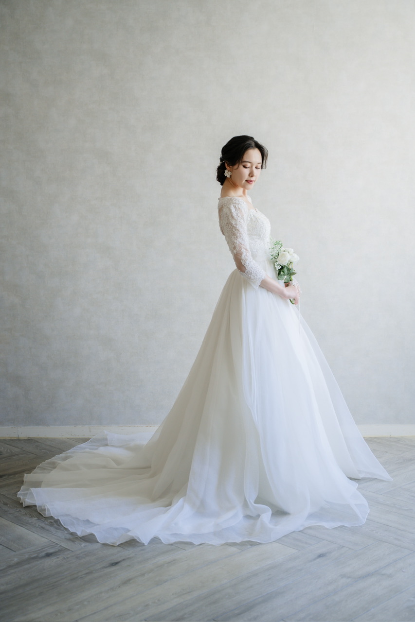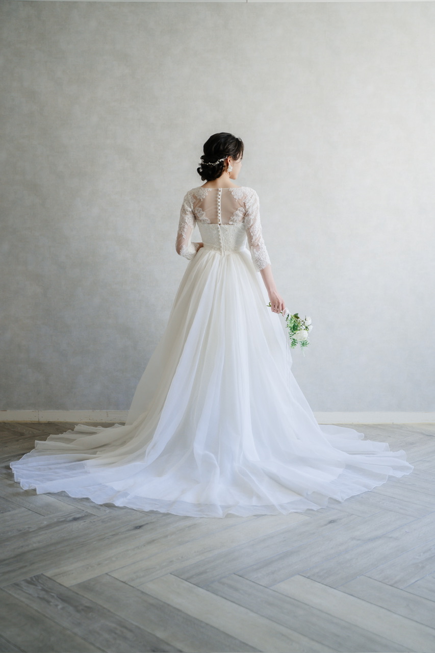 袖ありウェディングドレス。上がレースのプリンセスライン