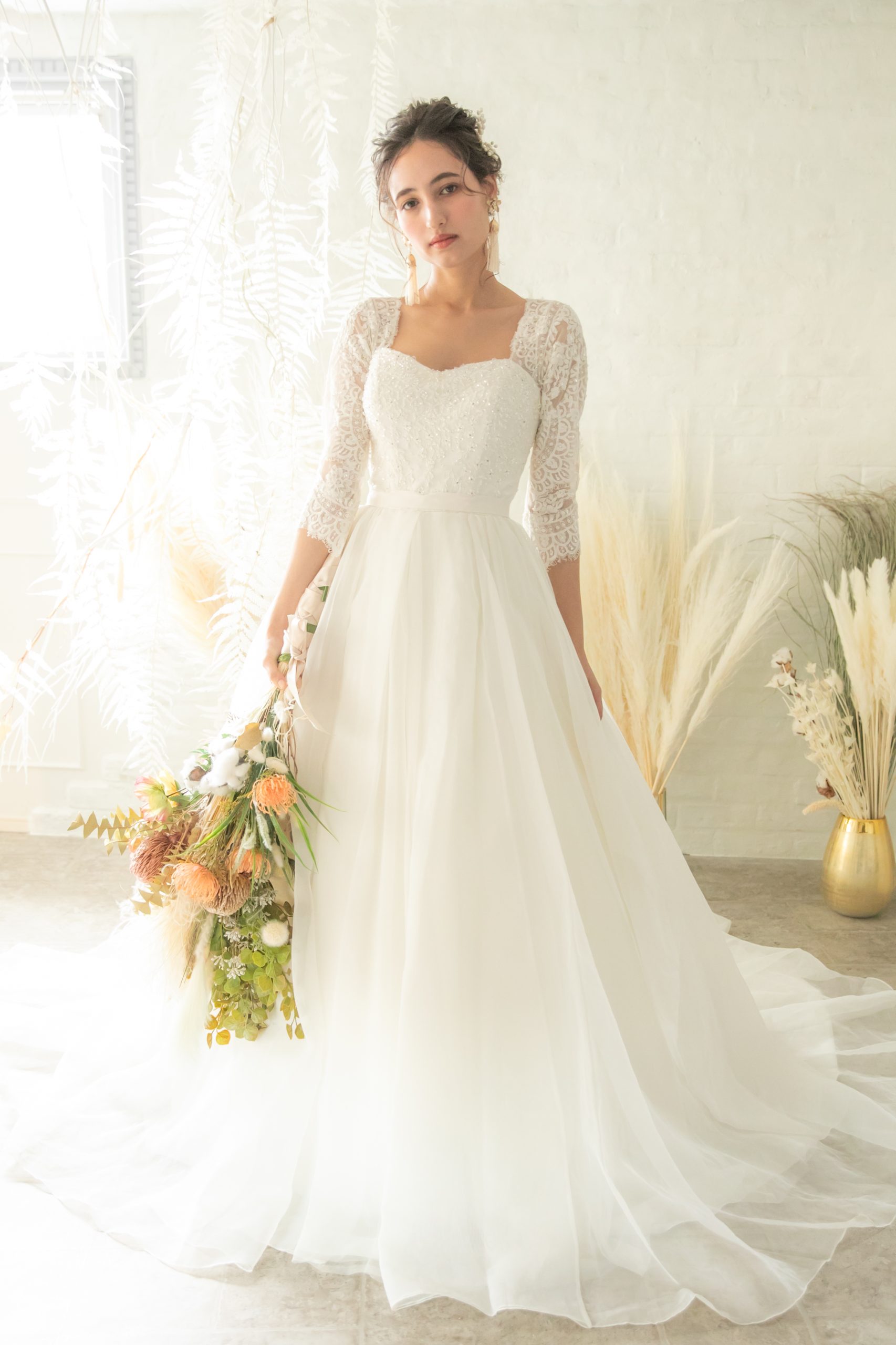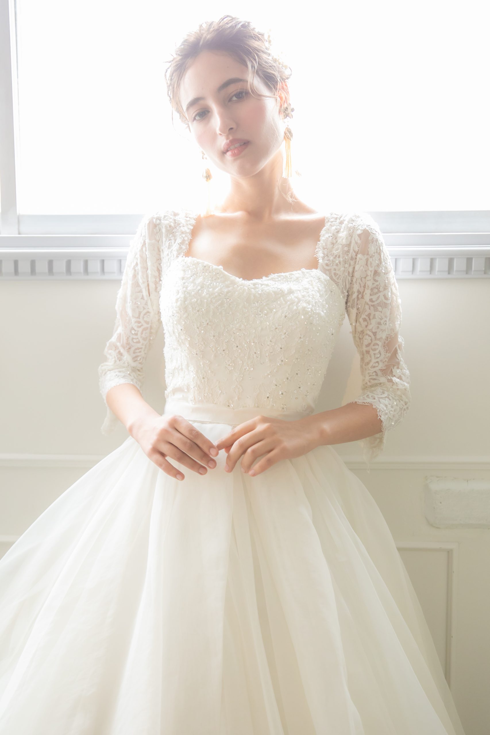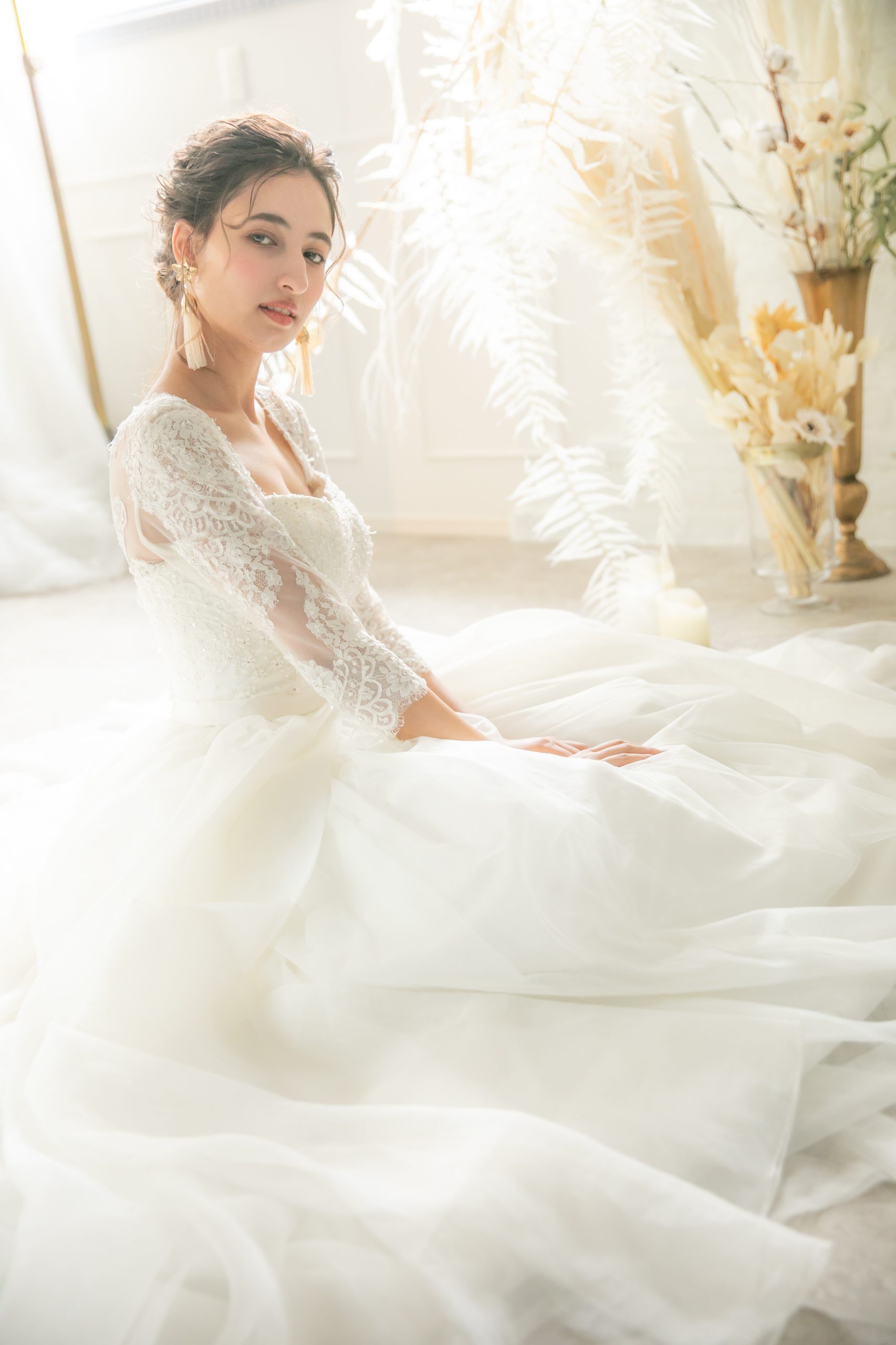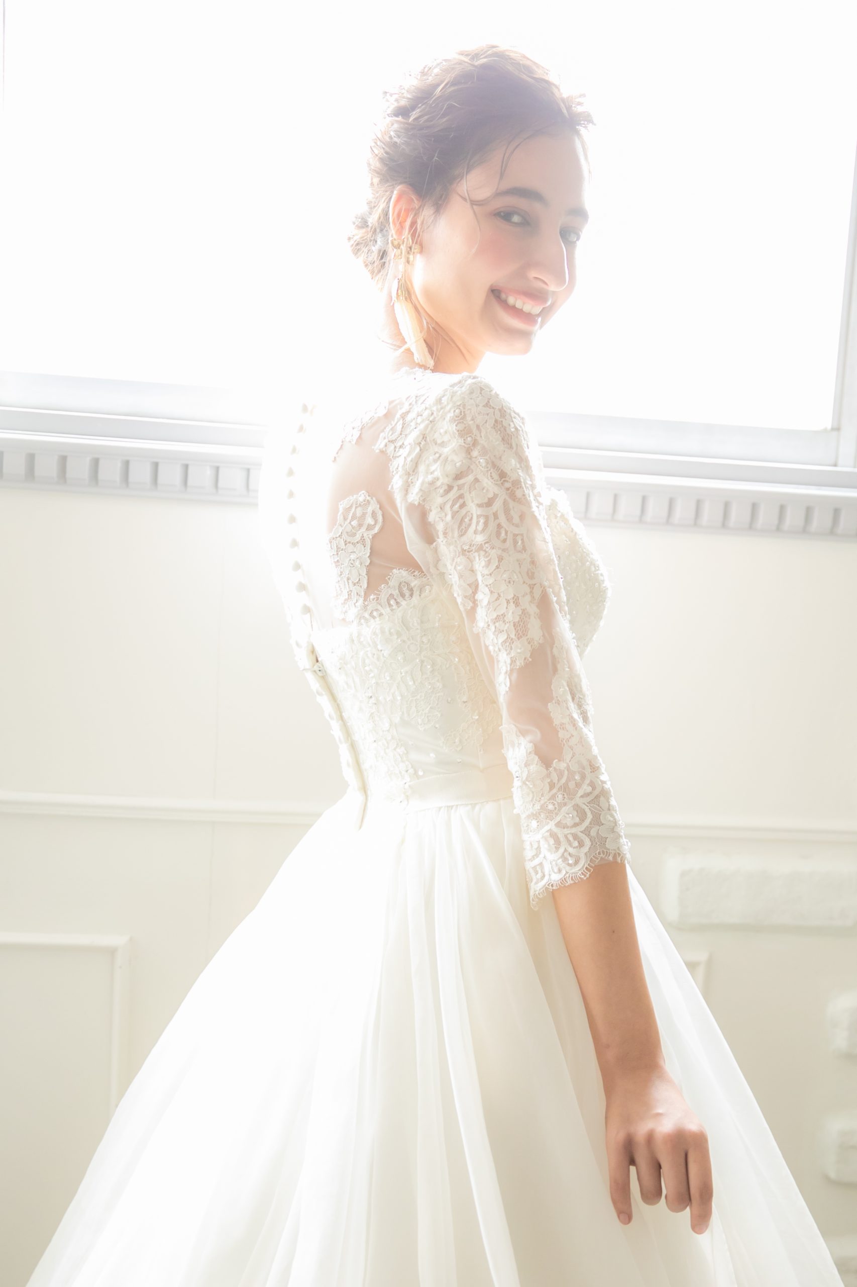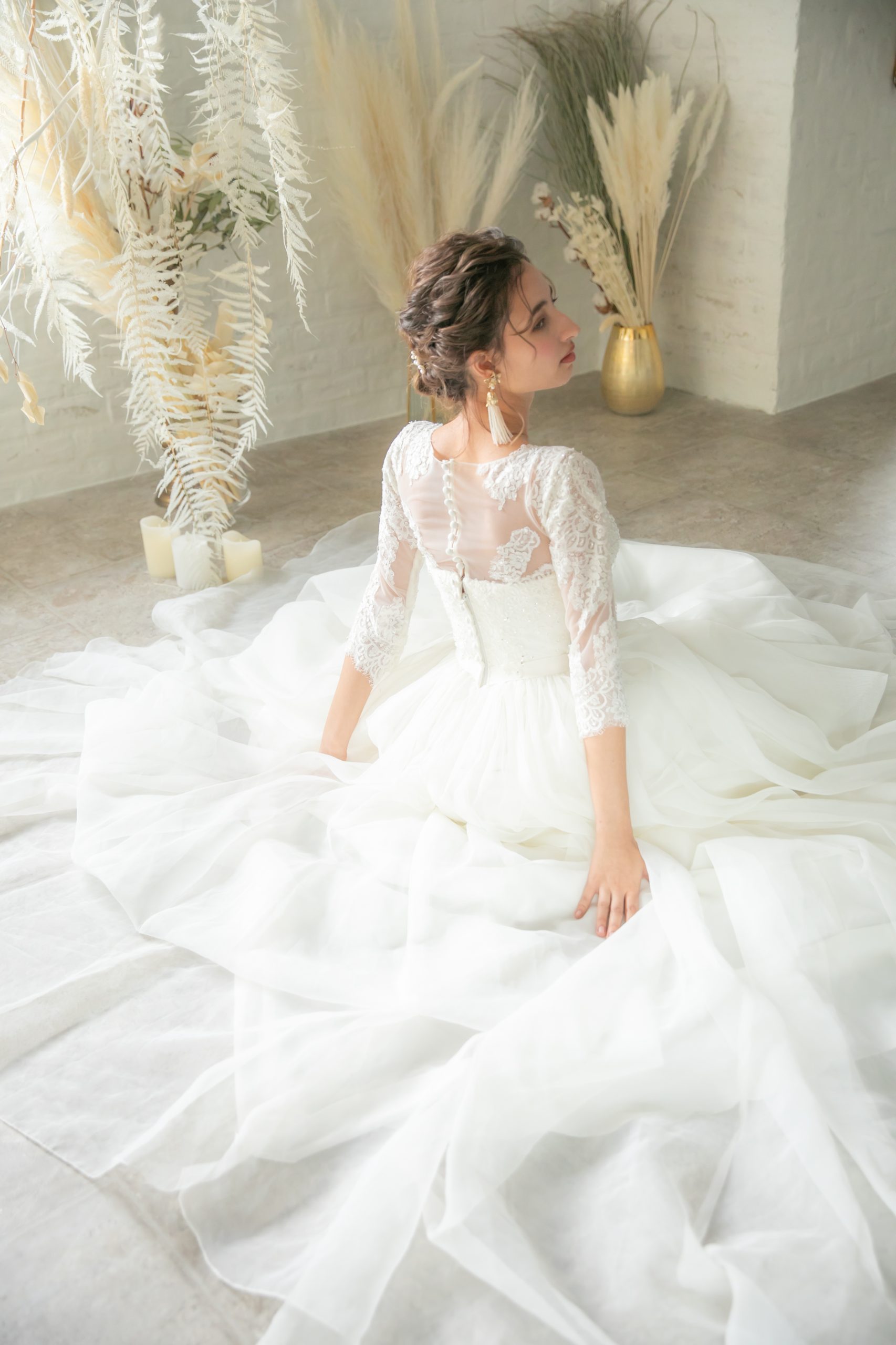 袖ありウェディングドレス。上がレースのプリンセスライン