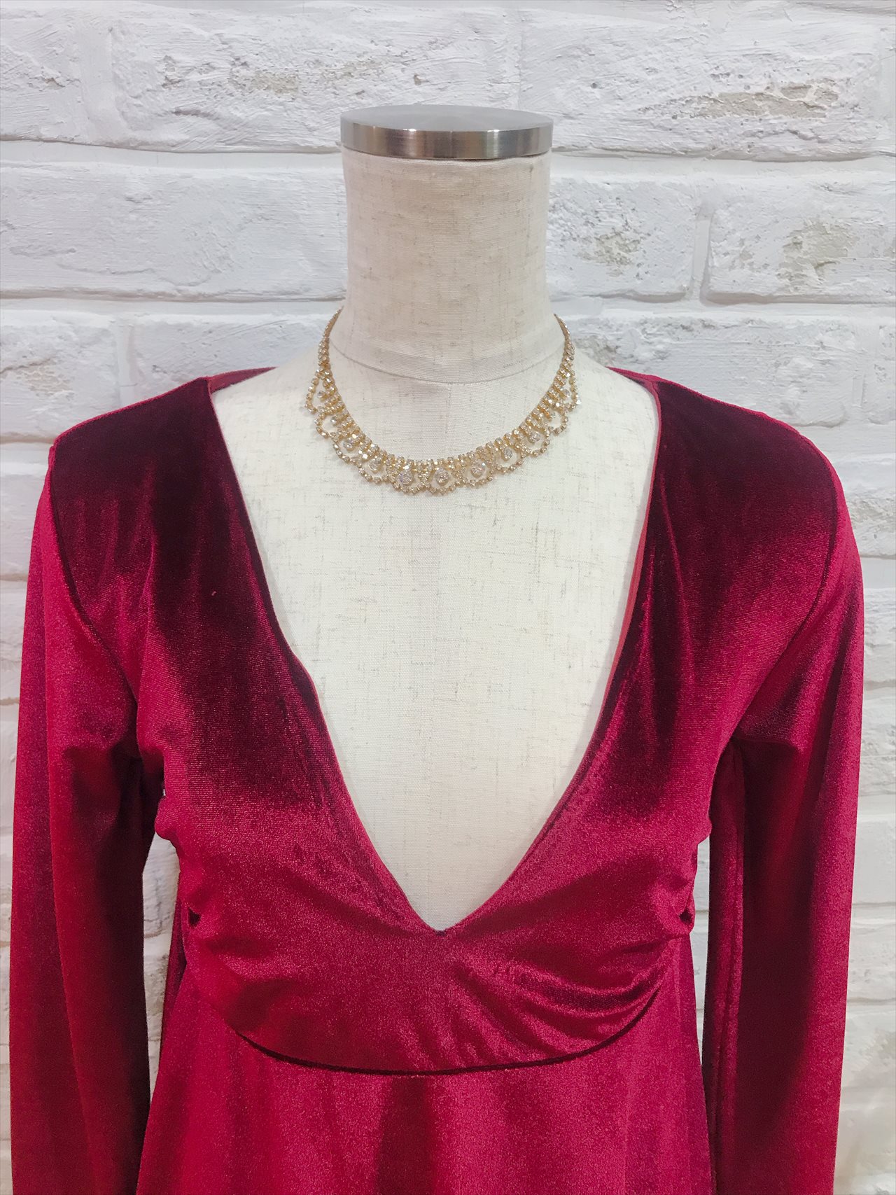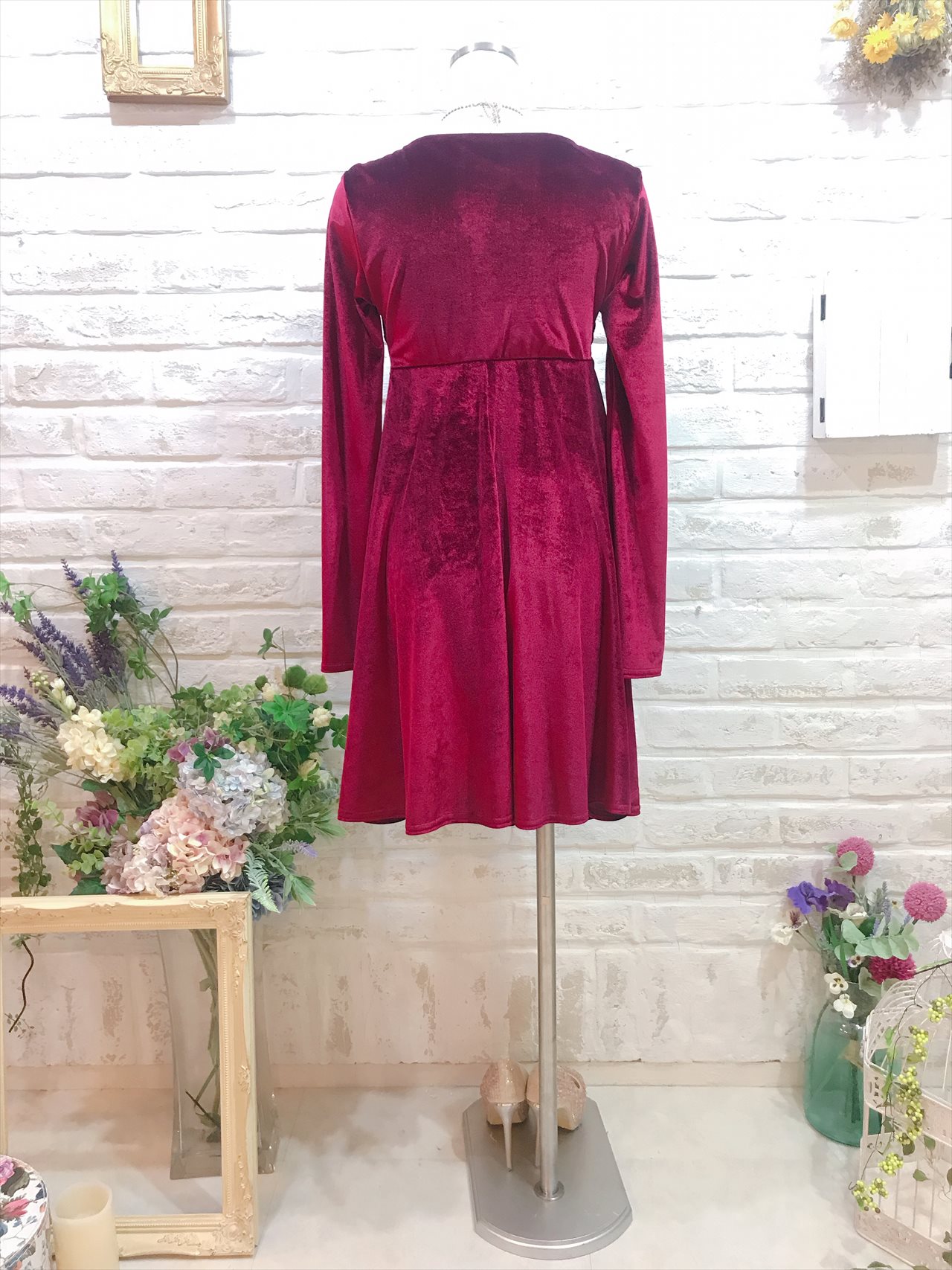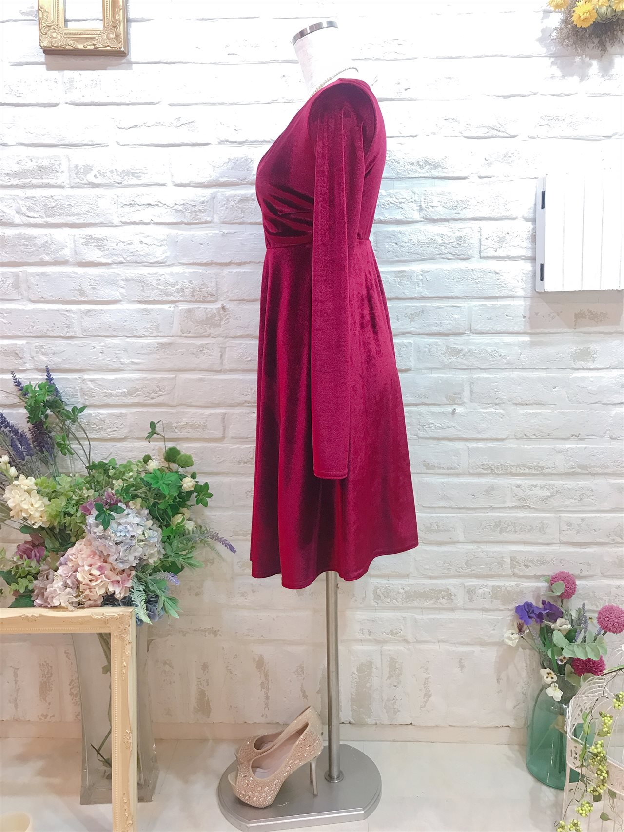 ボルドー長袖ワンピースドレス。ベロア素材が大人っぽいドレスです。