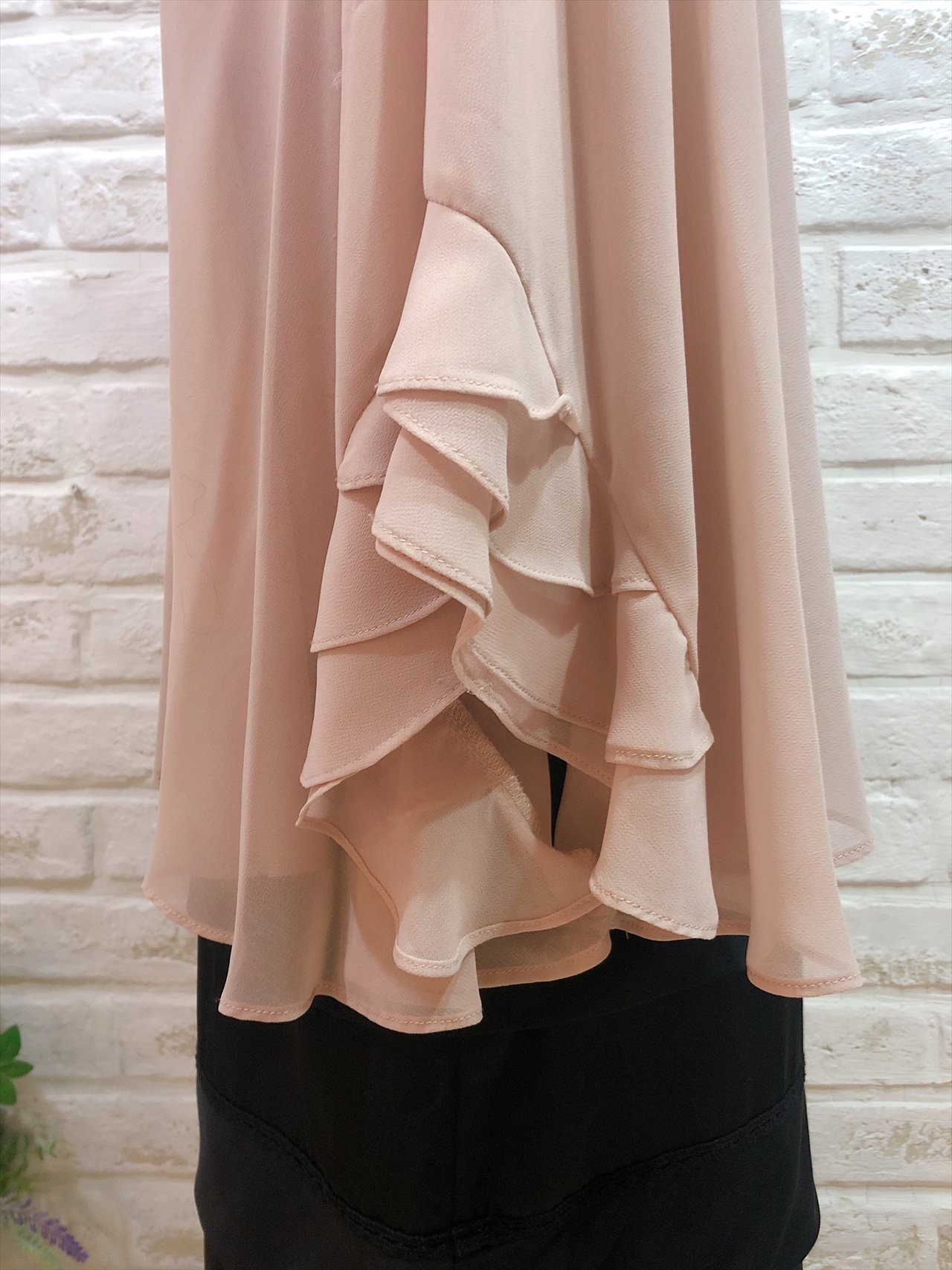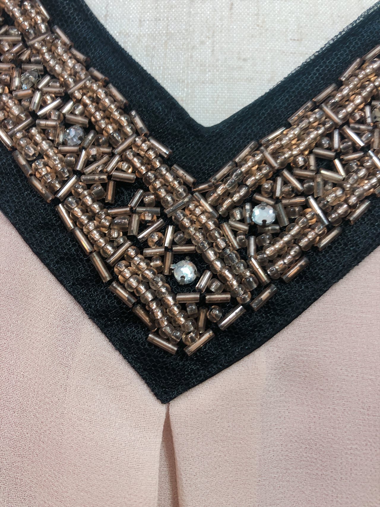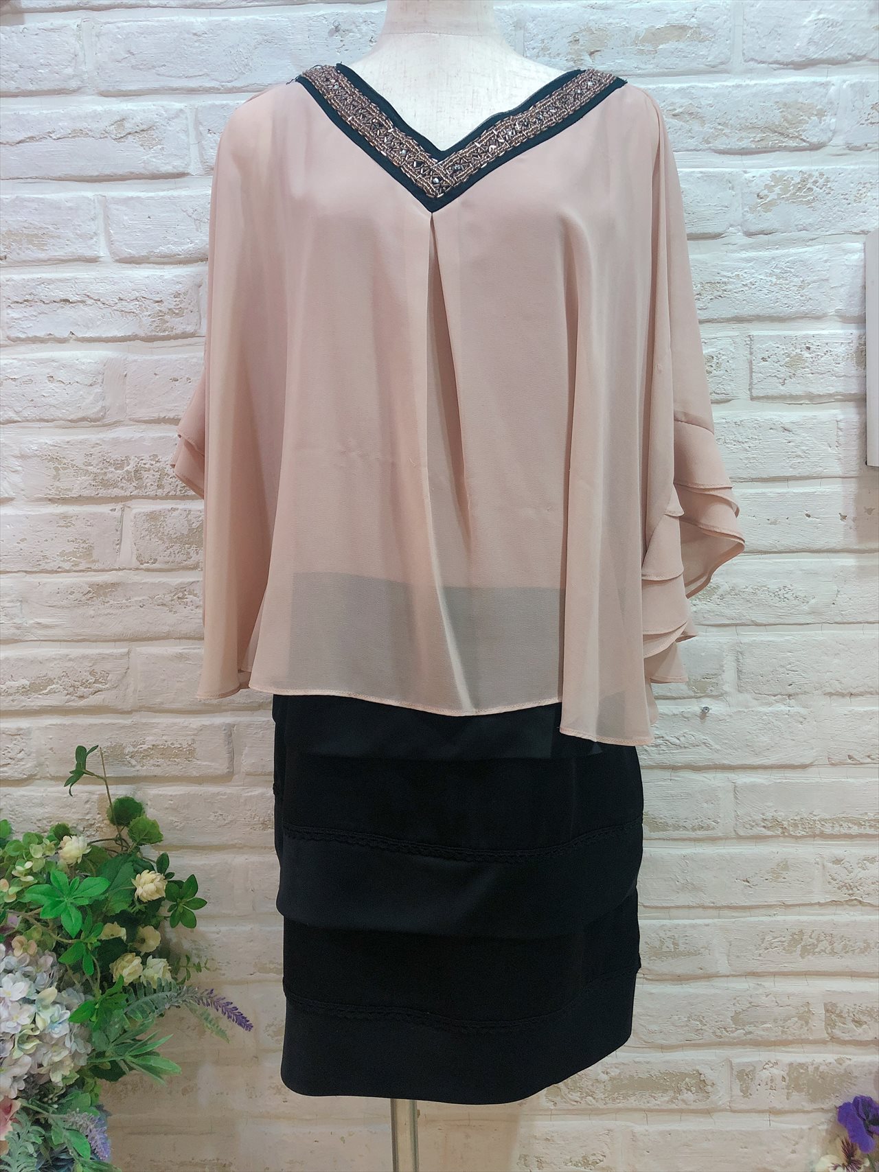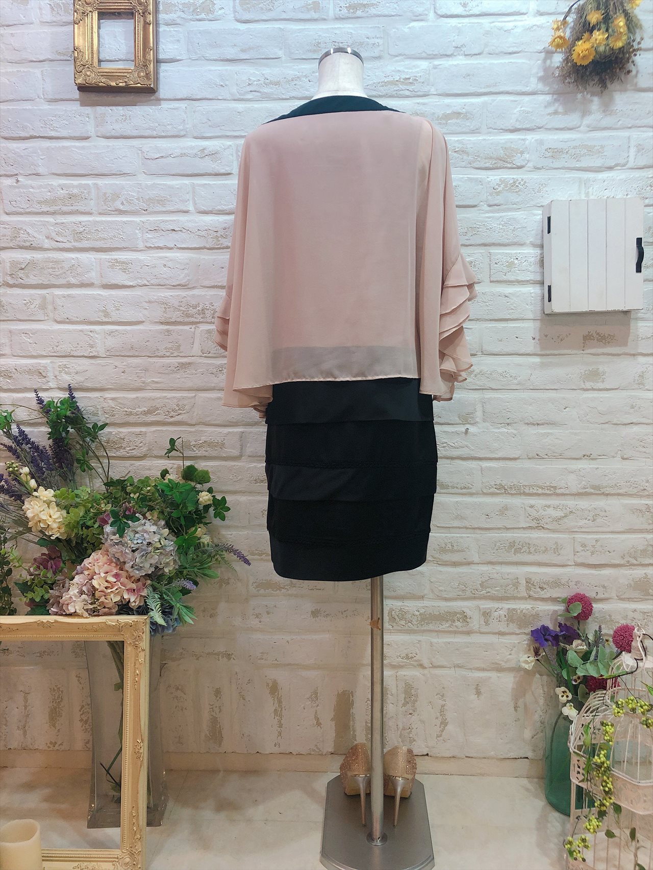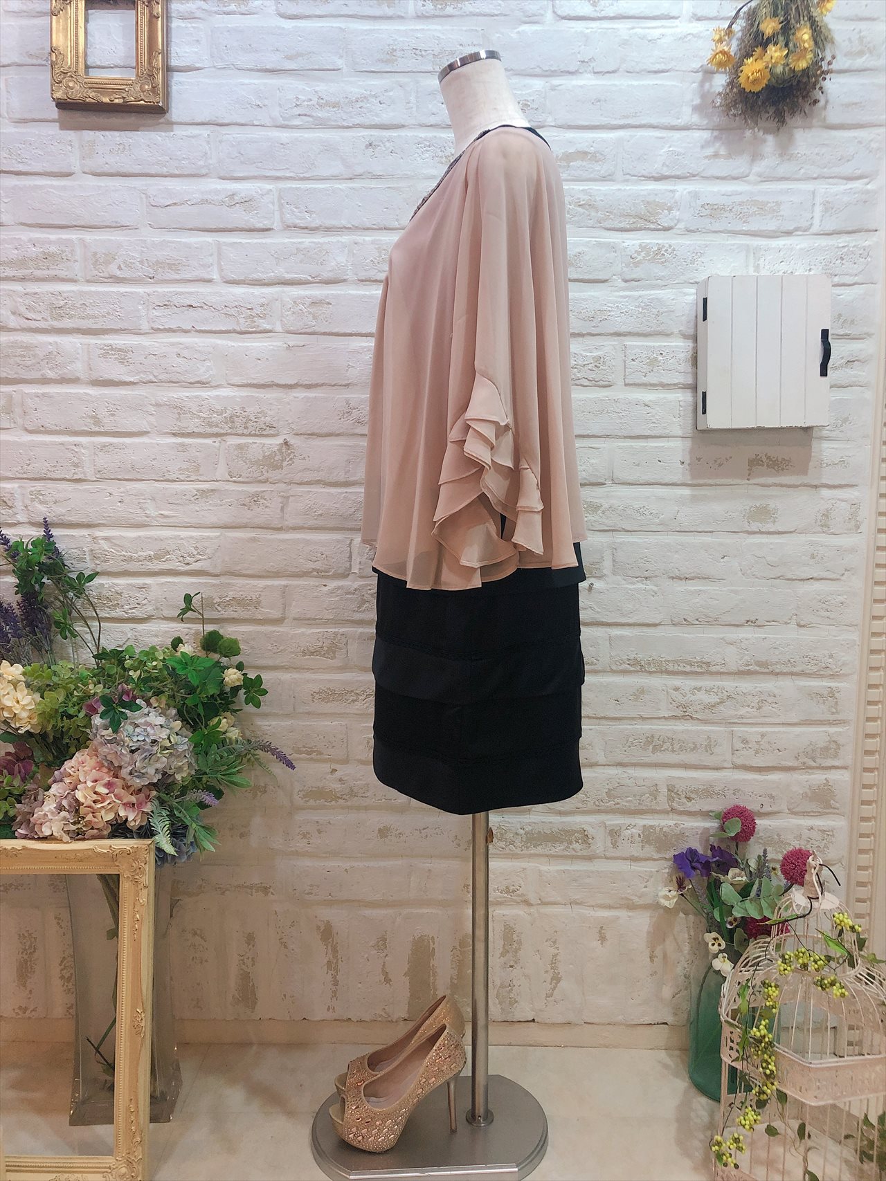 ベージュピンク×ブラック袖ありワンピースドレス。大人っぽいデザインです。