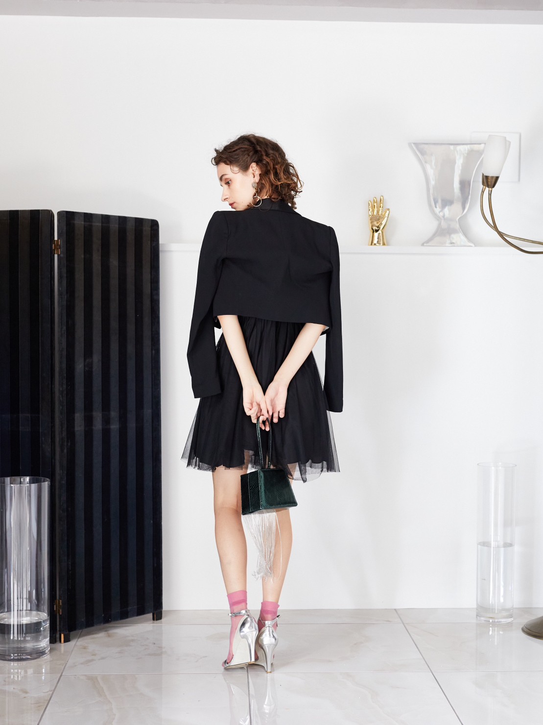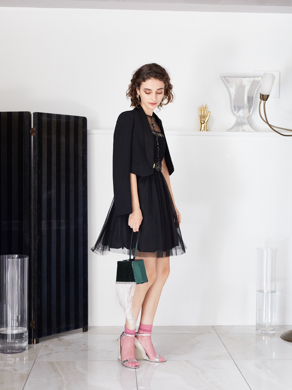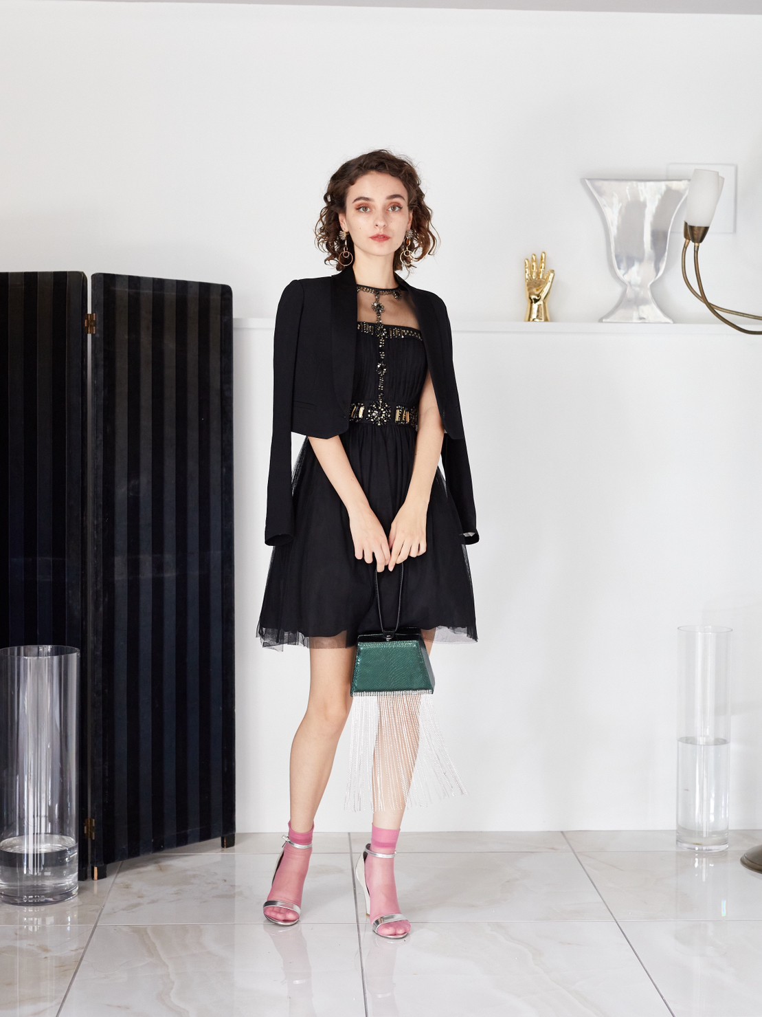 ブラックカラーの袖ありノースリーブ型ワンピースドレス。胸元がシースルー素材で透け感があり、セクシーな印象です。ビジュの装飾が首周り、バストライン、ウエストラインにほどこ施されていて華やかゴージャスです。小物に差し色を入れるとより華やかになります。