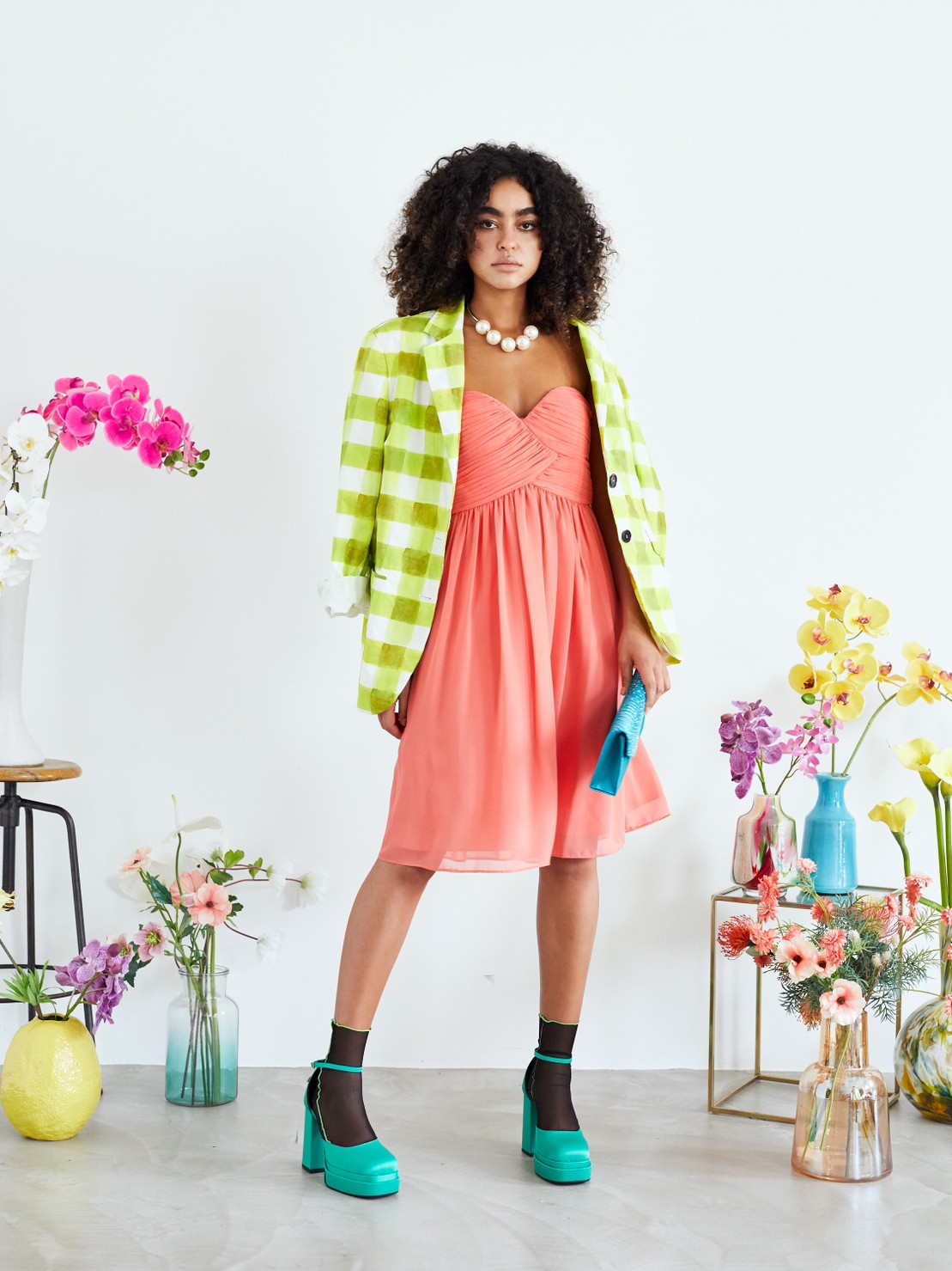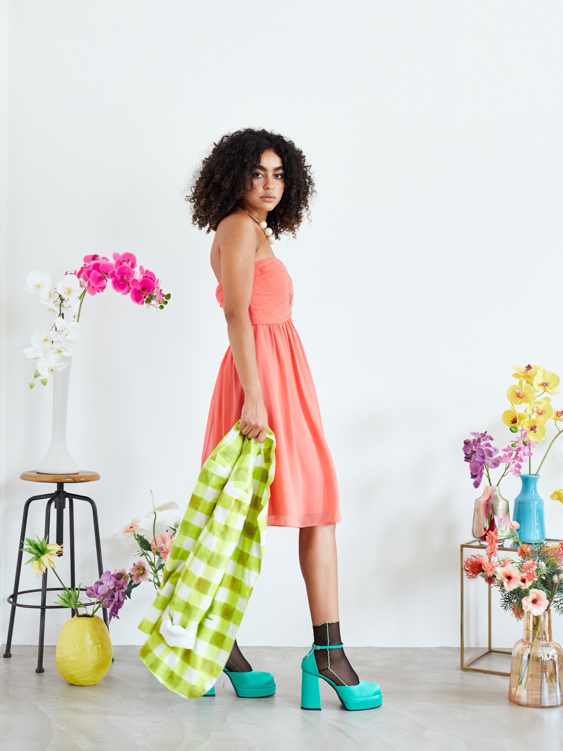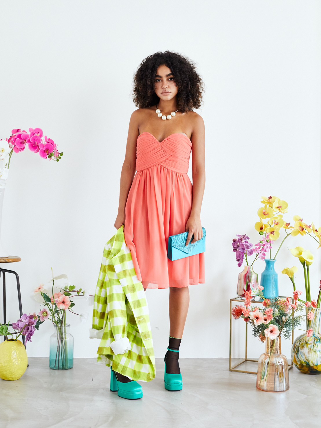 丈が長めが嬉しいコーラルカラーのドレス。胸元のカットがハートのような形になっており、シンプルではありますがありきたりではないセレクト感を醸し出す素敵なデザインです。バッグ&パンプスでは色使いを楽しむコーディネートもオススメです。