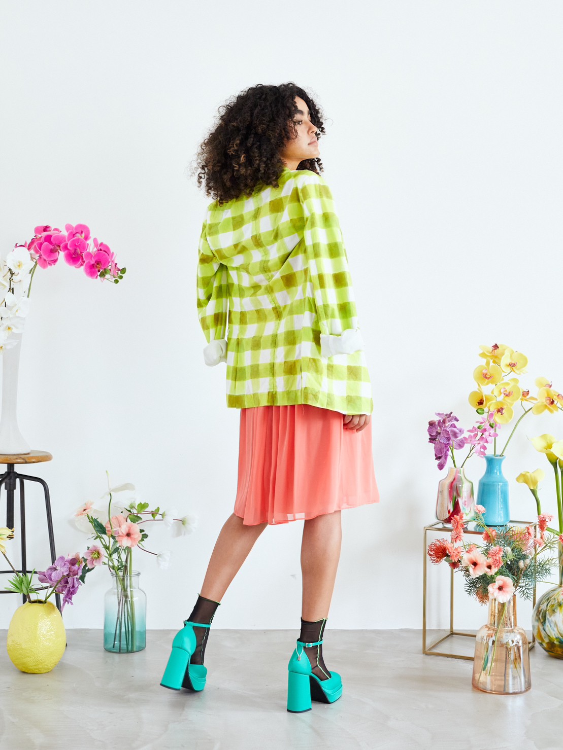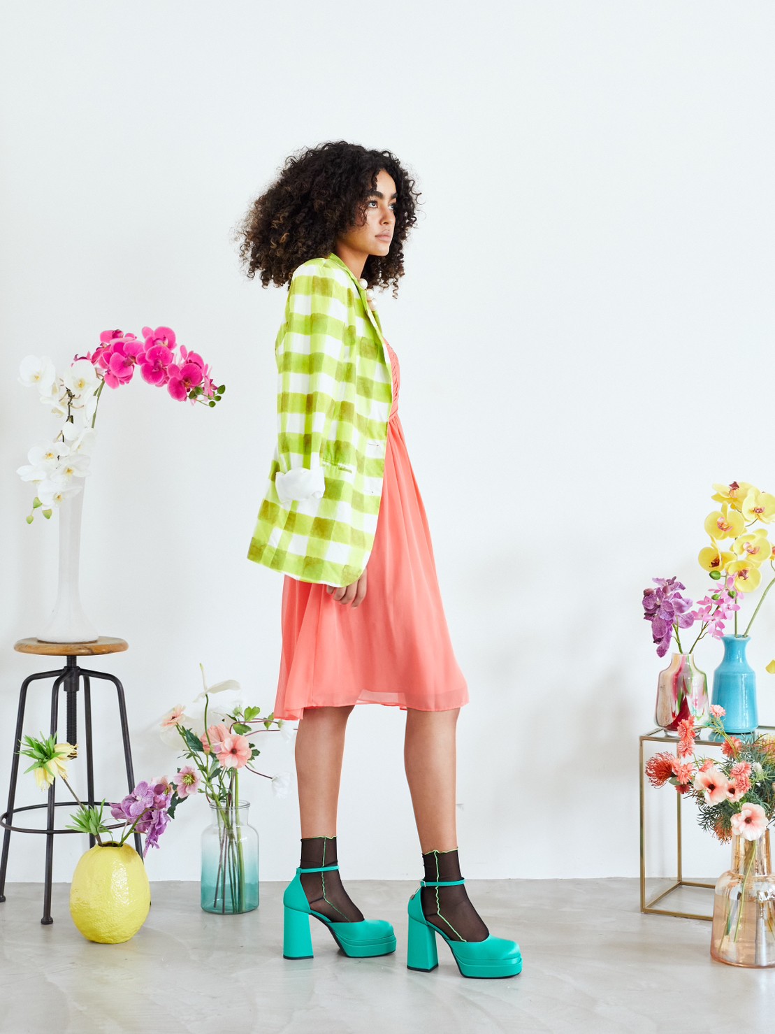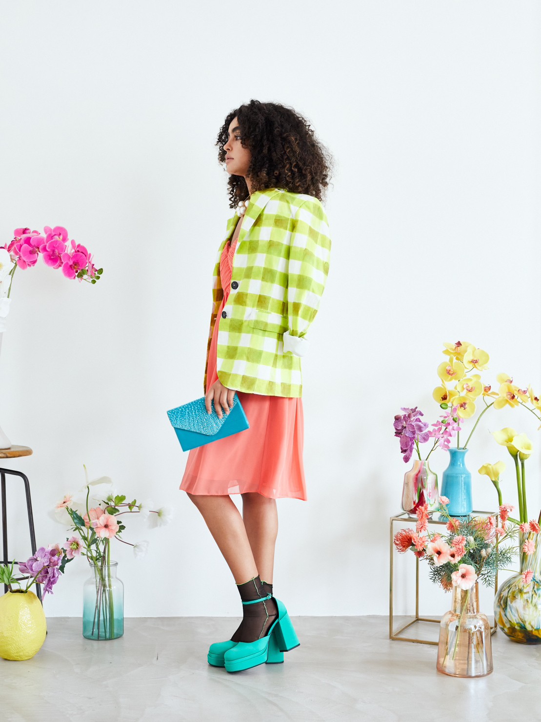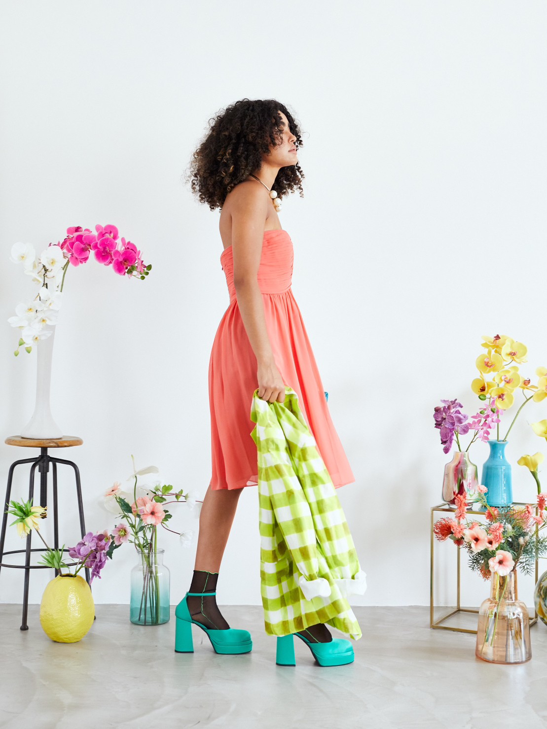 丈が長めが嬉しいコーラルカラーのドレス。胸元のカットがハートのような形になっており、シンプルではありますがありきたりではないセレクト感を醸し出す素敵なデザインです。バッグ&パンプスでは色使いを楽しむコーディネートもオススメです。